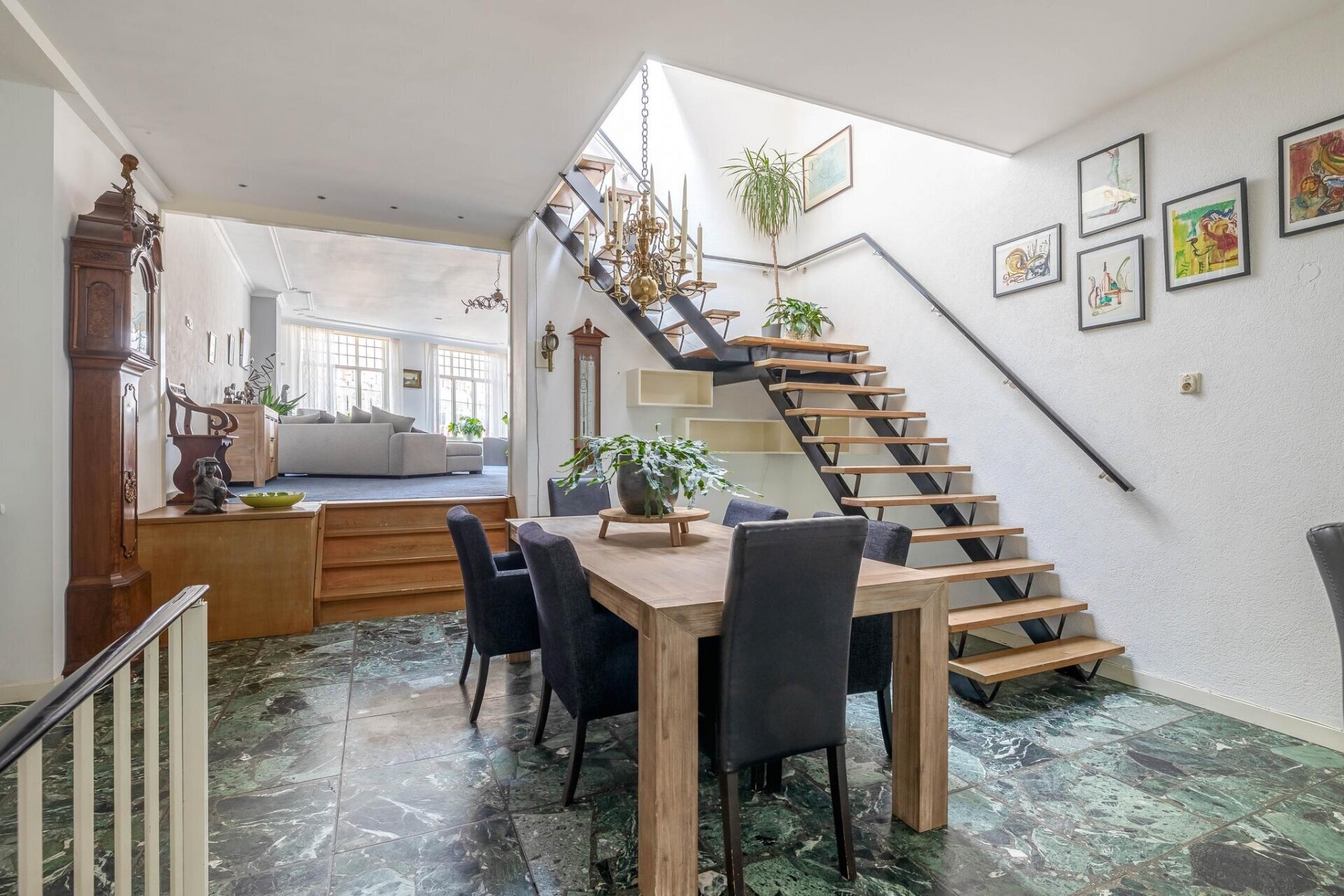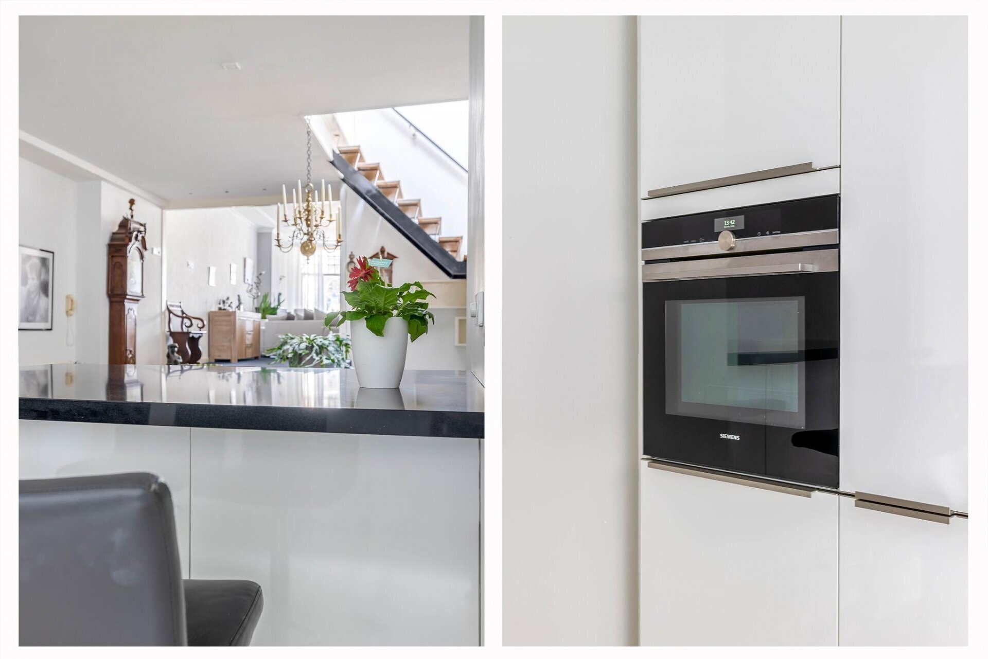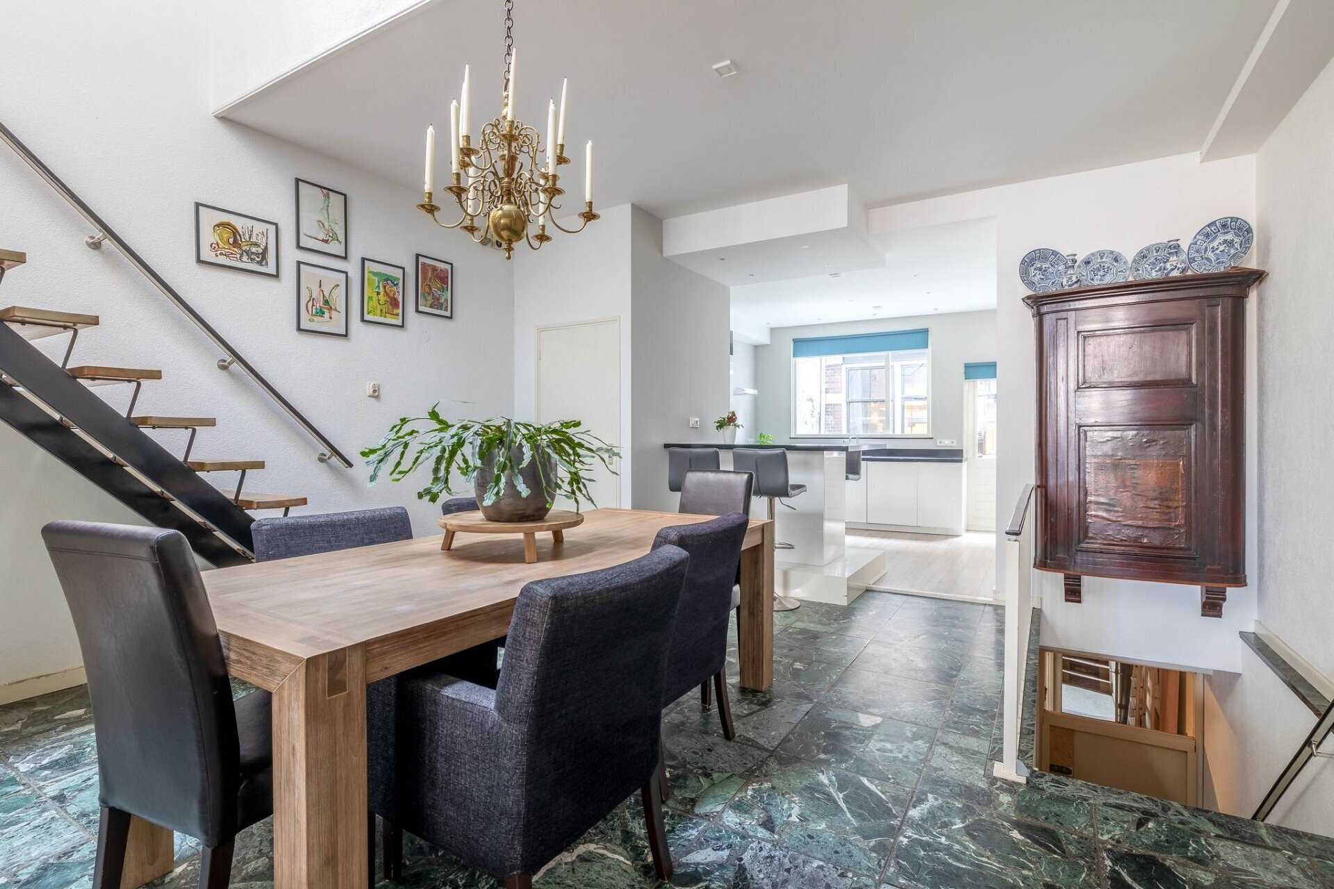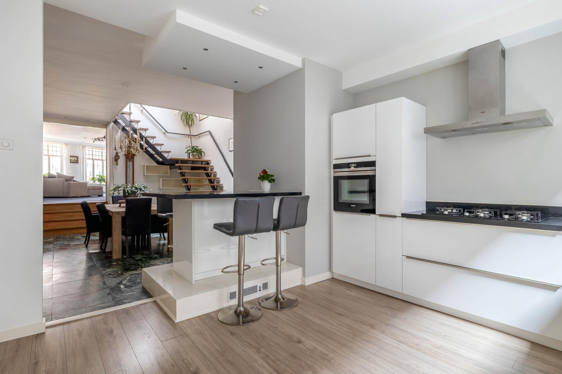 De grote woonkamer is voorzien van een gestuukt plafond, open haard en biedt schitterend zicht op het stadhuis. De woonkeuken (circa 2016) is geplaatst in een hoekopstelling en beschikt over een vaatwasser, 5-pits gaskookplaat op glas, afzuigkap, combi-oven, apothekerskast en een composiet werkblad. Er is een aparte koelcel (ingebouwd) aanwezig, evenals een werkkast met wasmachineaansluiting en een tweede werkkast. De eetkamer is voorzien van natuursteen en geniet extra lichtinval via een vide. Tevens bevindt zich hier een tweede toilet.