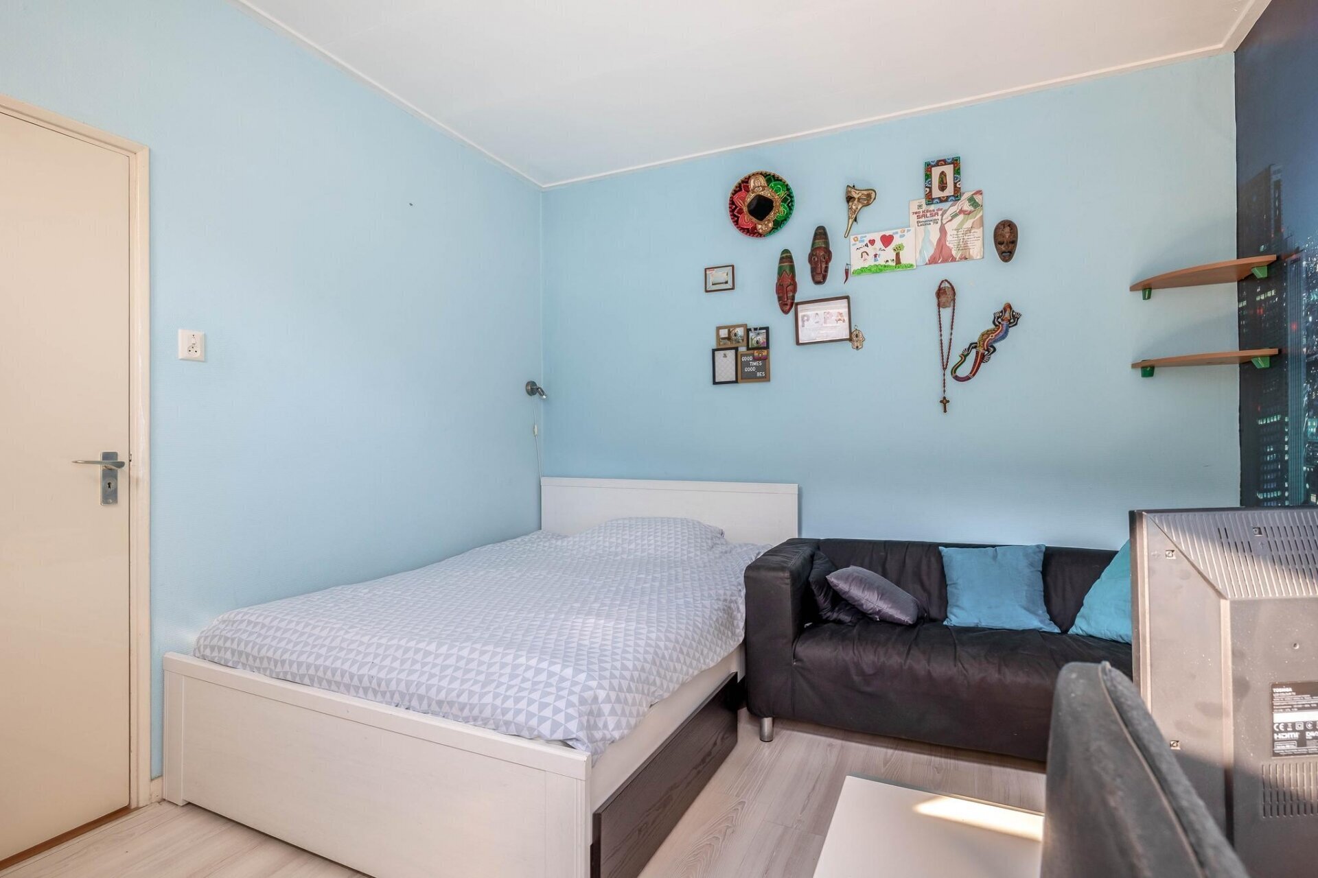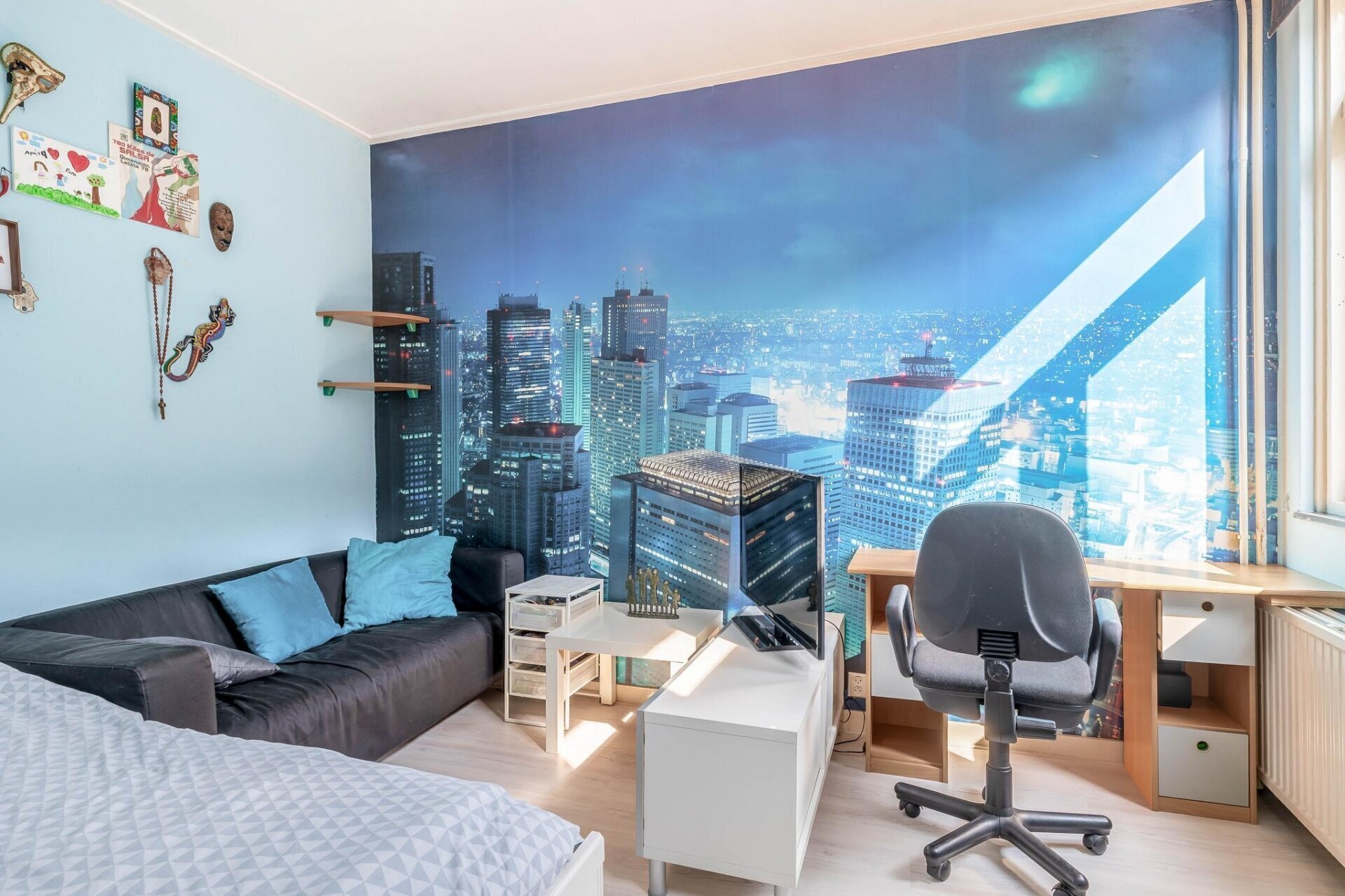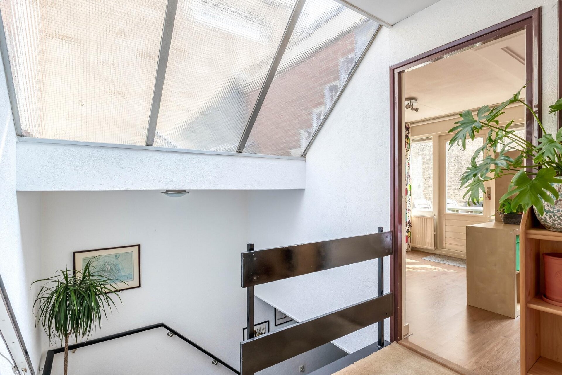 Ruime overloop, separaat toilet, doucheruimte en een vaste kastenwand. Er zijn drie slaapkamers, waarvan één (voorheen twee kamers) toegang heeft tot het terras. De andere slaapkamers hebben laminaatvloeren en één kijkt uit op het stadhuis. De badkamer beschikt over een groot ligbad en een wastafelmeubel.