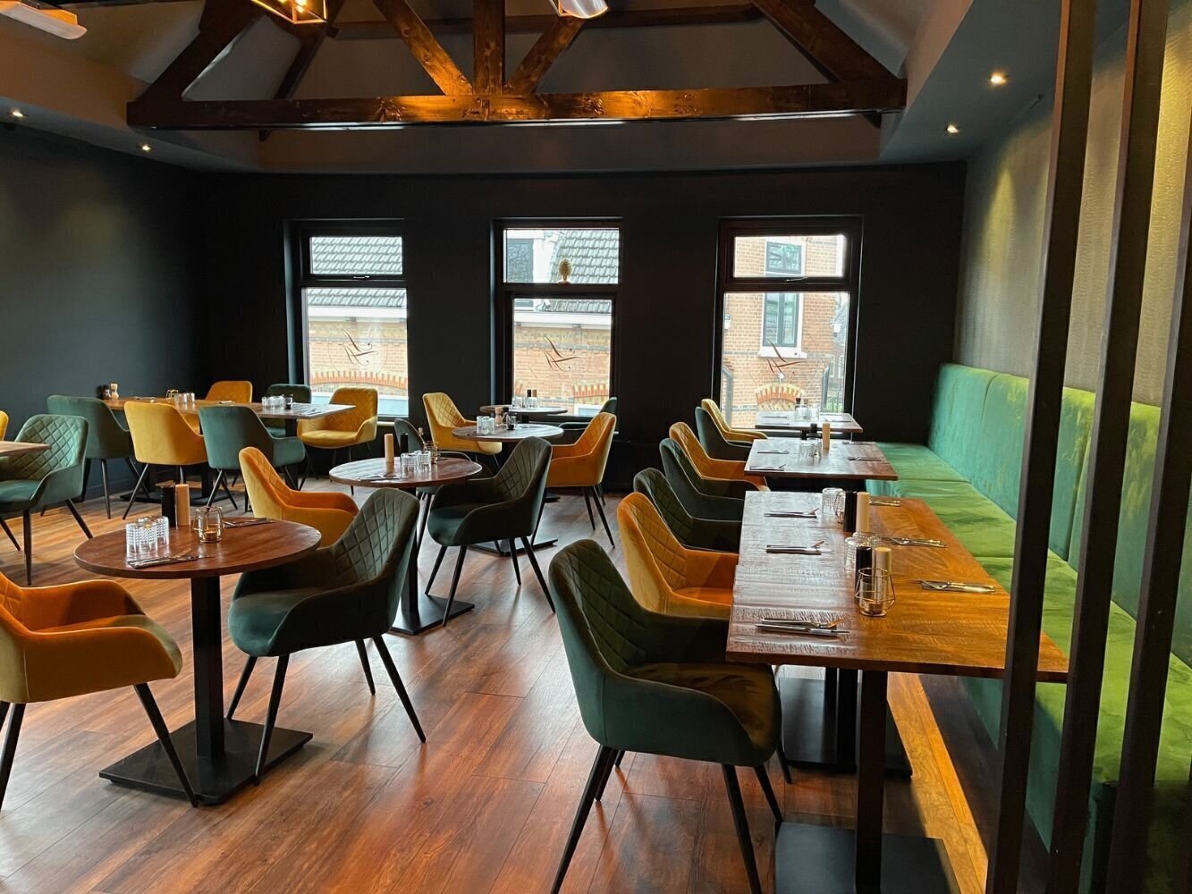 Op een kleine verhoging bevindt zich het restaurantgedeelte, met ruimte voor circa 50 zitplaatsen met zicht op de sfeervolle sint Jorisstraat. Ook hier is de inrichting smaakvol en zorgvuldig verzorgd. Op de eerste verdieping is er nog ruimte voor ca. 55 zitplaatsen waarvan het originele plafond in zijn oude glorie is hersteld. Alle voorzieningen voldoen aan de strenge eisen van deze tijd.