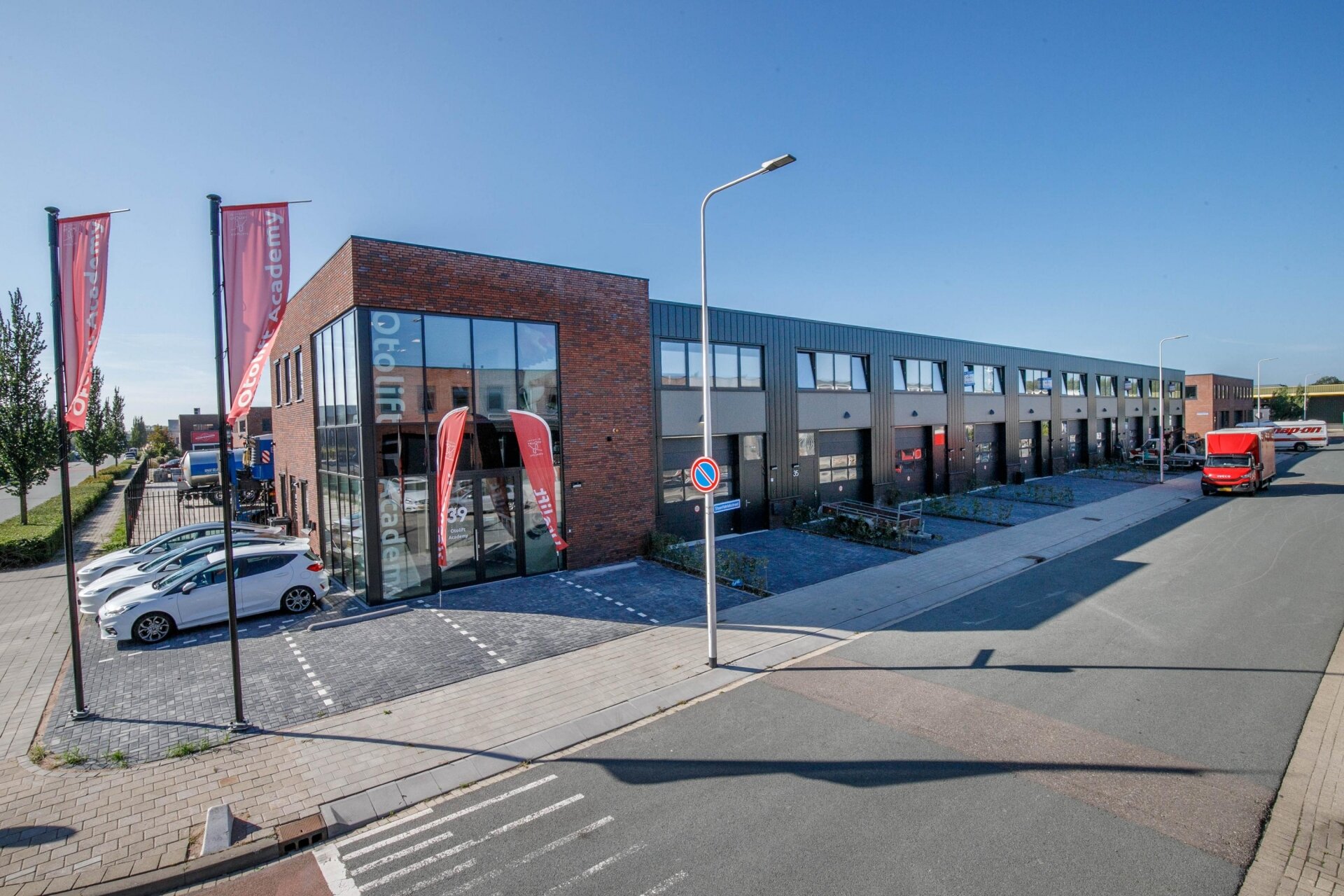 Parkeren dient voor de unit te gebeuren. Er zijn 2 exclusieve parkeerplaatsen per bedrijfsunit beschikbaar en 5 exclusieve parkeerplaatsen voor de kantoorunit beschikbaar.