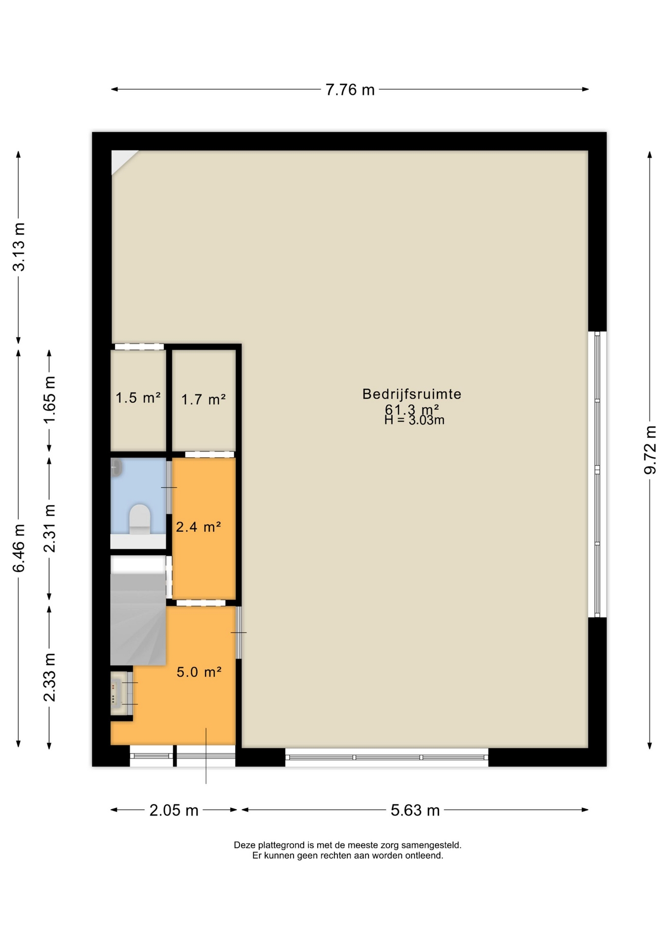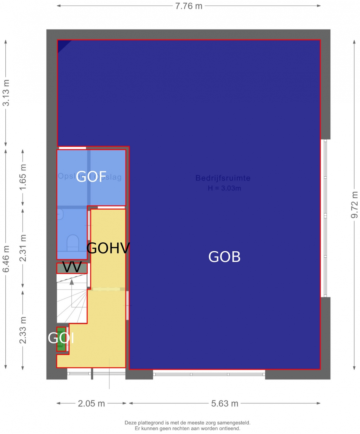 Bedrijfsruimte van circa 80 m² geschikt voor gebruik als kantoor, magazijn en/of werkplaats. De ruimte is vrij indeelbaar en voorzien van een entree, hal met toilet, open trap naar de verdieping en toegang tot de bedrijfsruimte.