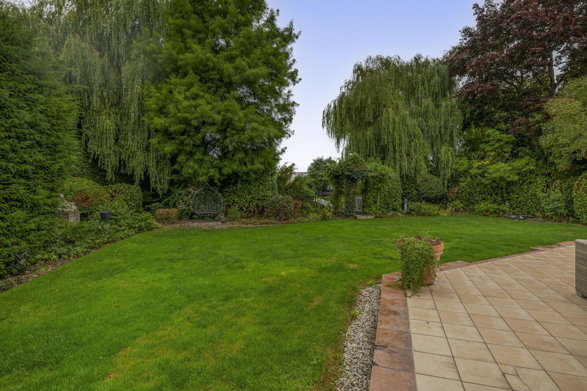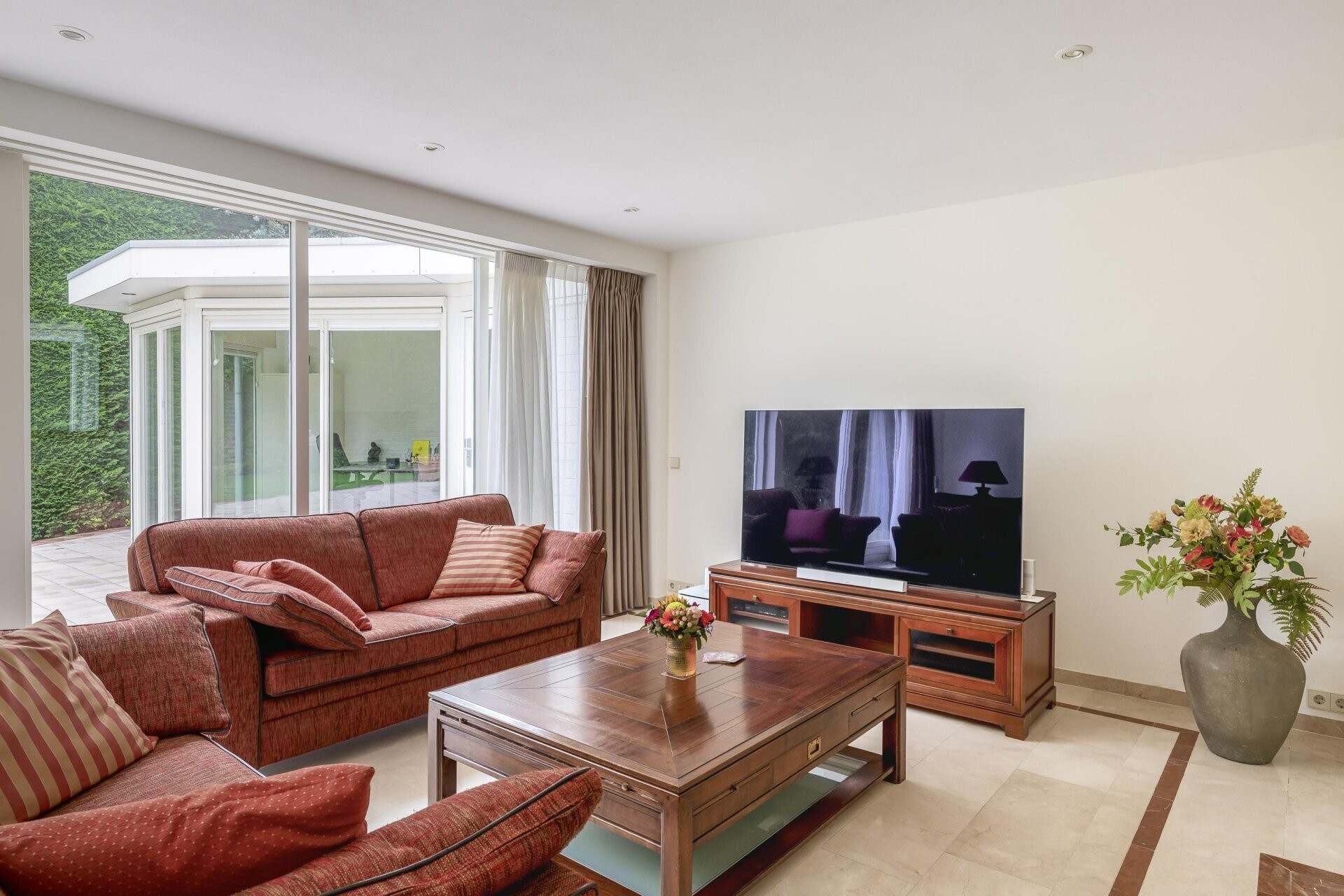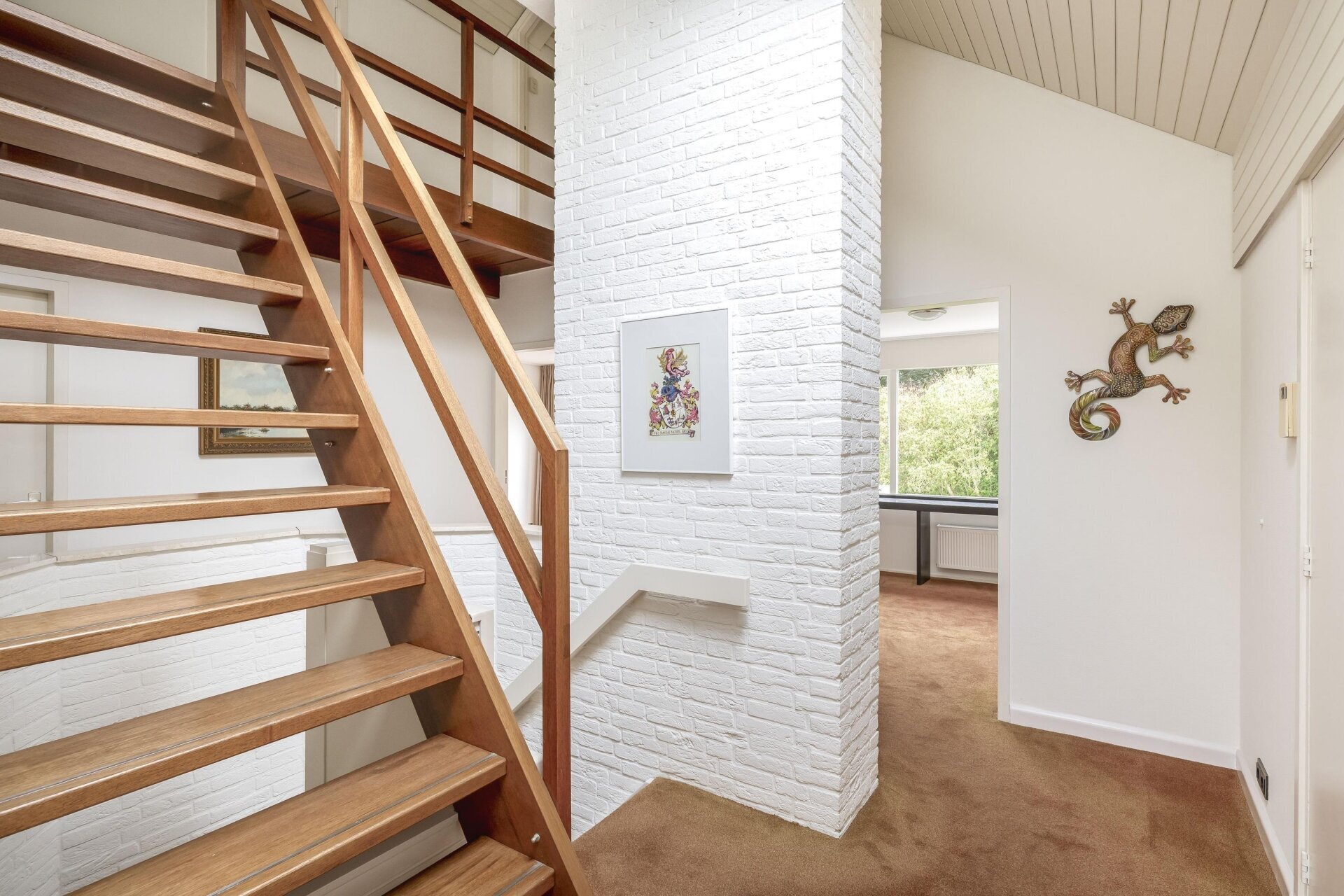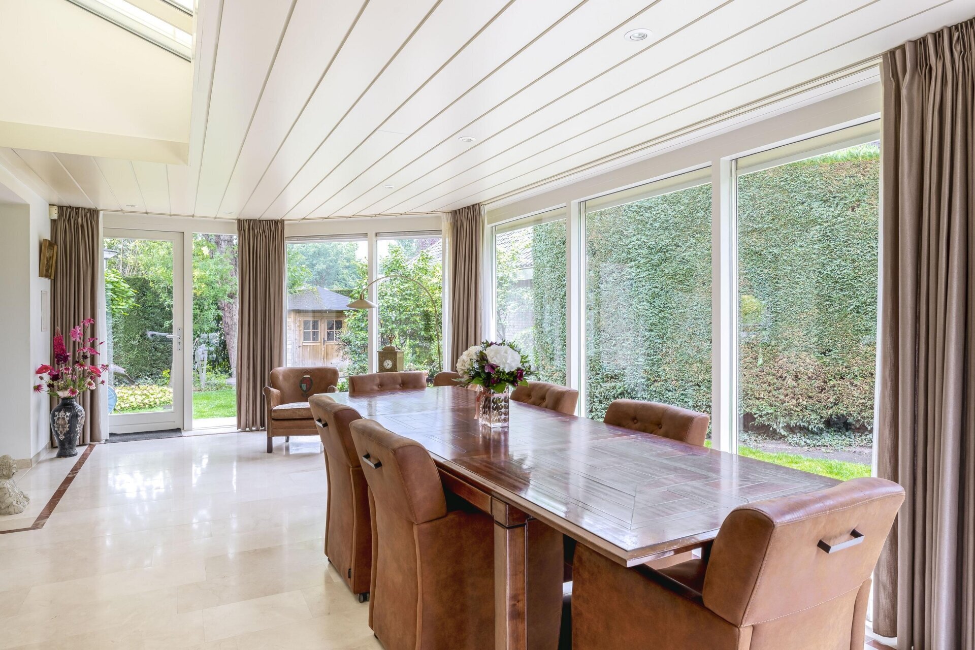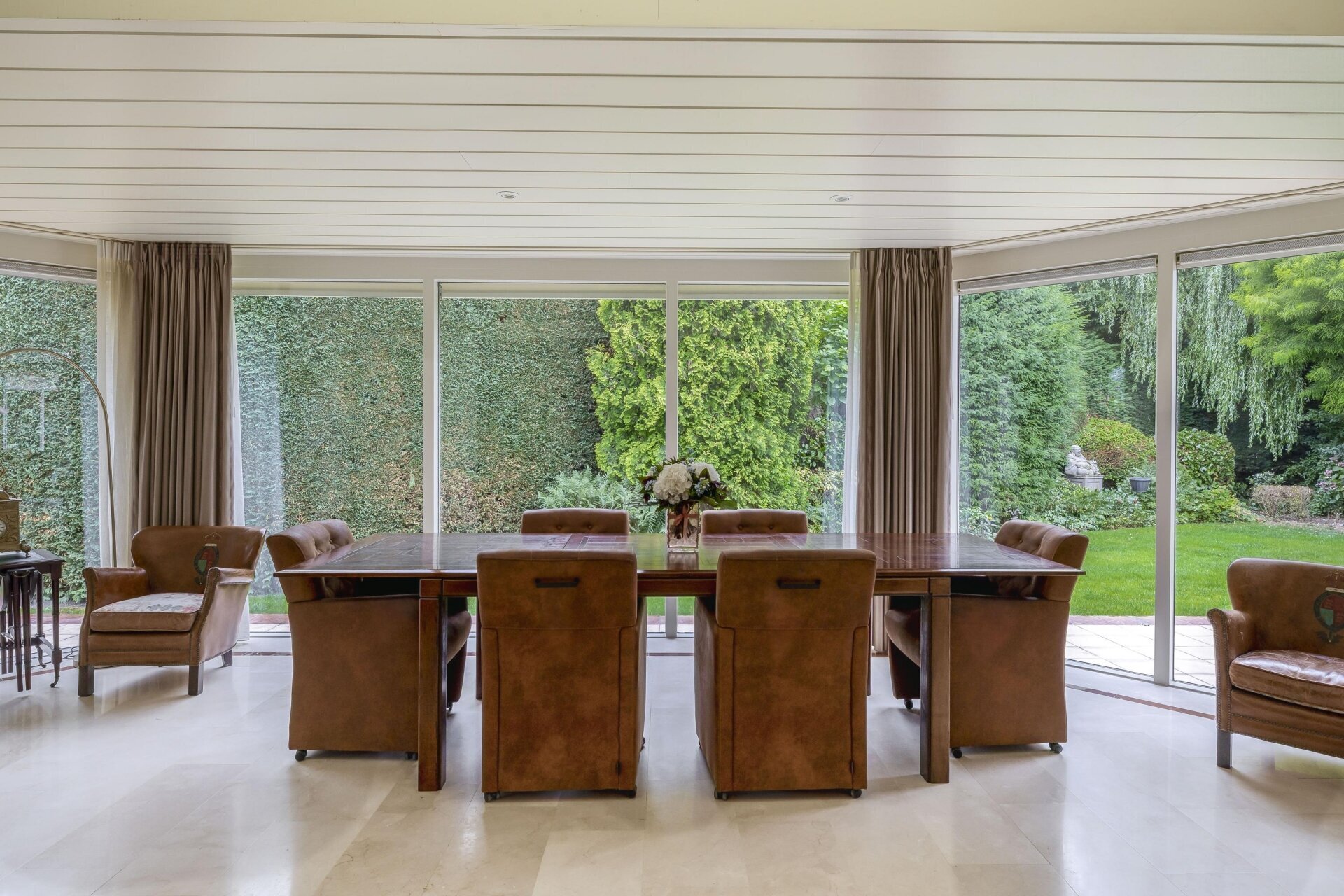 De living is ruim, licht en door de grote ramen aan drie zijden ervaar je een bijna panoramisch uitzicht op het groen rondom het huis. De schuifpui aan de achterzijde geeft toegang tot het terras en de tuin, waar je in alle rust kunt genieten van het zonnetje en het uitzicht op het water. De eetkamer grenst direct aan het terras, wat zorgt voor een fijne interactie tussen binnen en buiten.