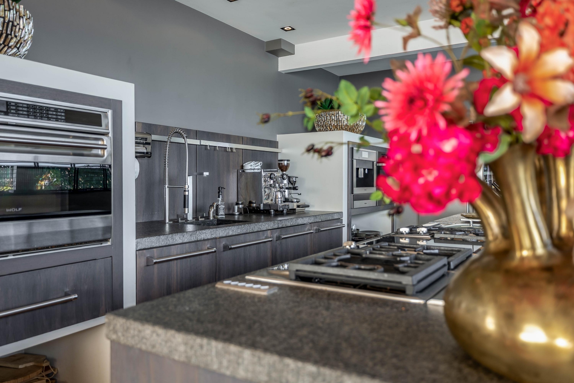 De keuken vormt het stijlvolle middelpunt van het huis. Dit is een plek waar koken en samenzijn moeiteloos samenkomen. De opstelling is royaal, met veel werkruimte en hoogwaardige inbouwapparatuur. Ideaal voor dagelijks gebruik, maar ook perfect voor wie graag gasten ontvangt en uitgebreid kookt. De afwerking is luxe en warm, passend bij het karakter van de villa.