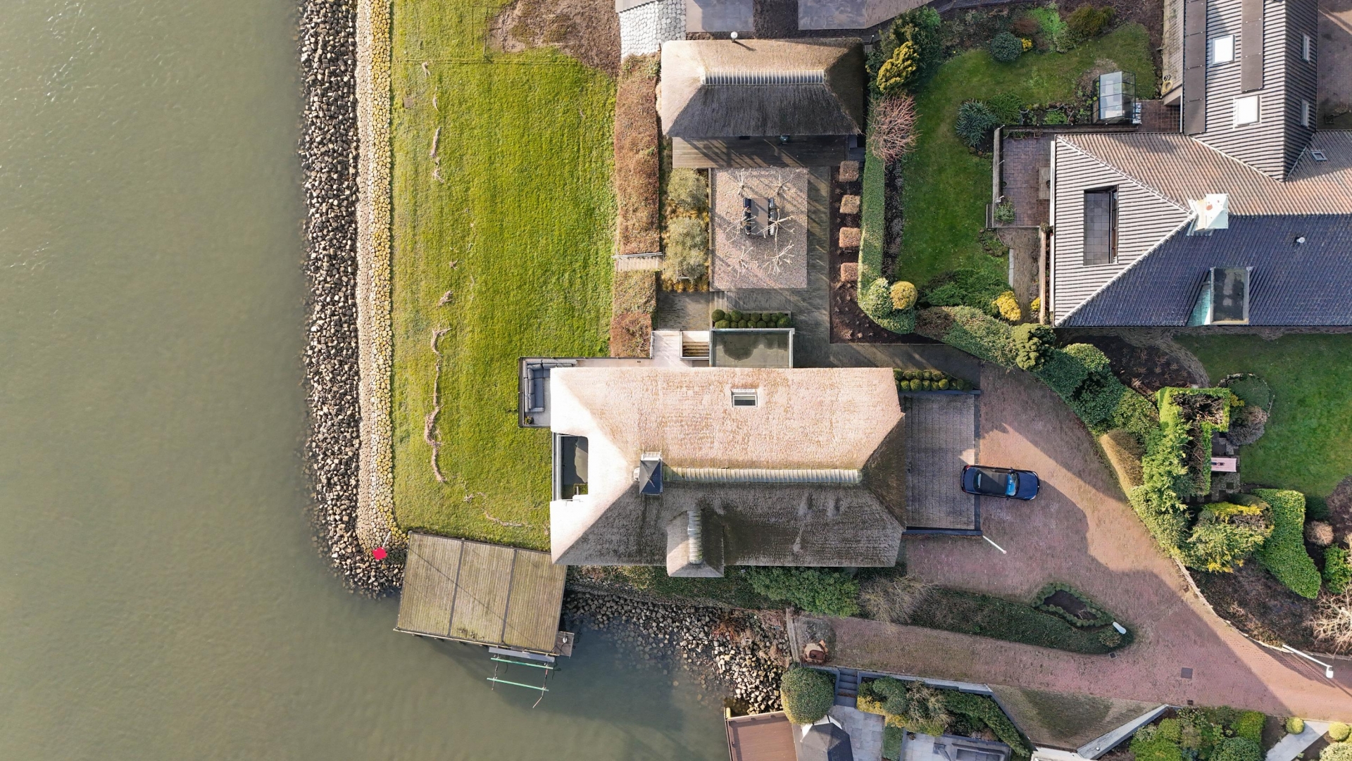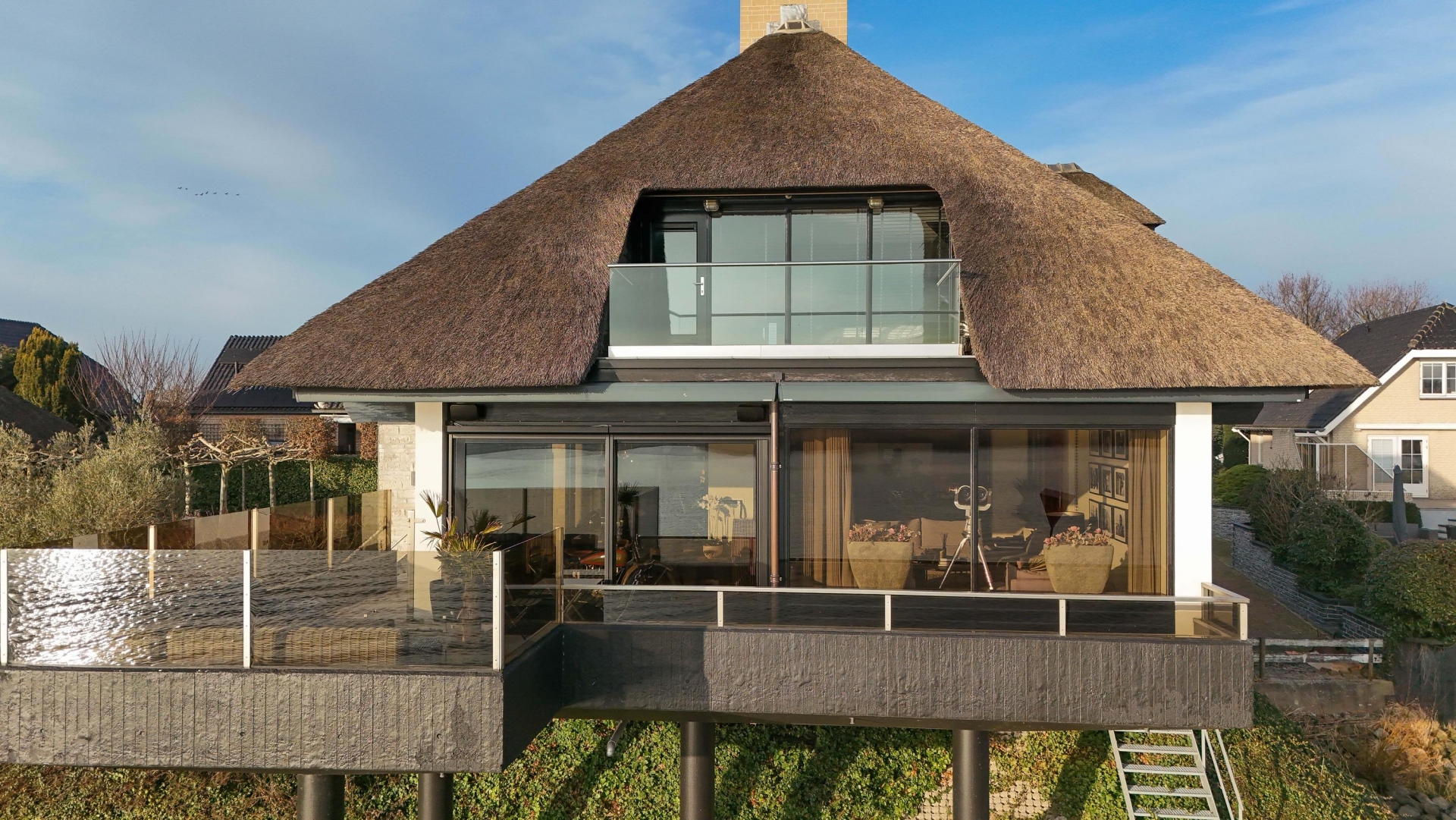 De Werf 5 in Lekkerkerk is een huis voor mensen die weten wat ze willen. Rust, ruimte, water aan je voeten en comfort op hoog niveau. Deze rietgedekte villa ligt op een werkelijk zeldzame plek, direct aan de rivier de Lek, met een eigen aanlegsteiger en bootlift. Hier stap je vanuit je tuin zo de boot op en vaar je richting de Biesbosch, Dordrecht of Rotterdam. Het uitzicht over het water verveelt nooit en verandert elk moment van de dag. Dit is wonen met allure, vrijheid en privacy.