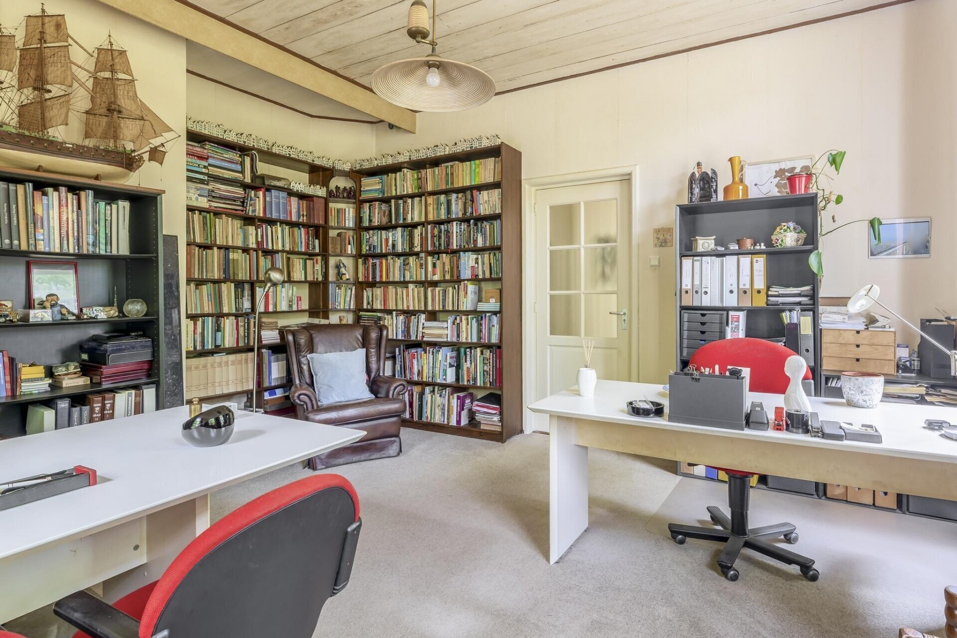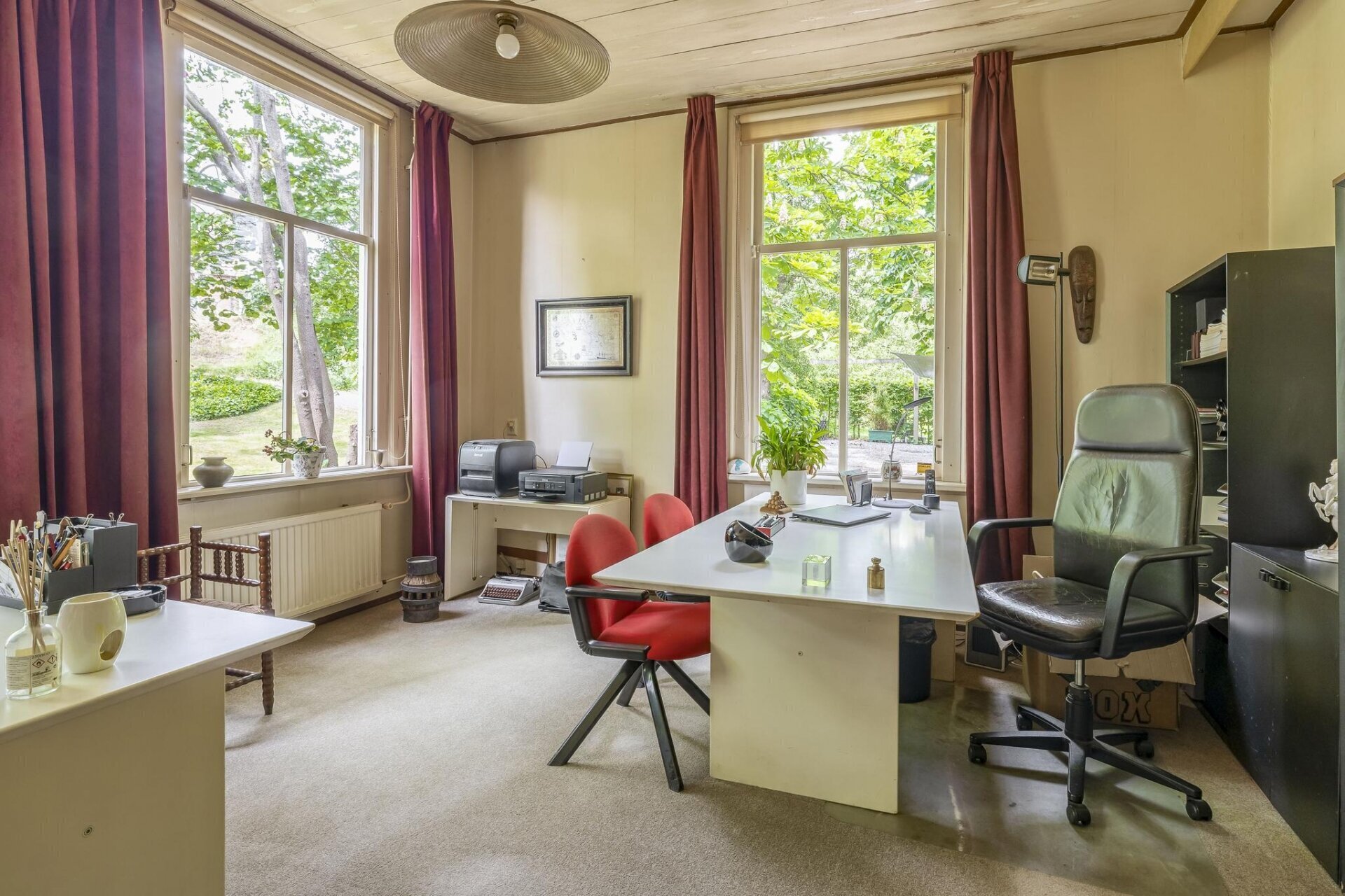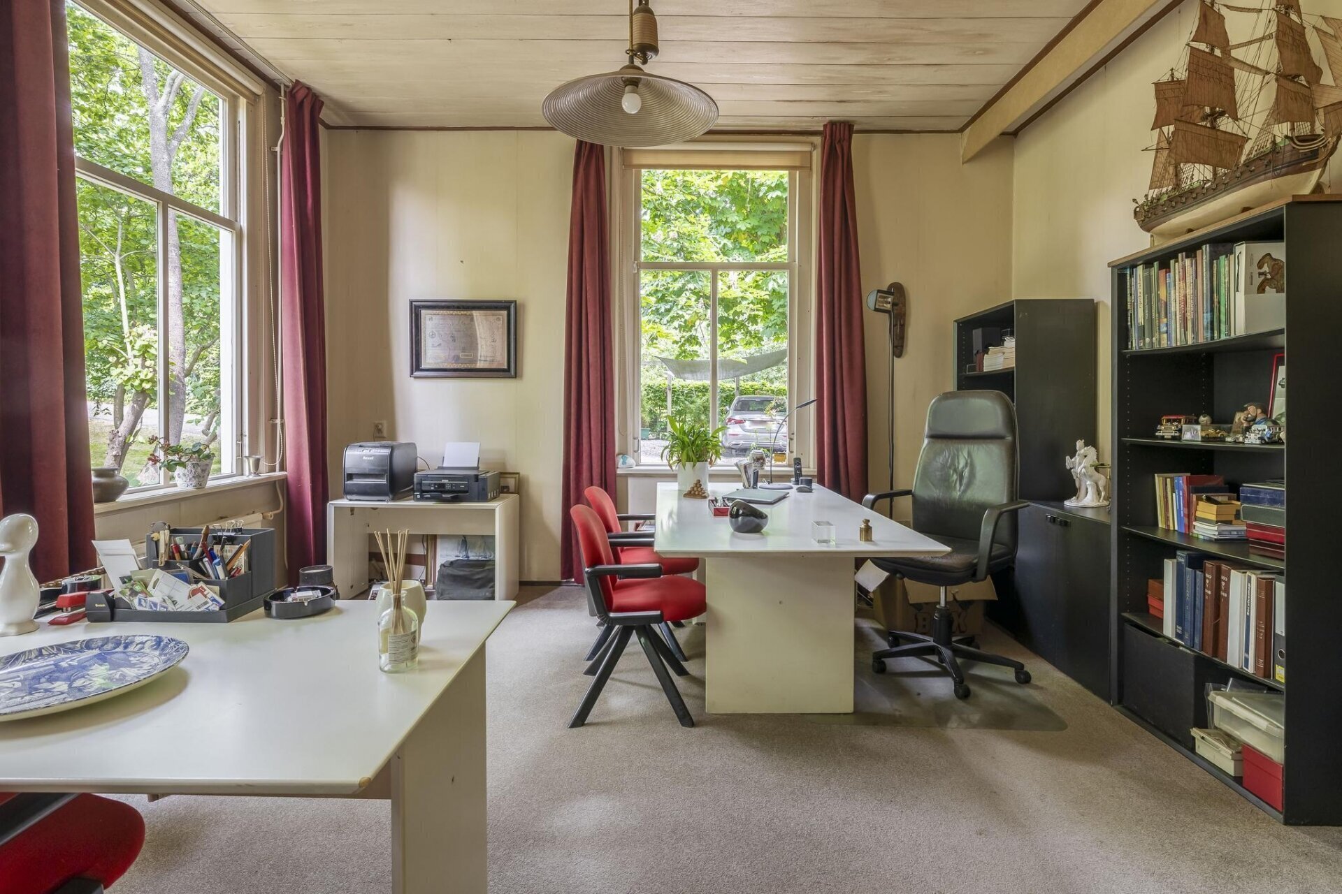 De boerderij heeft een charmante zijentree en een aparte entree aan de voorzijde. Vanuit de hal met garderobe en toilet loop je door naar de werkkamer – een fijne plek met veel daglicht, originele schuiframen en vloerbedekking. De royale woonkamer is voorzien van een sfeervolle open haard (een bakkachel met vernieuwd rookkanaal) en staat in open verbinding met het eetgedeelte, waar dubbele openslaande deuren toegang geven tot de zonnige tuin.