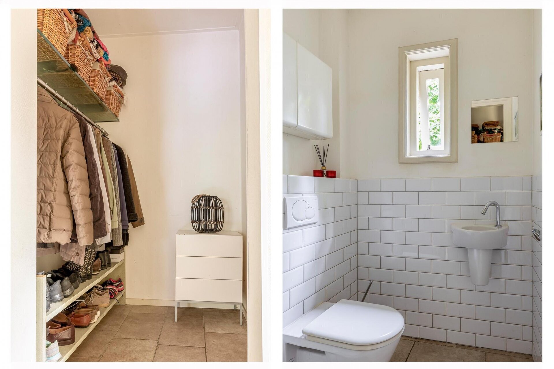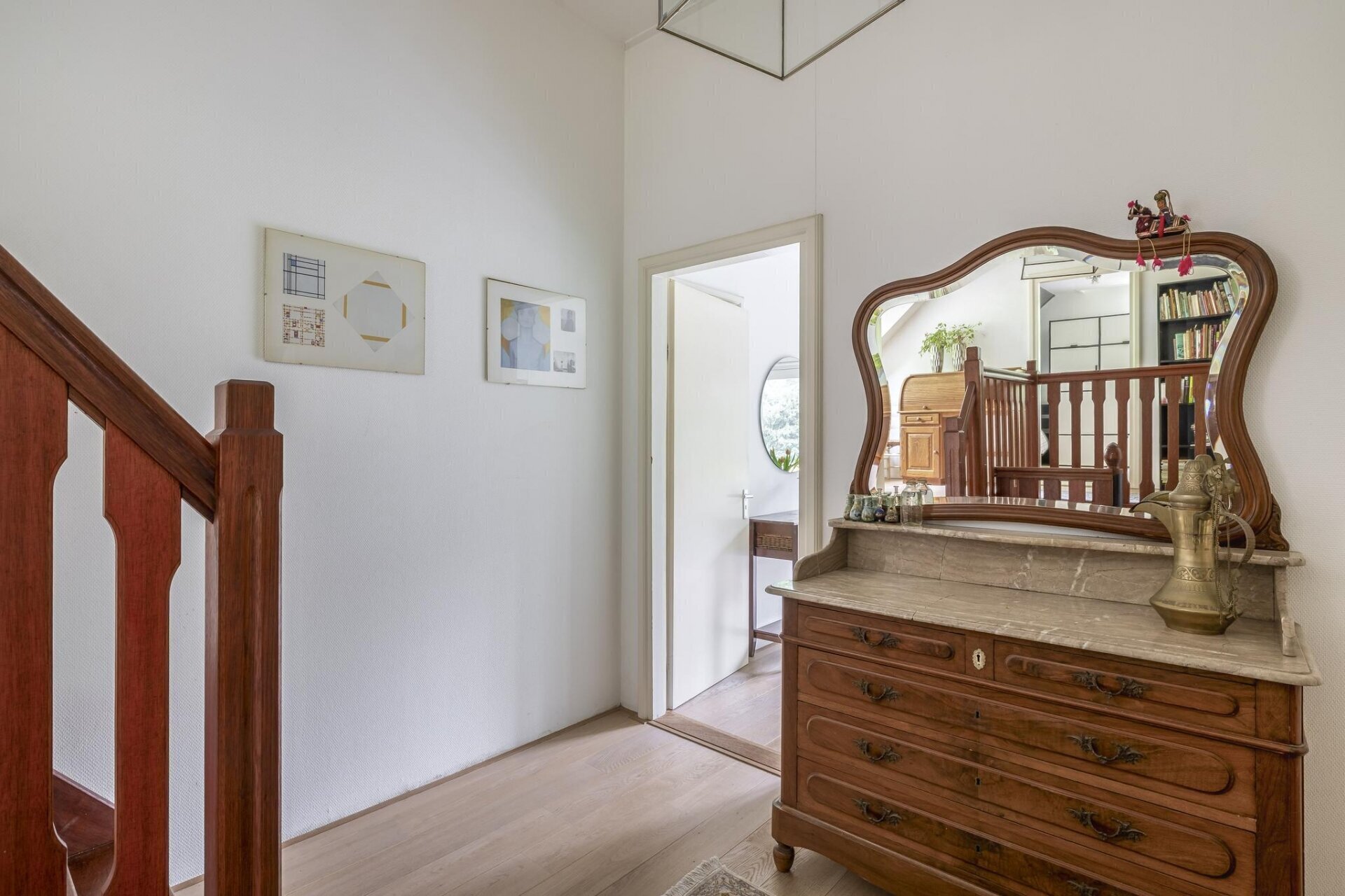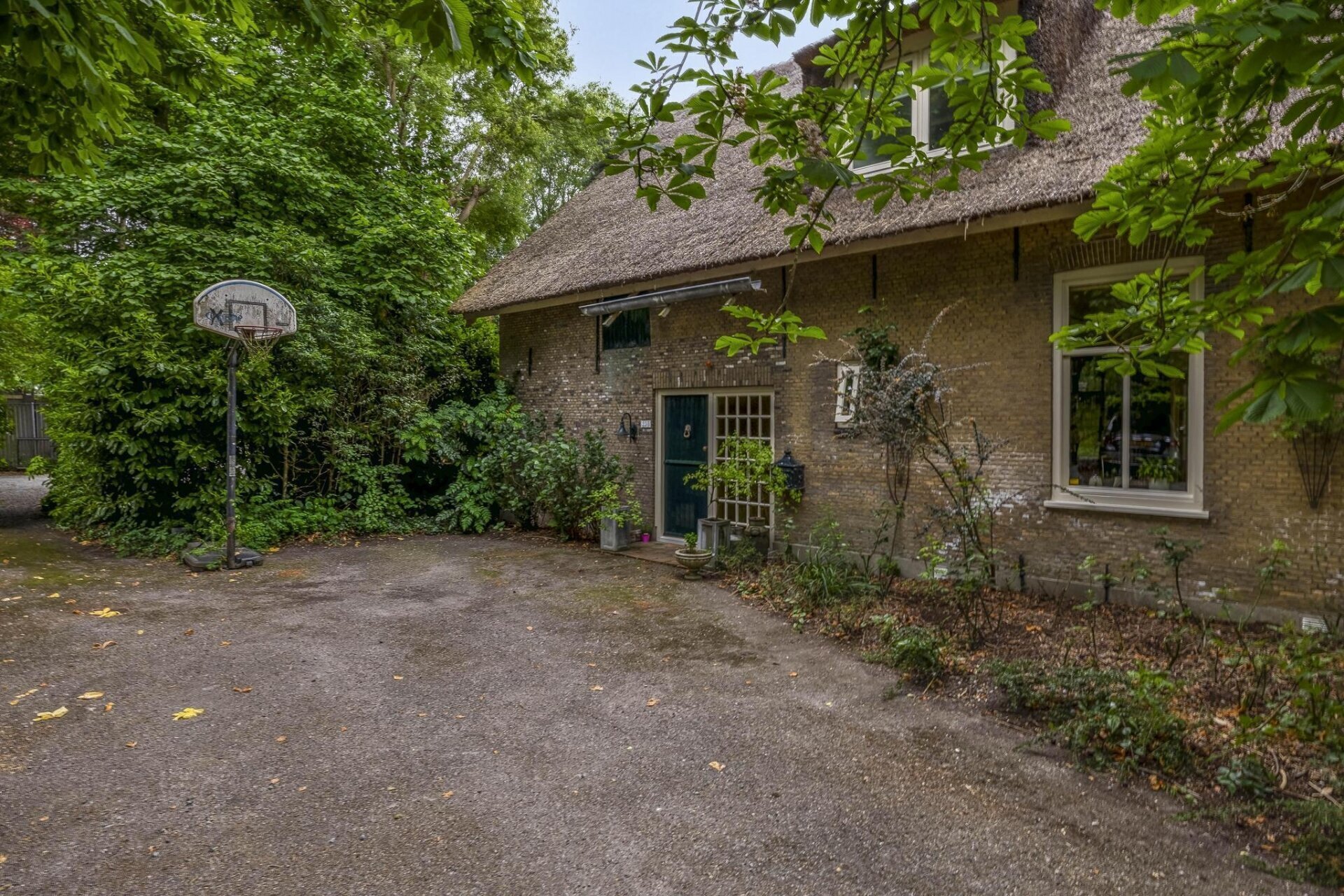De boerderij heeft een charmante zijentree en een aparte entree aan de voorzijde. Vanuit de hal met garderobe en toilet loop je door naar de werkkamer – een fijne plek met veel daglicht, originele schuiframen en vloerbedekking. De royale woonkamer is voorzien van een sfeervolle open haard (een bakkachel met vernieuwd rookkanaal) en staat in open verbinding met het eetgedeelte, waar dubbele openslaande deuren toegang geven tot de zonnige tuin.