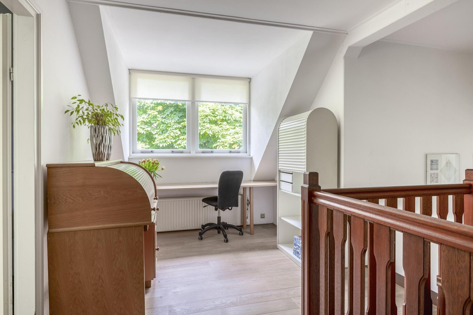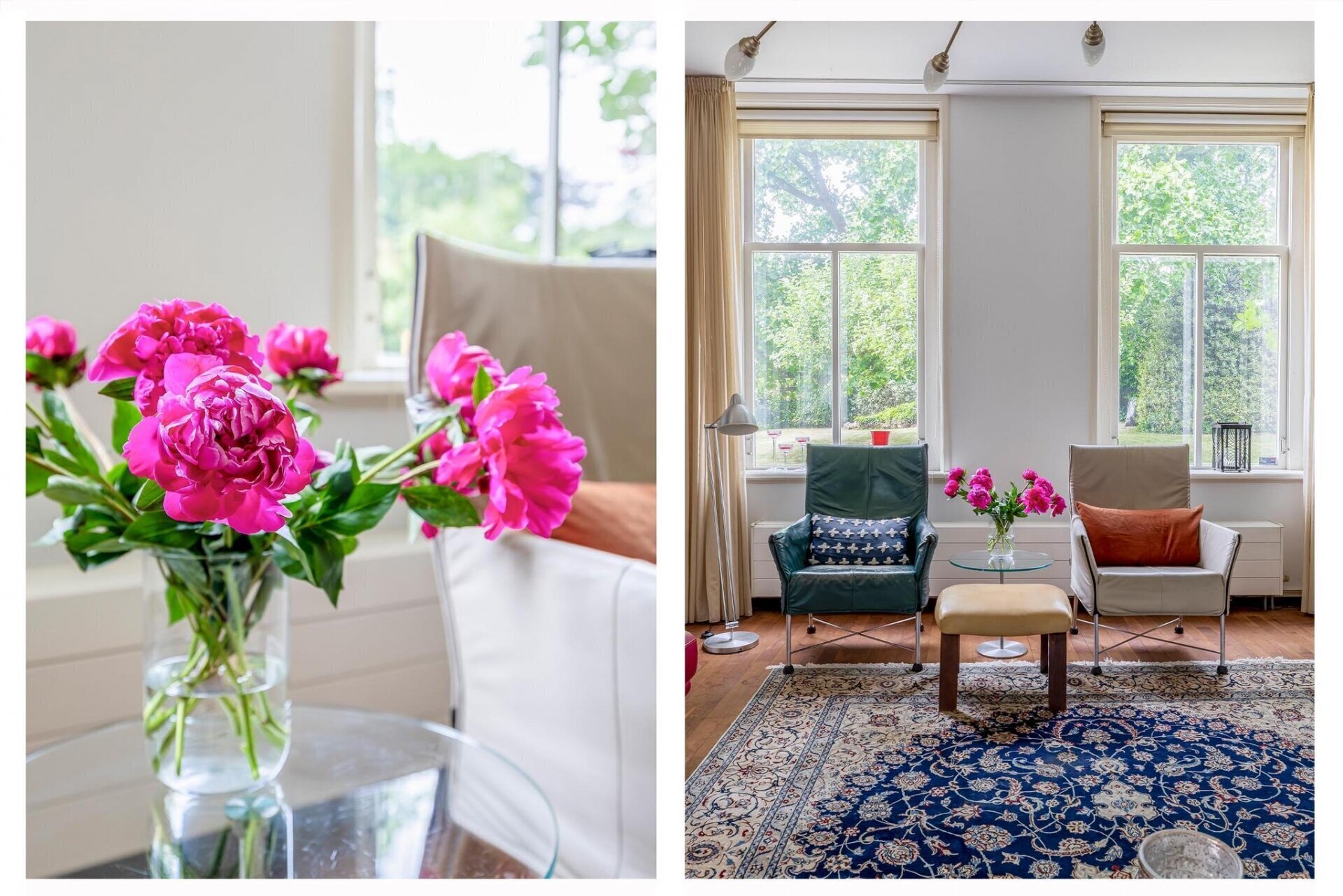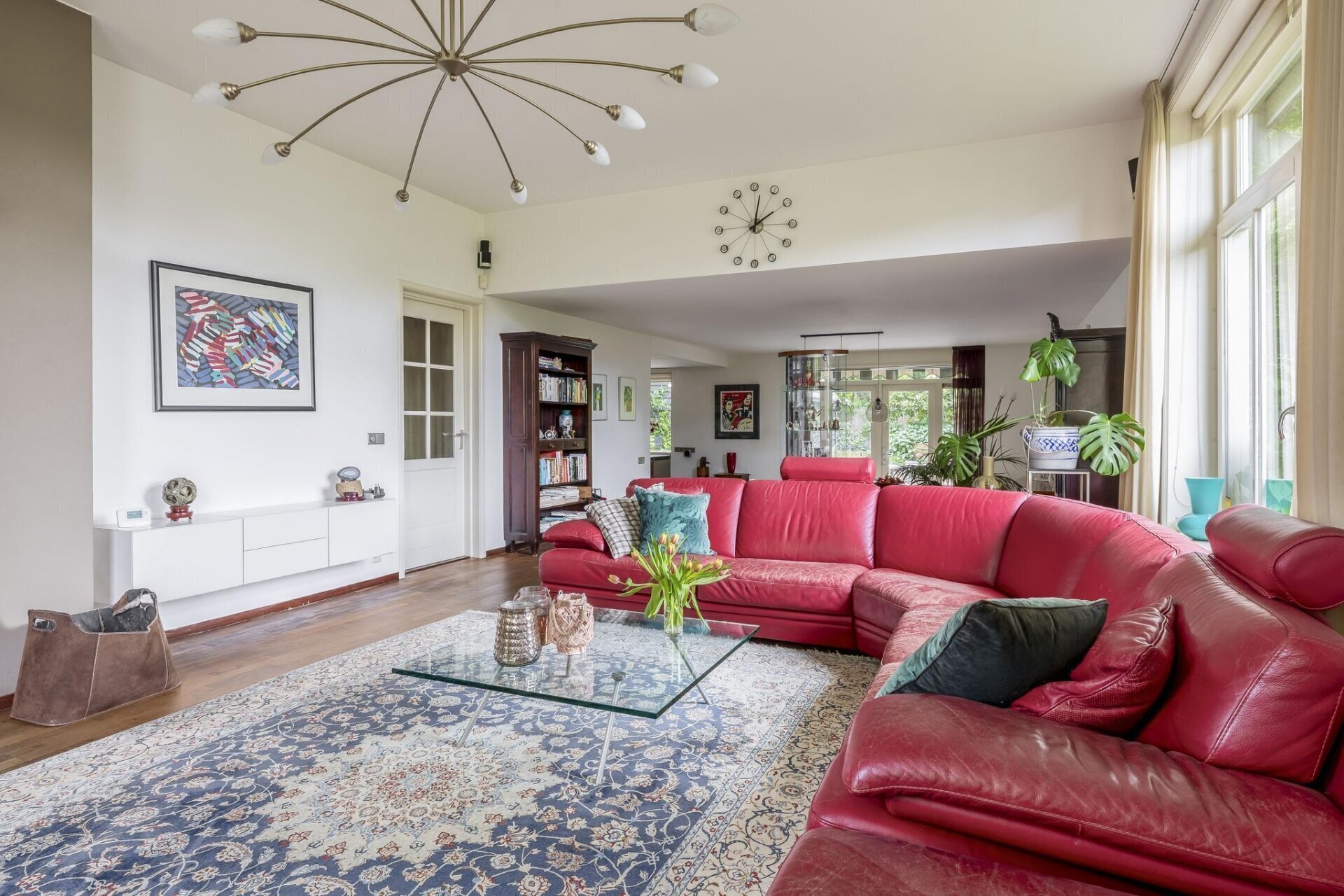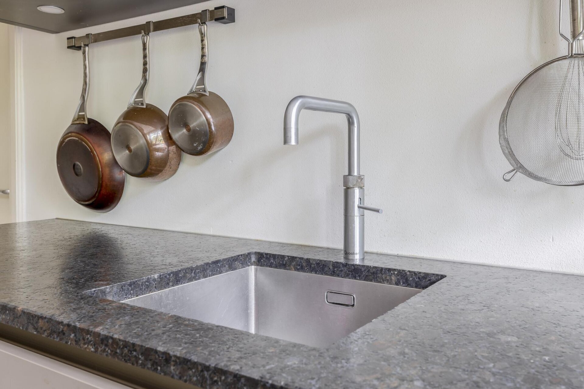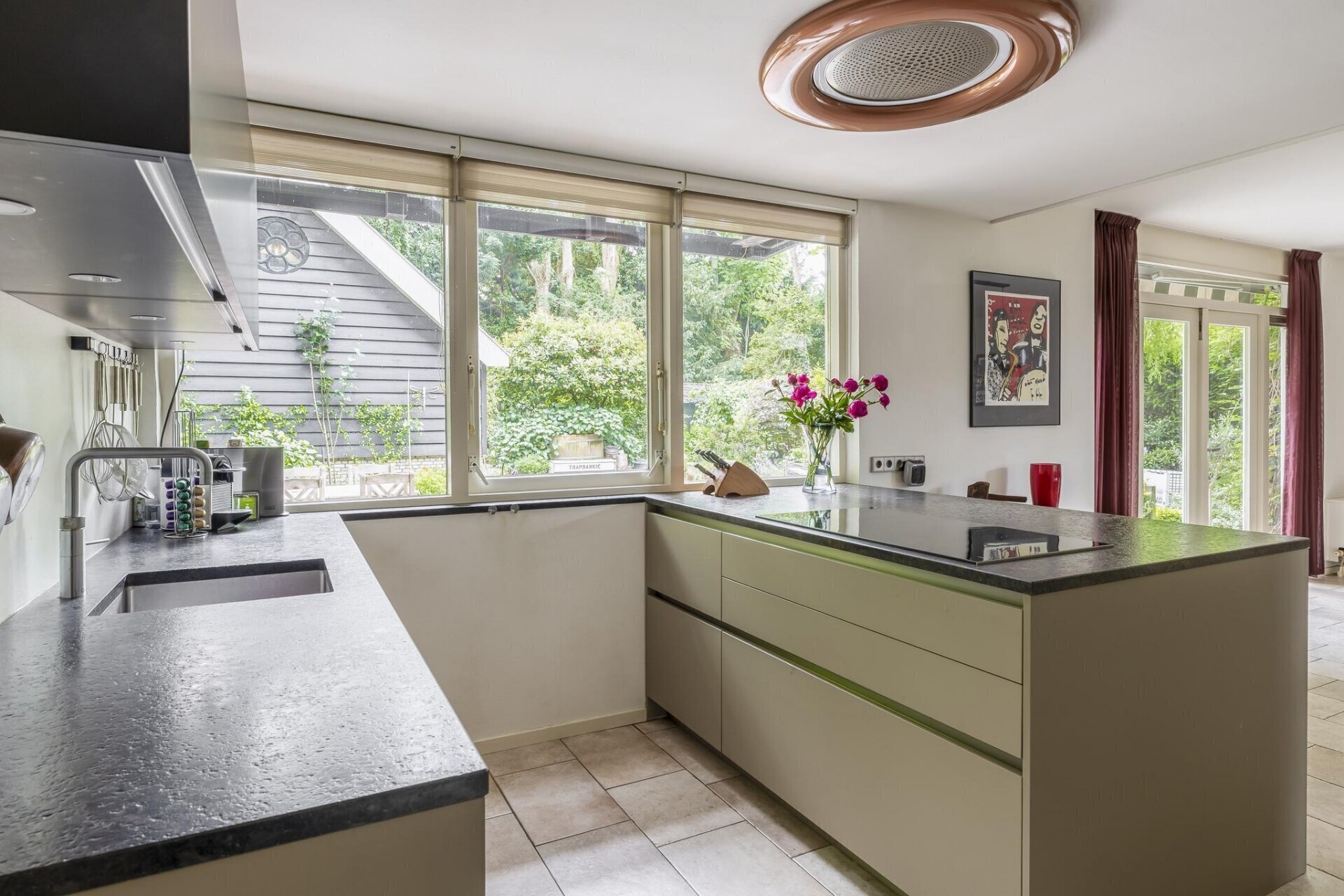 Achterin in het huis ligt de ruime leefkeuken, die ongeveer acht jaar geleden is vernieuwd. Een luxe opstelling en moderne uitstraling met stenen blad, kookeiland met inductiekookplaat en afzuigkap, combioven, stoomoven, wijnklimaatkast, koelkast, vriezer en vaatwasser zorgen ervoor dat elke kookliefhebber hier z’n hart kan ophalen. Vanuit de keuken kijk je uit op het terras en de groene tuin rondom. In de aangrenzende bijkeuken vind je onder meer de wasmachine- en drogeraansluiting, extra bergruimte en de cv-installatie (ca. 2019).