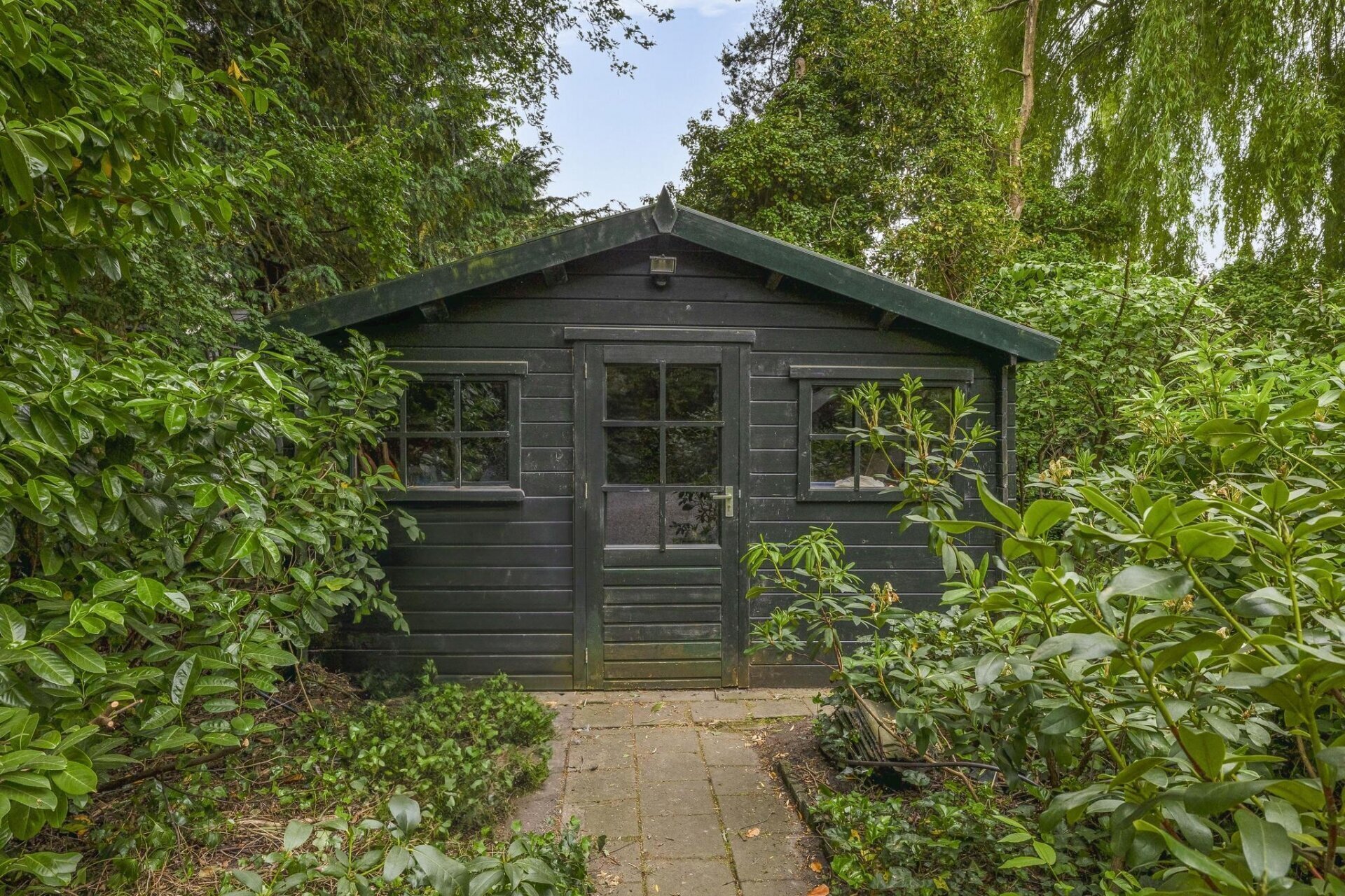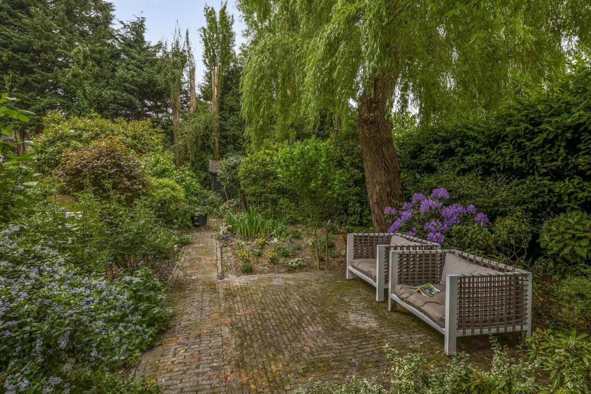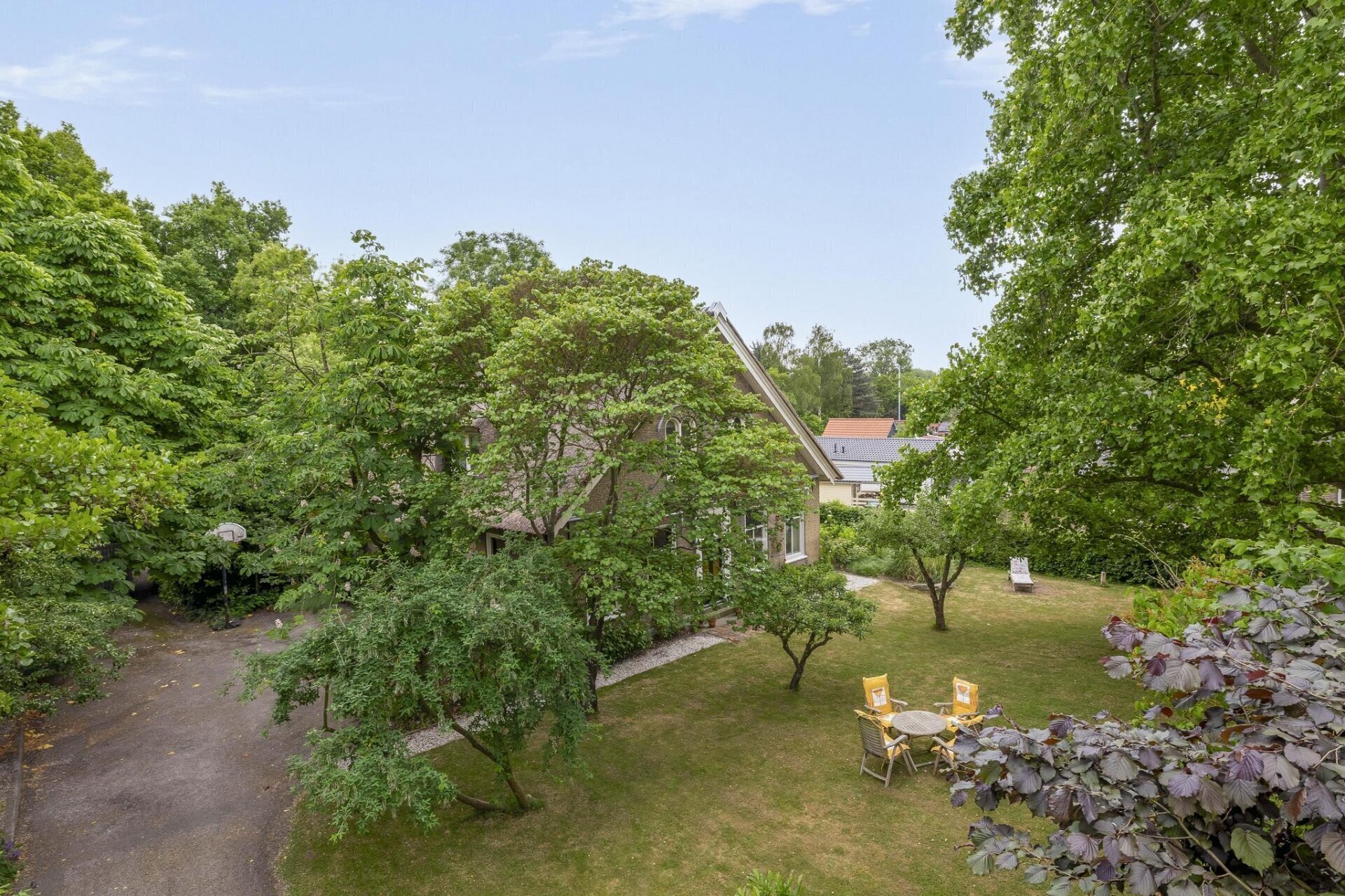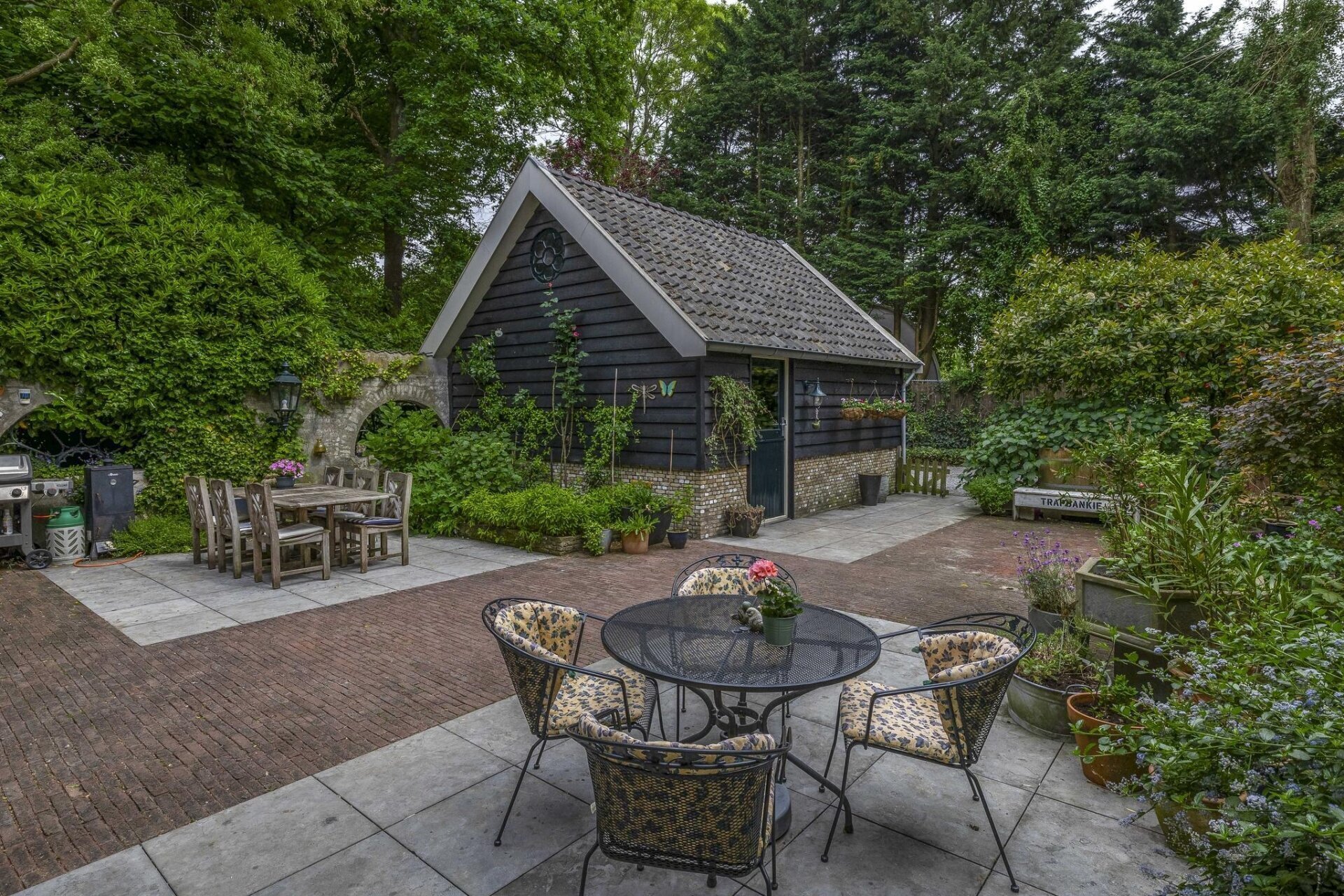 Het perceel van ruim 1.800 m² biedt volledige privacy en heeft rondom volwassen beplanting, een boomgaardachtig gazon en meerdere terrassen. Het zonneterras ligt op het zuiden en is aangelegd op een betonnen plaat van de voormalige schuur. De huidige garage is in 2008 gebouwd, goed geïsoleerd, verwarmd en heeft een grote bergvliering.