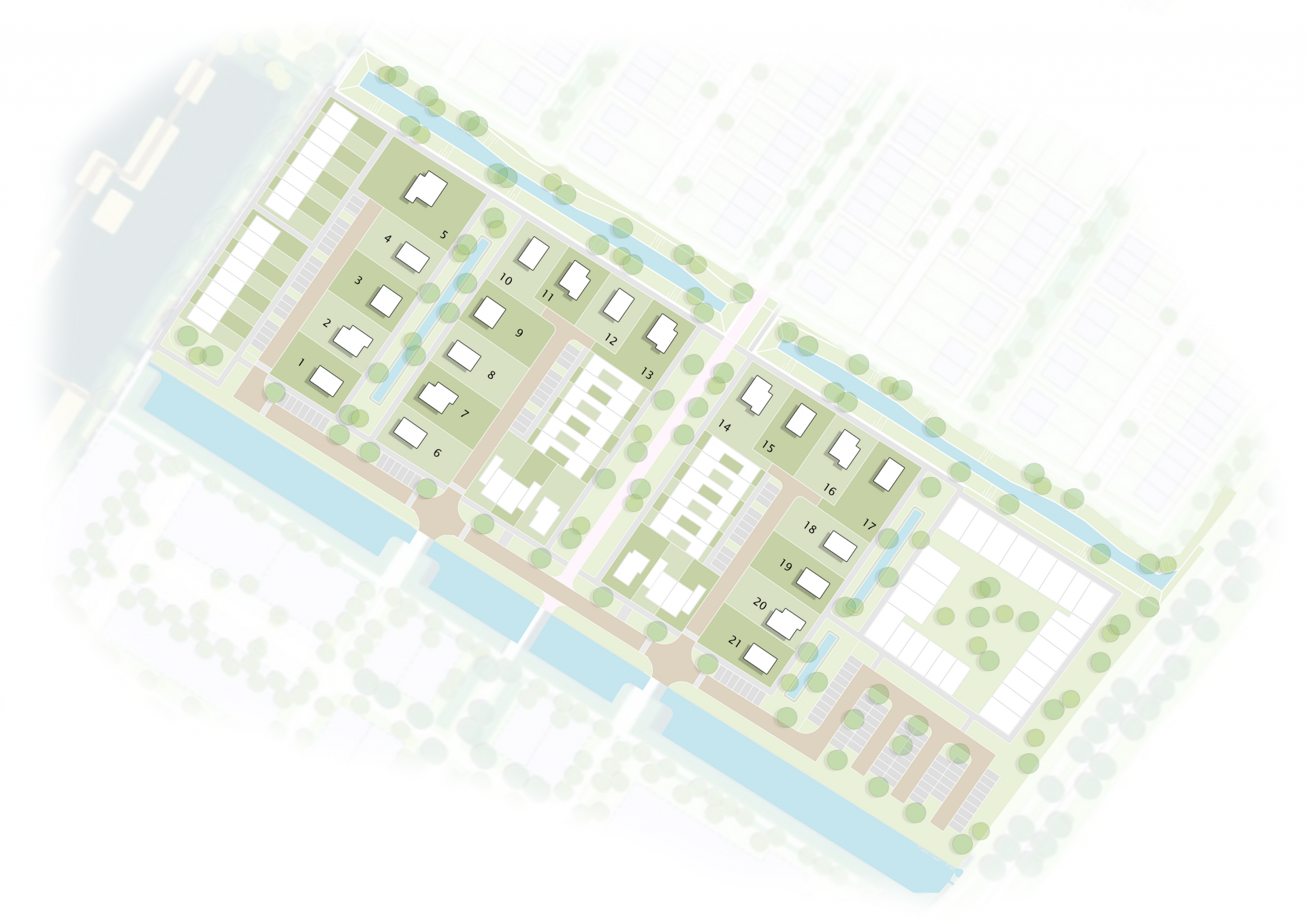 De kavels liggen in een autoluwe wijk met brede groenzones en wandelpaden. Vrijwel alle woningen grenzen direct aan openbaar groen. Parkeren vindt grotendeels plaats in parkeerhoven aan de randen van de wijk, waardoor de woonstraten rustig en overzichtelijk blijven.