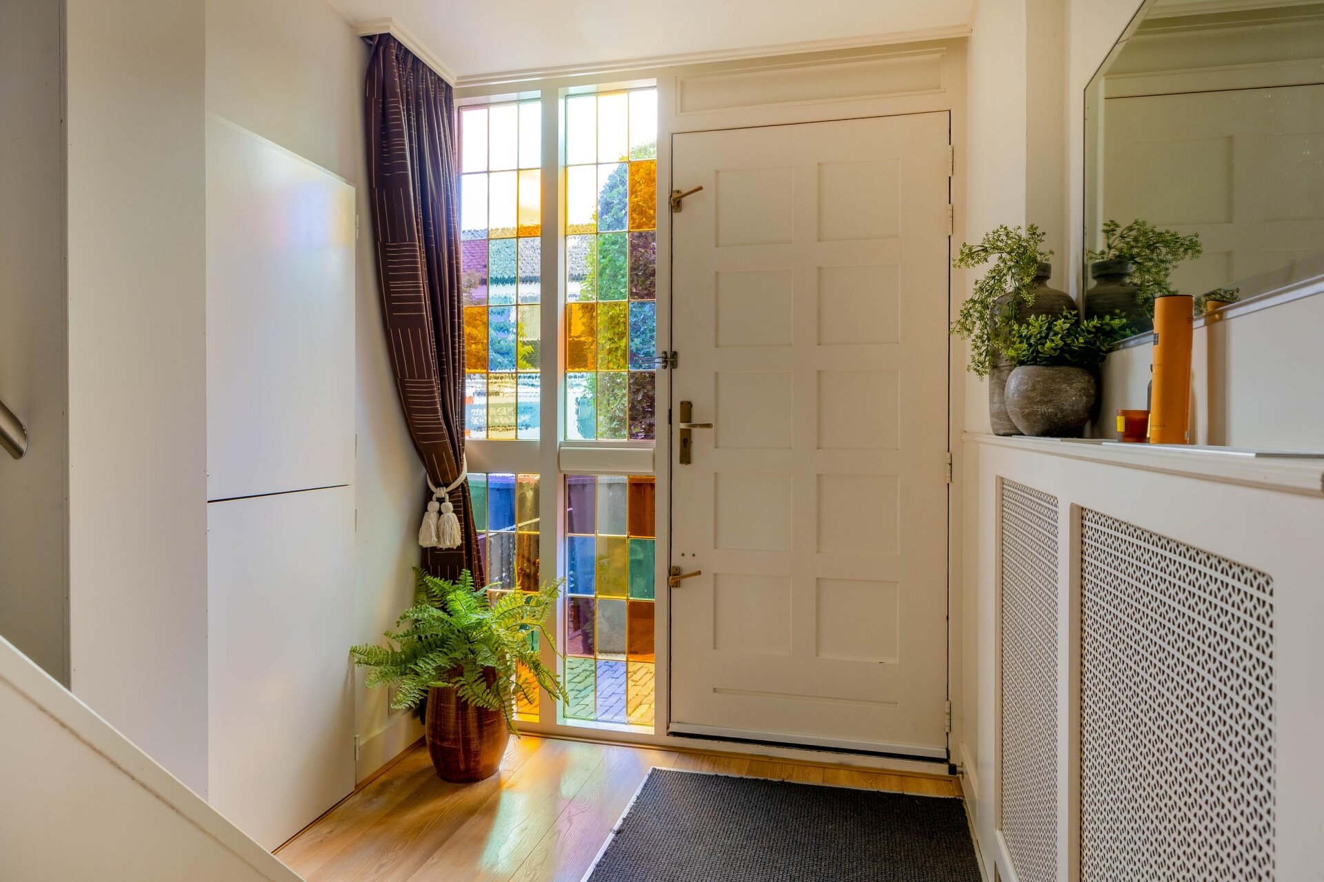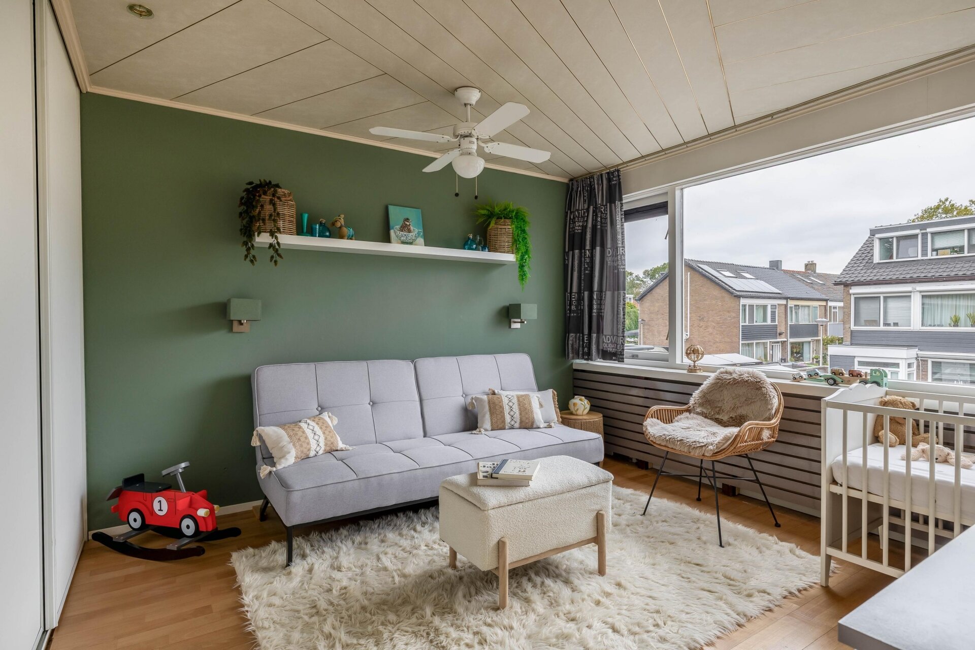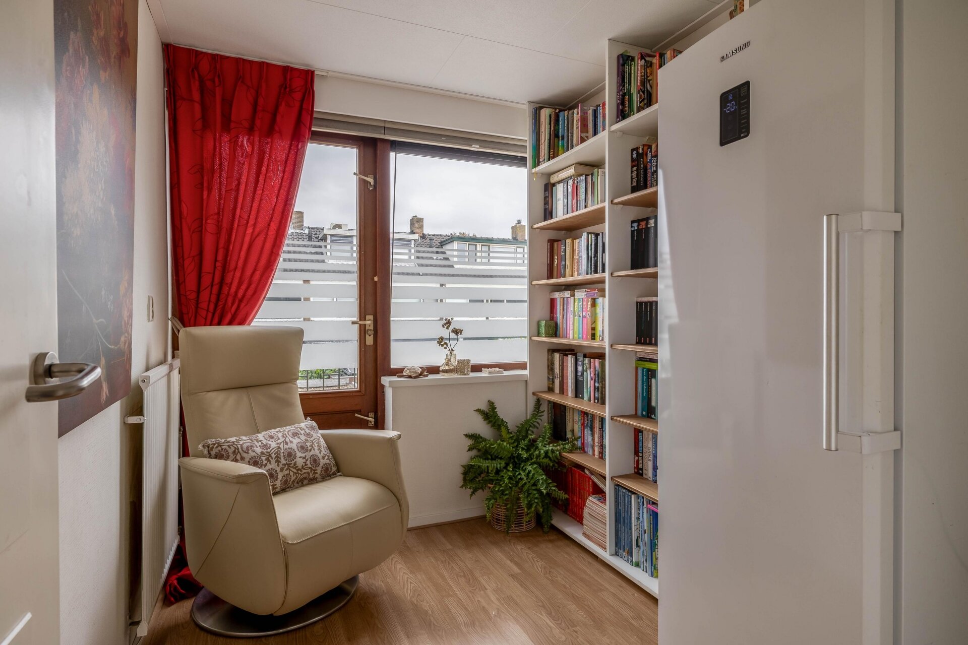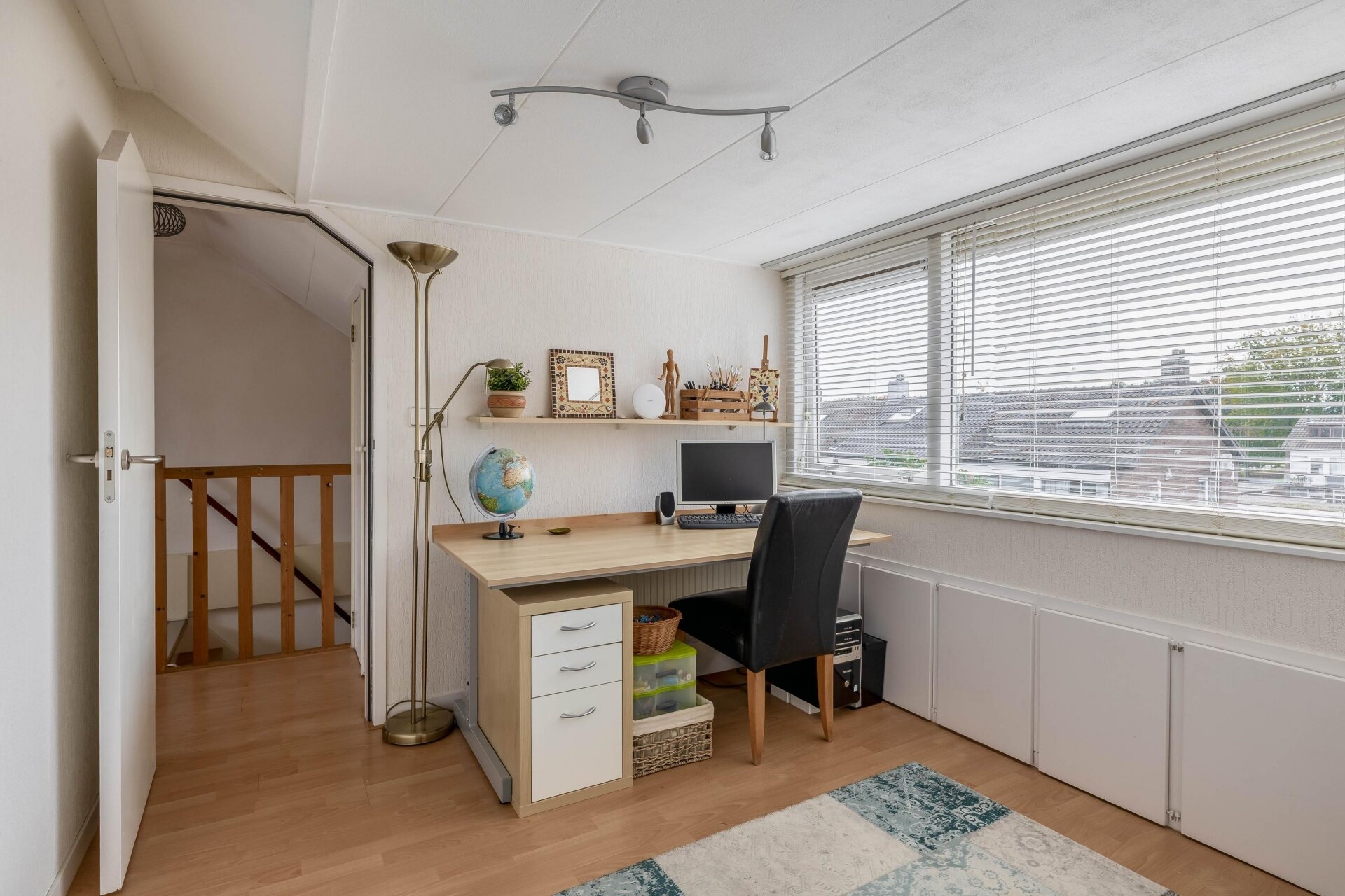 Op de eerste verdieping drie slaapkamers en de badkamer. De grootste slaapkamer ligt aan de achterzijde, met uitzicht op de tuin. Ook aan de voorzijde vind je een ruime kamer, nu in gebruik als kinderkamer, en een derde kamer die perfect werkt als kantoor of kastenkamer. De moderne badkamer is stijlvol afgewerkt en voorzien van een inloopdouche, wastafel met meubel en tweede hangend closet.