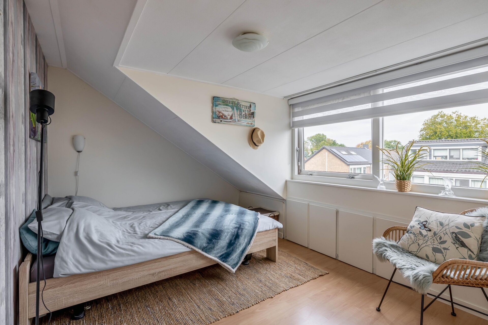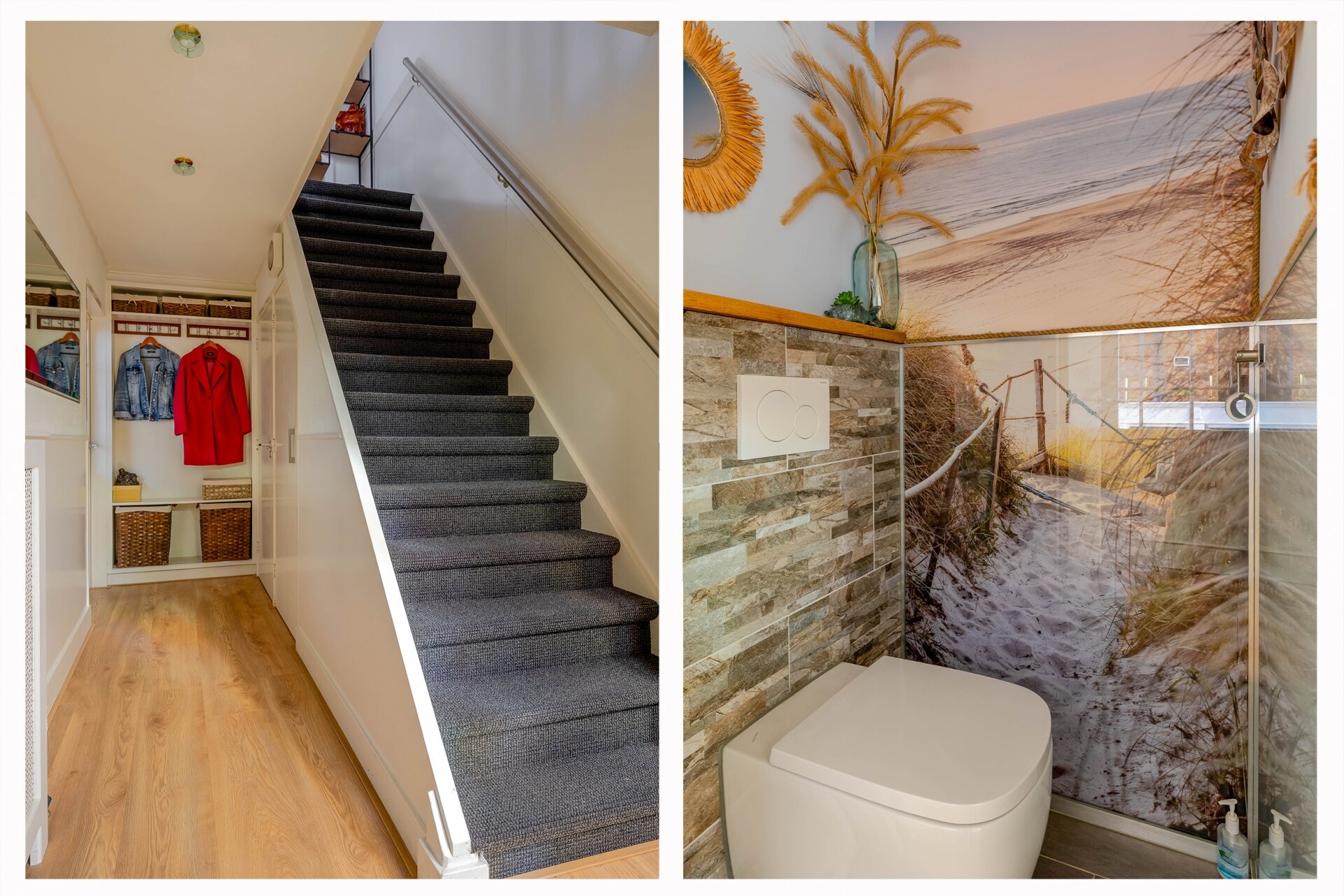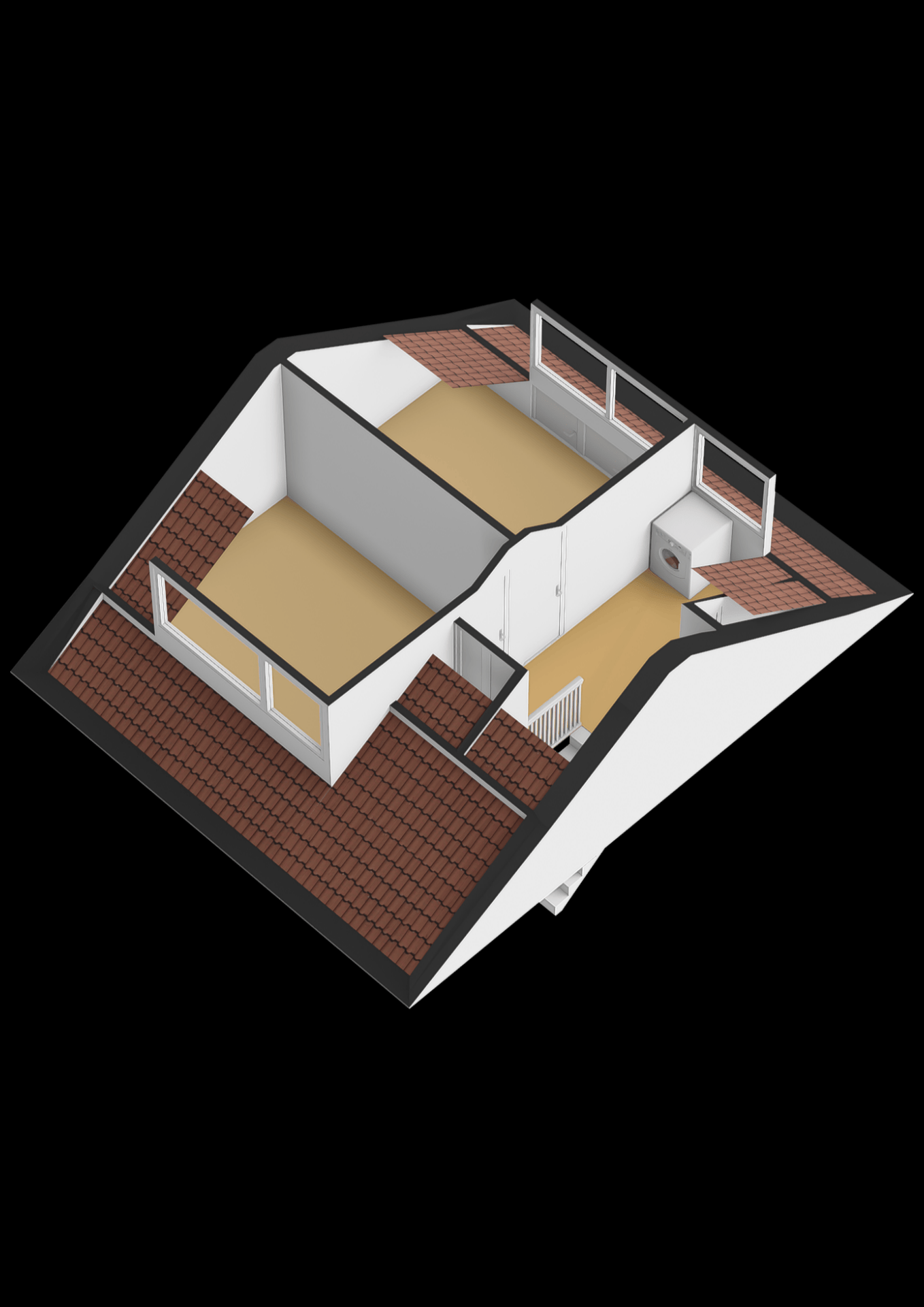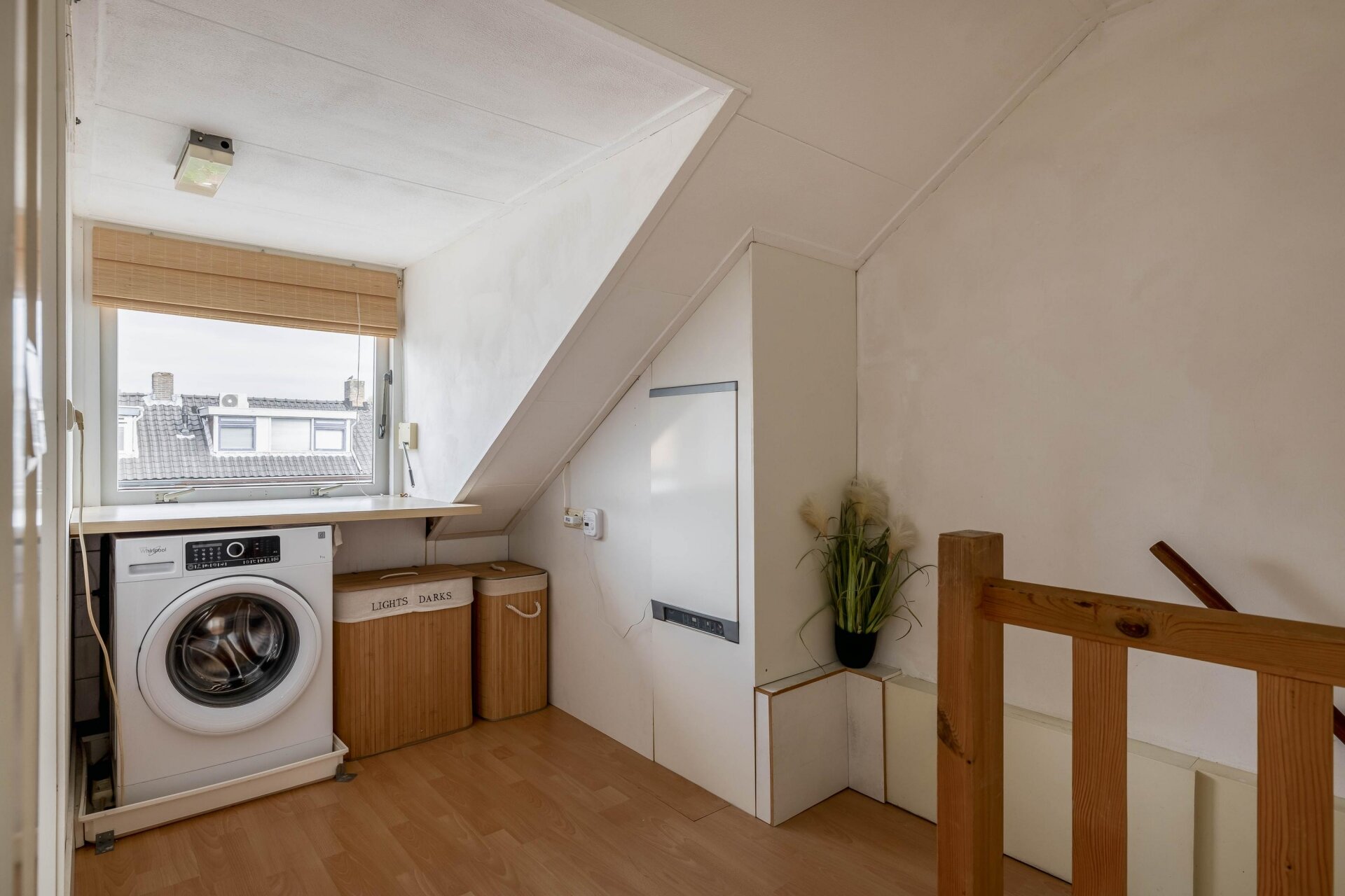 Op de tweede verdieping is een voorzolder met opstelling voor wasmachine en droger en toegang tot nog twee slaapkamers. Beide kamers profiteren van het extra licht en de ruimte die de dakkapellen bieden. Slimme bergruimte is hier mooi weggewerkt onder de schuine kap. Ideaal voor seizoensspullen of koffers.