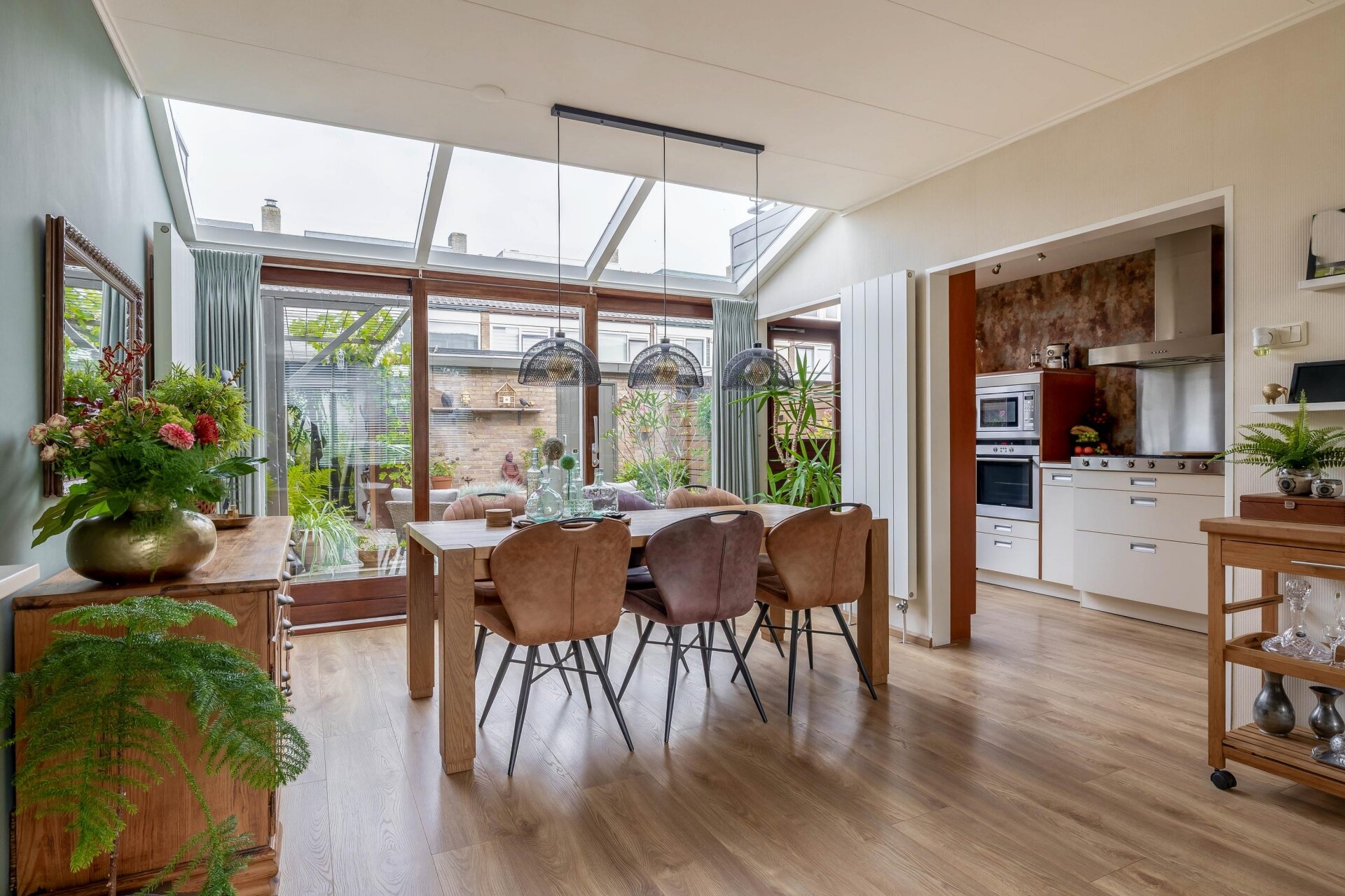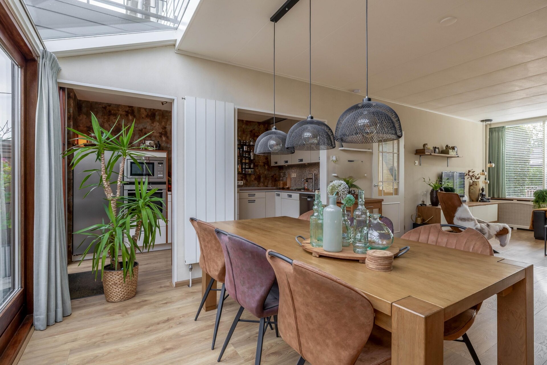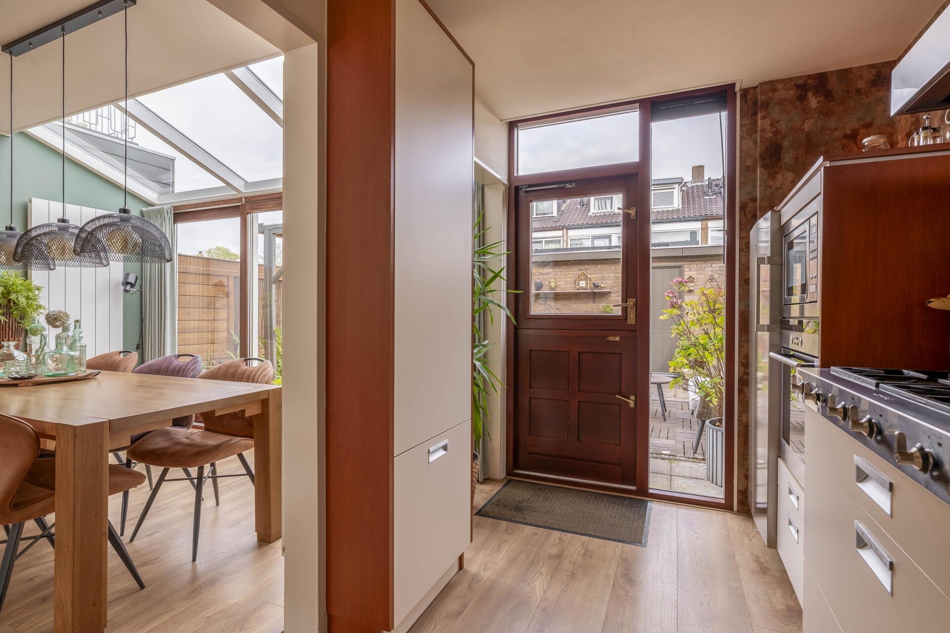Binnenkomen voelt meteen goed. Dankzij de uitbouw met lichtstraten aan de achterzijde heeft de ruime living van 32 m² veel natuurlijk daglicht. De woonkamer is royaal opgezet, met plek voor een fijne zithoek én grote eettafel. De open sfeer, gecombineerd met de warme vloer en de tuingerichte ligging, maakt dit een heerlijke plek om te ontspannen of gezellig samen te komen.