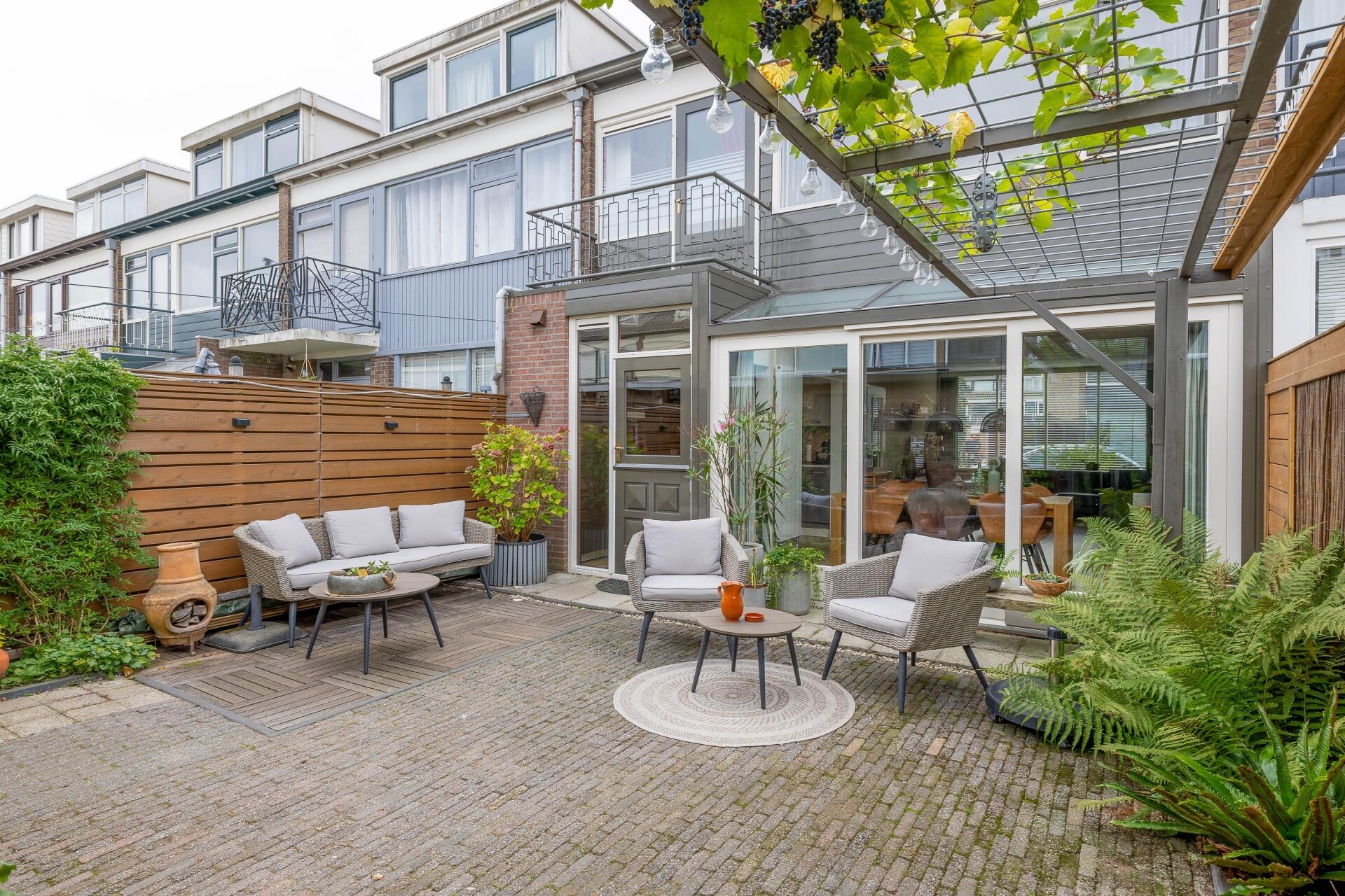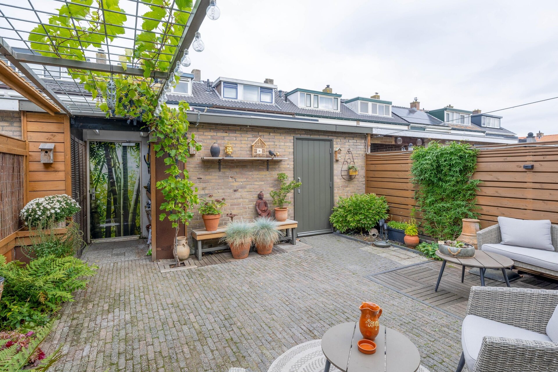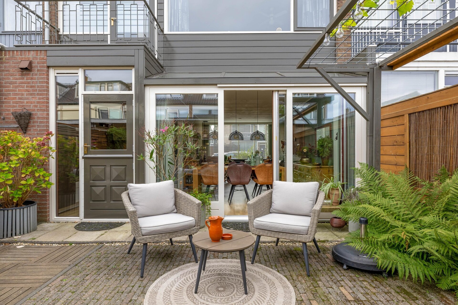 Via de schuifpui in de aanbouw stap je zo de onderhoudsvriendelijke achtertuin in. De ligging op het noordwesten zorgt ervoor dat je in de middag en avond lekker in de zon zit, maar ook op warme dagen voldoende schaduw hebt. De tuin is grotendeels bestraat en netjes aangelegd groene accenten en genoeg plek om te zitten of buiten te eten.