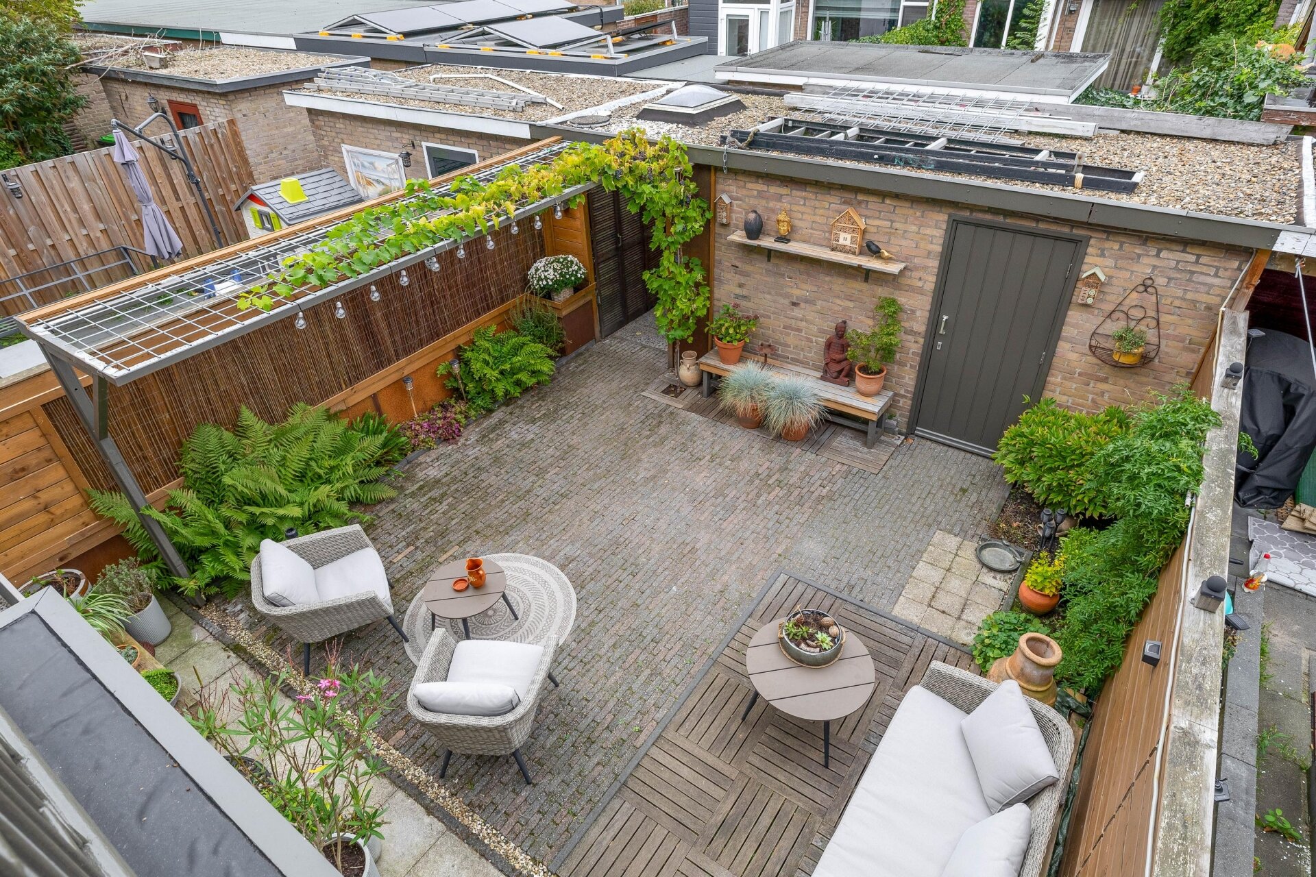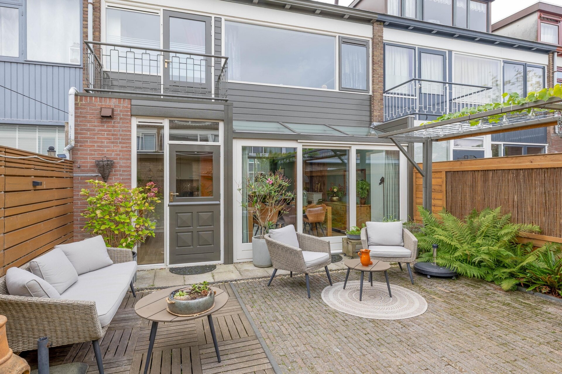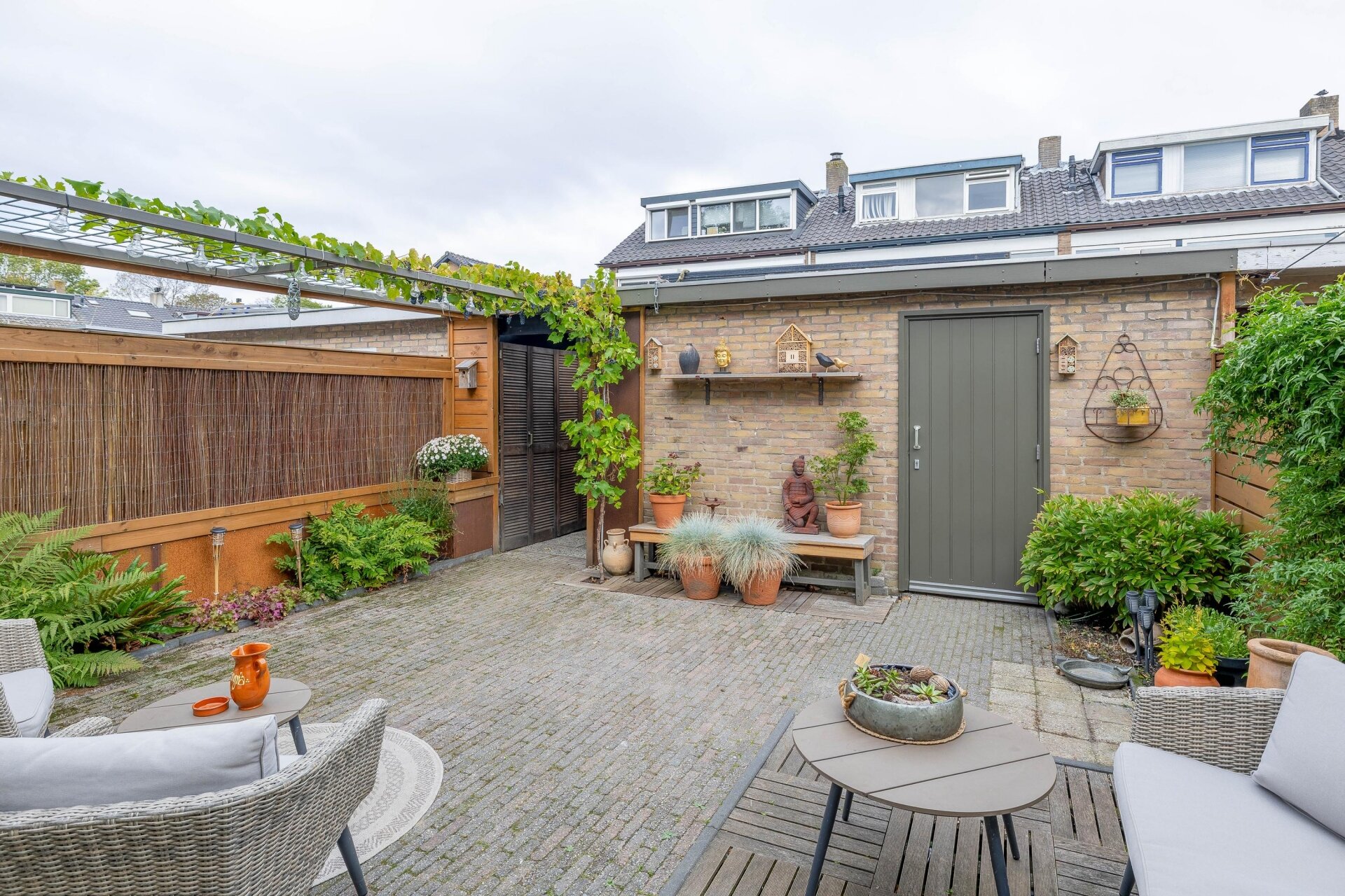 Via de schuifpui in de aanbouw stap je zo de onderhoudsvriendelijke achtertuin in. De ligging op het noordwesten zorgt ervoor dat je in de middag en avond lekker in de zon zit, maar ook op warme dagen voldoende schaduw hebt. De tuin is grotendeels bestraat en netjes aangelegd groene accenten en genoeg plek om te zitten of buiten te eten.