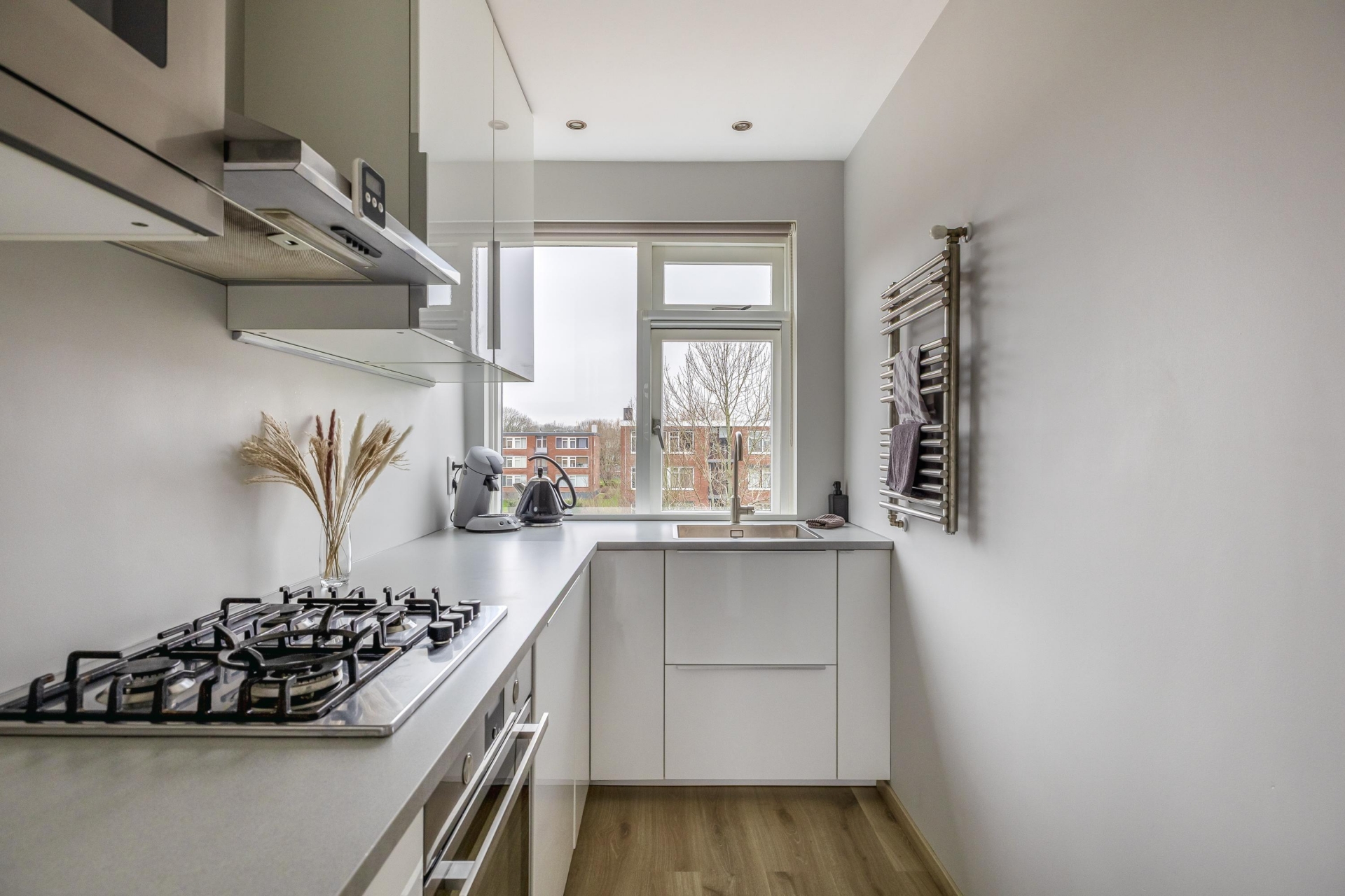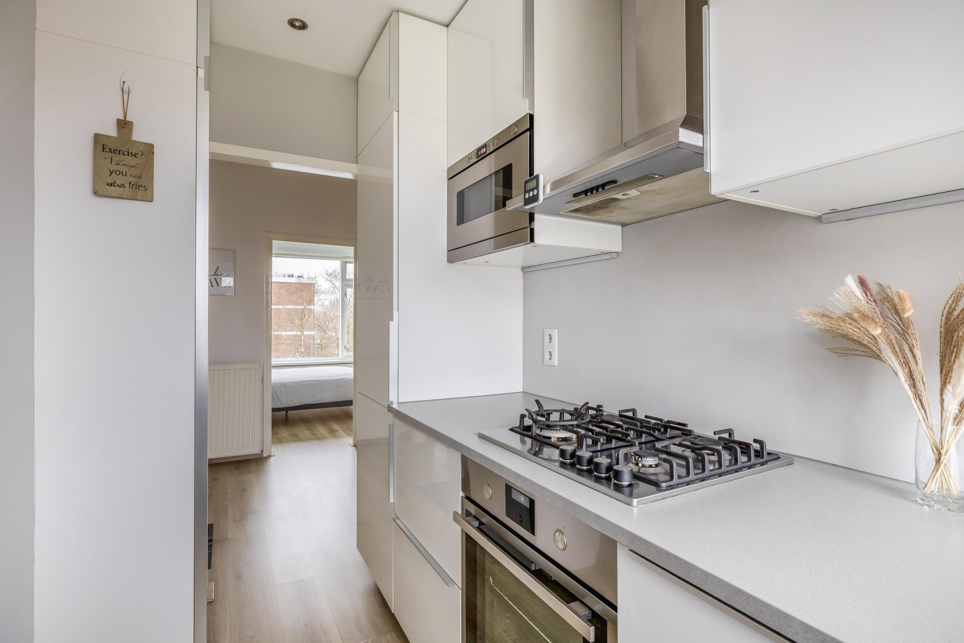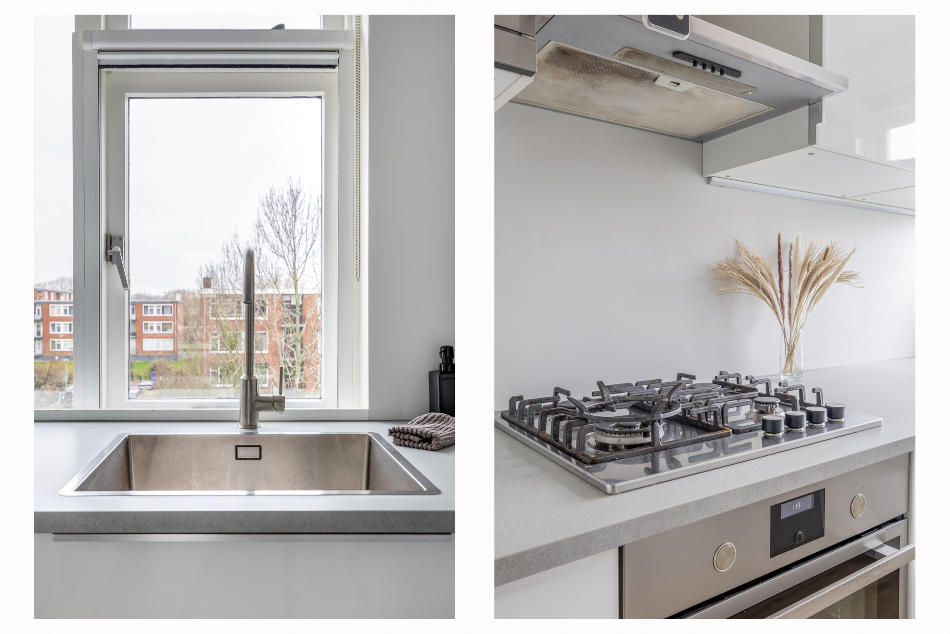 De keuken is strak uitgevoerd met een licht werkblad, wat het geheel een moderne uitstraling geeft. Je beschikt hier over een 4-pits gaskookplaat, afzuigkap, combi-oven, vaatwasser en koel-vriescombinatie. Ook aan opbergruimte is gedacht. Tevens bevindt zich hier nog een vaste kast met de opstelling cv combiketel Nefit HR.,