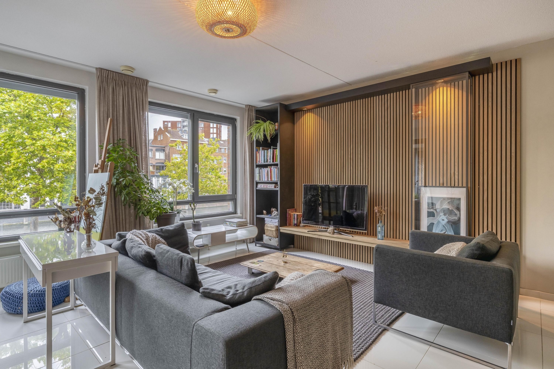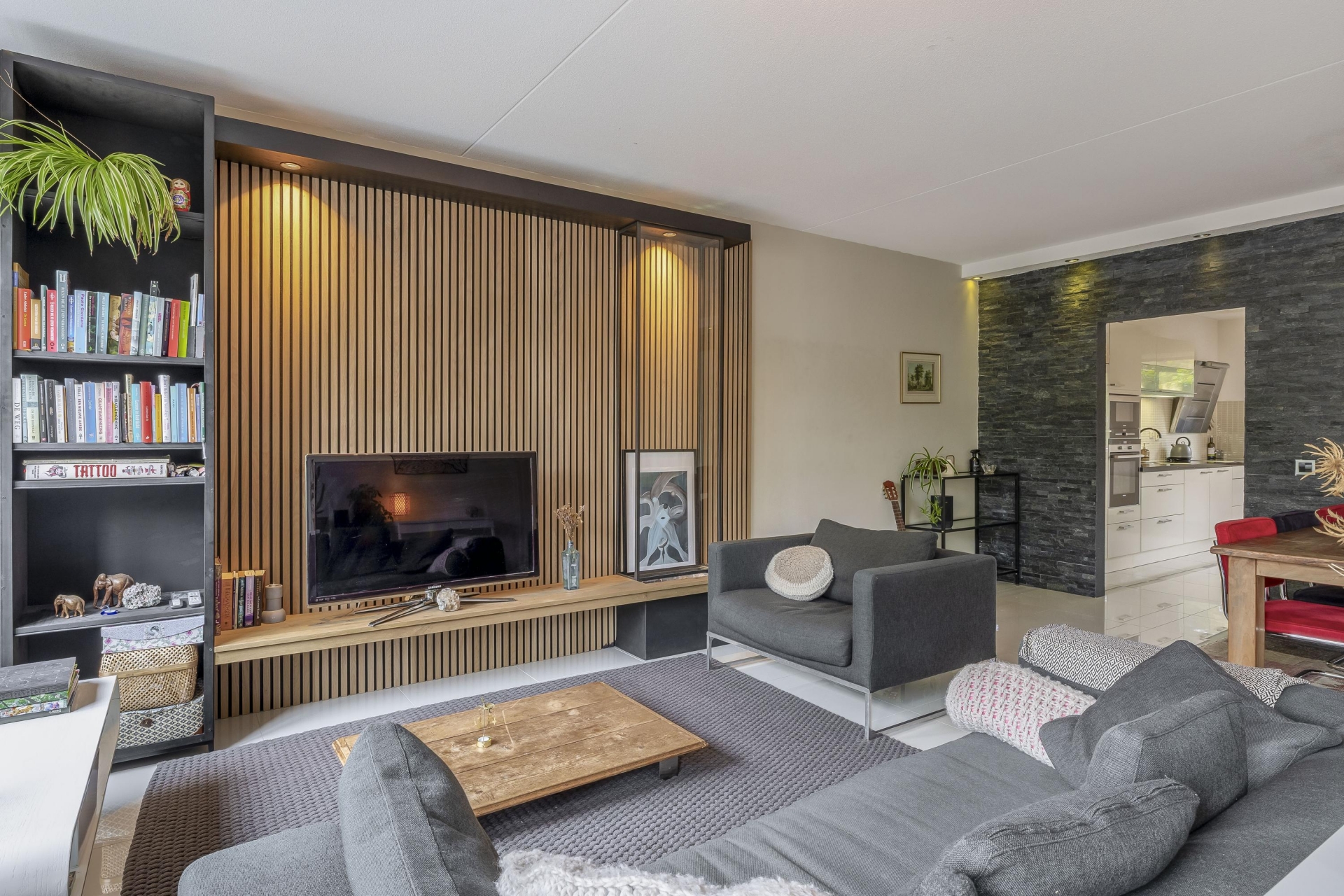 De woonkamer is een echte blikvanger. Grote raampartijen zorgen voor een overvloed aan daglicht, terwijl de woodup panelen direct warmte en sfeer brengen. De strakke plavuizen versterken de moderne uitstraling. De keuken sluit daar naadloos op aan: compleet met inbouwapparatuur en een praktische ontbijtbar waar je gezellig kunt aanschuiven.