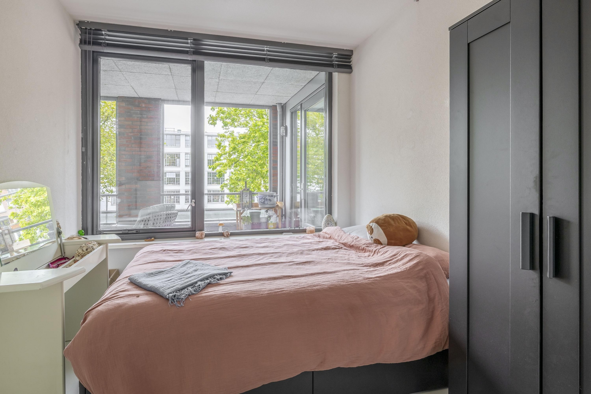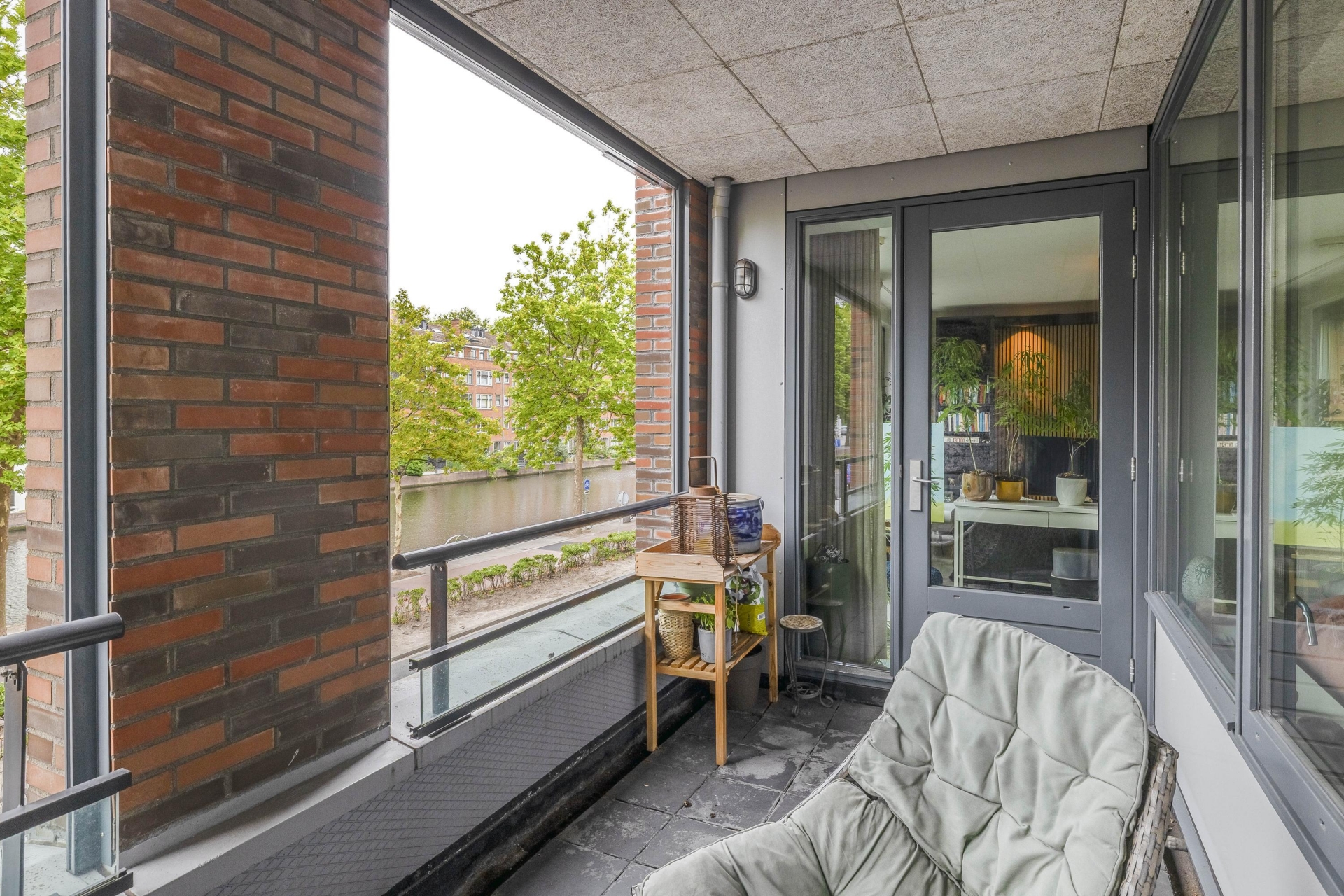 Het ruime balkon van ca. 10 m² is gelegen op het zuidwesten en biedt een heerlijk vrij uitzicht over de Delfshavense Schie. Dankzij de aanwezige screens heb je bovendien altijd controle over lichtinval en privacy. Dé plek om te genieten van de ochtendzon of een zomeravond.