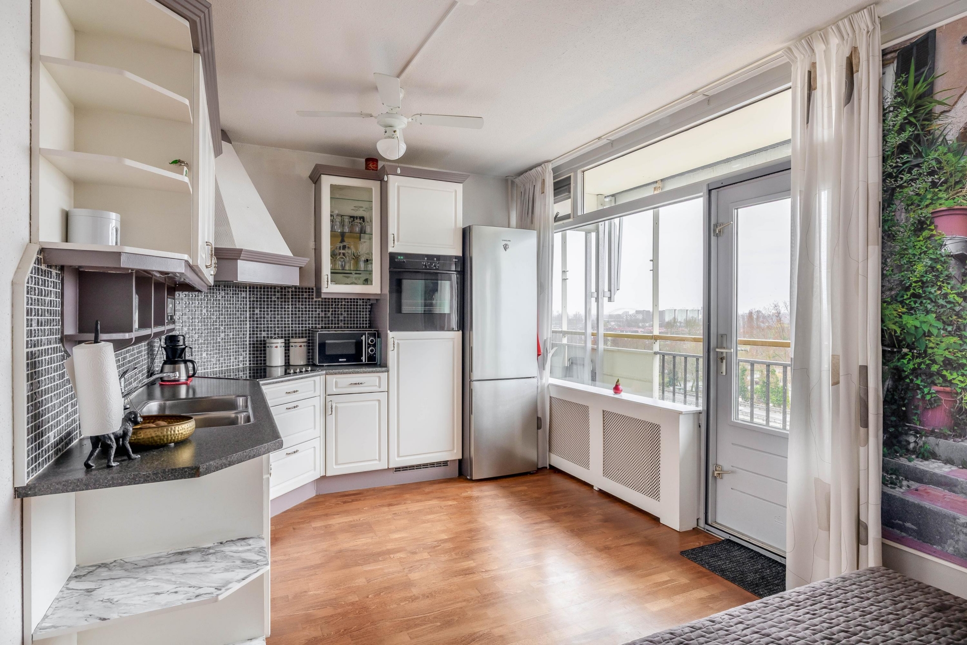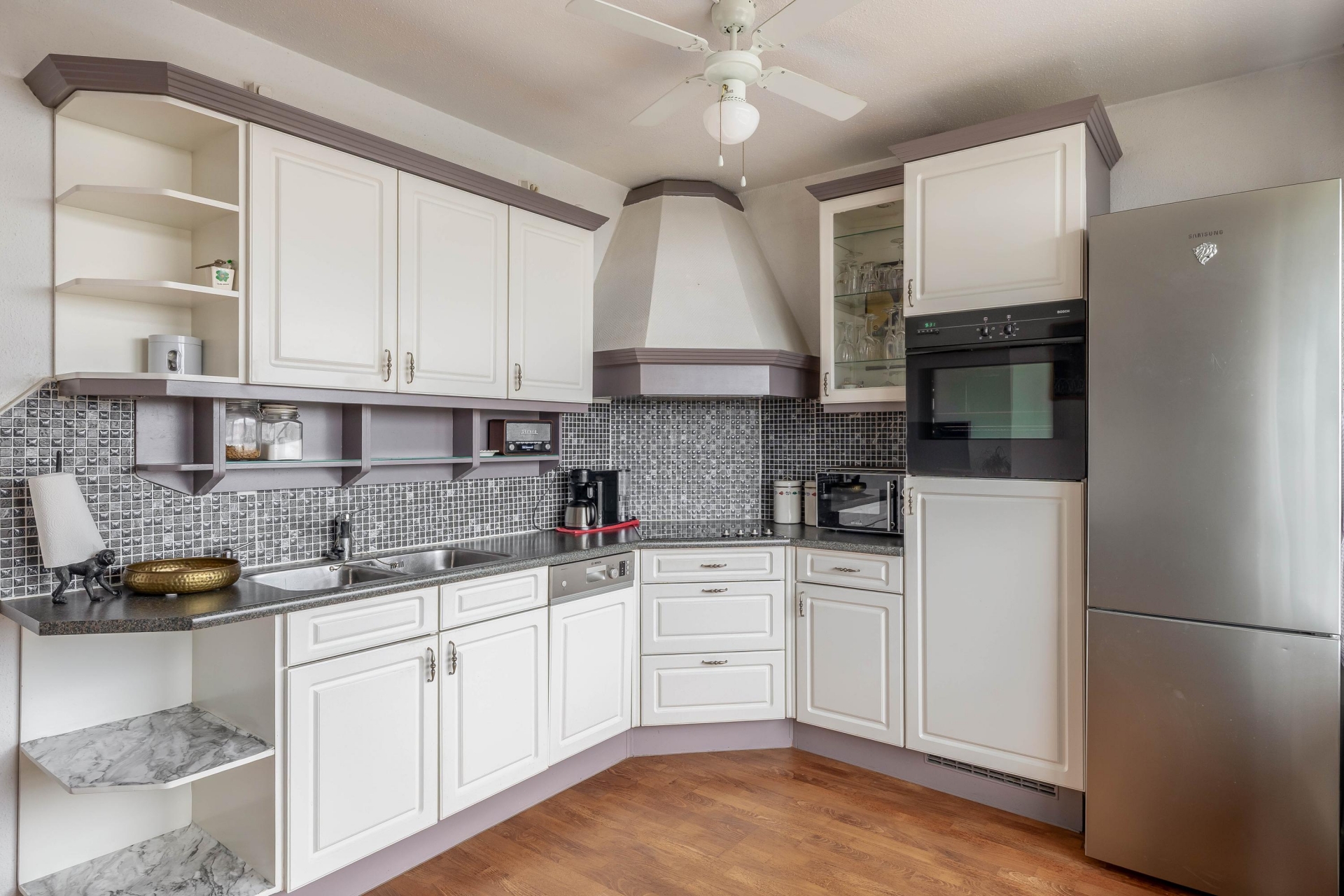 De keuken is ruim en functioneel ingericht, met voldoende werk- en opbergruimte. Door de slimme opstelling is er een fijne balans tussen koken en leefruimte. Ook hier zorgt het raam voor prettig lichtinval en een open gevoel. De keuken staat in direct contact met het balkon, wat het geheel extra prettig maakt in gebruik.