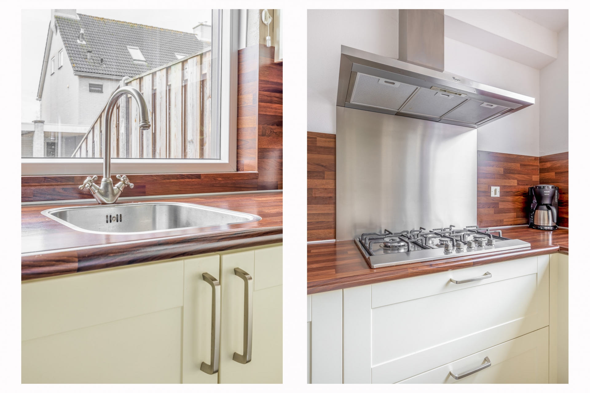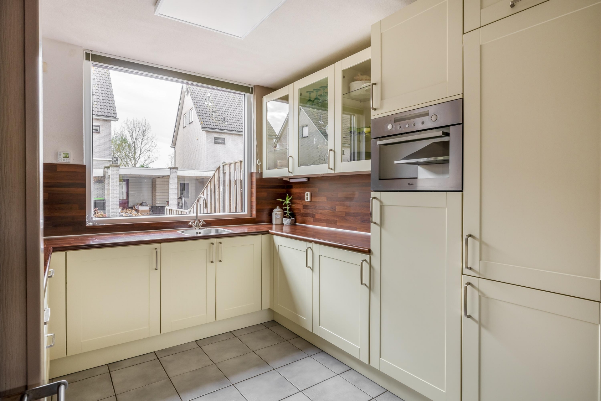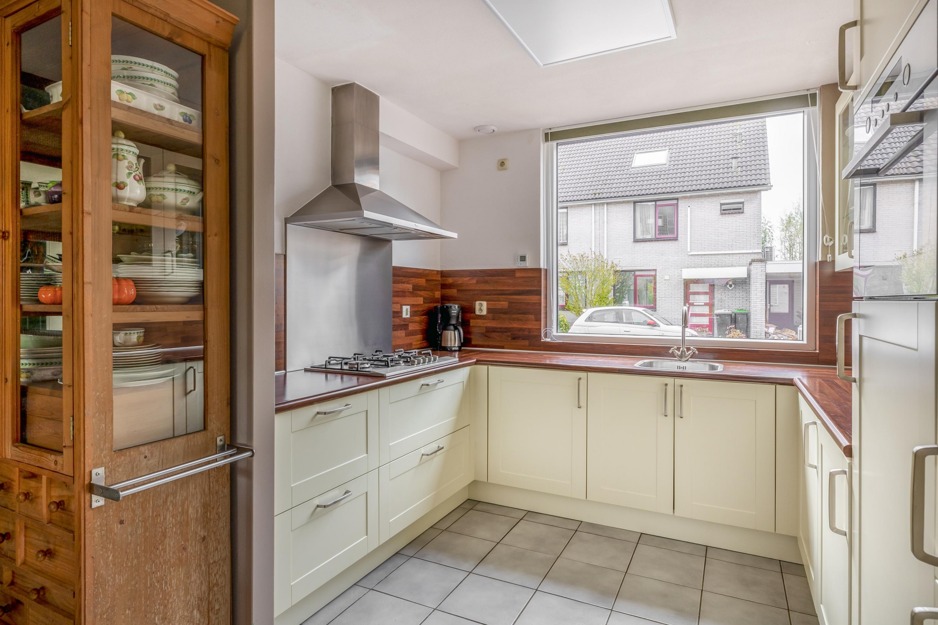 De open keuken aan de voorzijde is in een praktische hoekopstelling geplaatst, voorzien van diverse inbouwapparatuur o.a. gaskookplaat, afzuigkap, combi-oven en veel kastruimte. Je kijkt hier vrij uit over de straat, met zicht op je eigen parkeerplaats. De keuken is netjes afgewerkt en in lichte kleurstelling uitgevoerd, waardoor het geheel ruimtelijk aanvoelt.