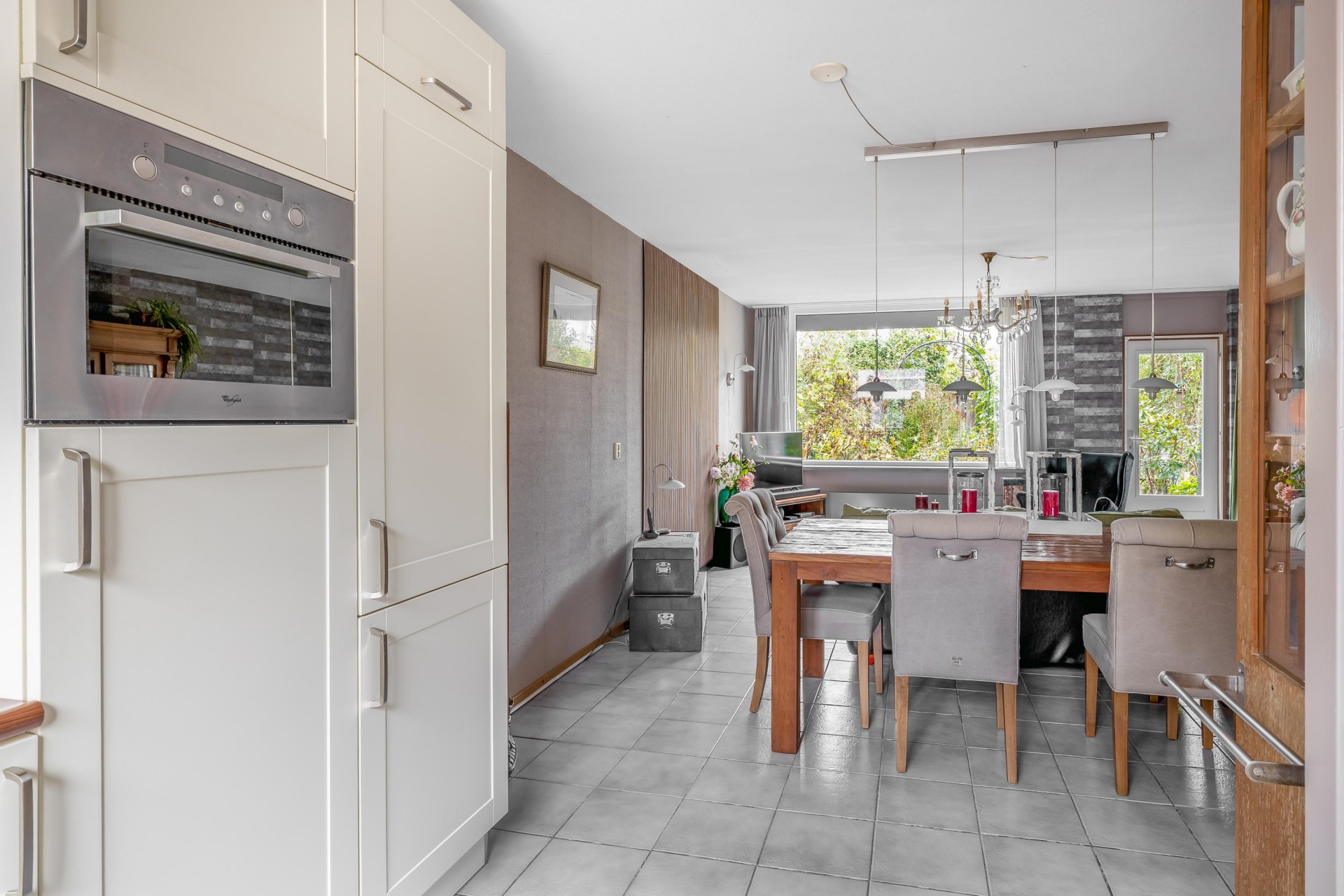 De woonkamer is tuingericht en heeft dankzij de grote raampartijen een mooie lichtinval. Er is voldoende ruimte voor een royale zithoek en een gezellige eethoek. De vloer is neutraal betegeld en vormt samen met de lichte wandafwerking een rustige basis. Via de achterdeur stap je zo de tuin in.