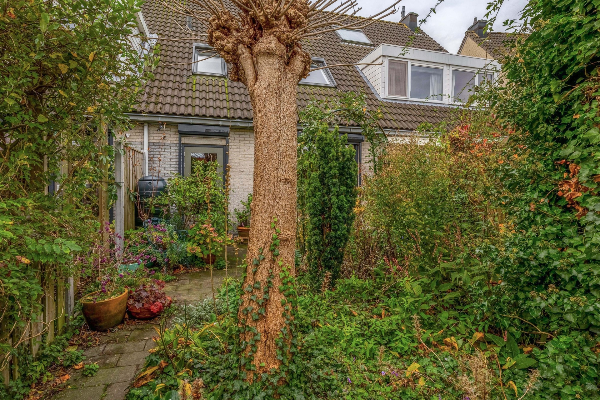 De achtertuin is natuurlijk aangelegd en biedt verrassend veel privacy door het vele groen. Dankzij de diepte van bijna 10 meter is er altijd wel een plekje in de zon of schaduw te vinden. De ligging op het noordoosten betekent dat je ’s ochtends en aan het begin van de middag kunt genieten van de zon. Achterin de tuin staat een vrijstaande stenen berging met elektra – ideaal voor je fiets of tuinspullen – en via de achterom loop je zo naar het achterpad.