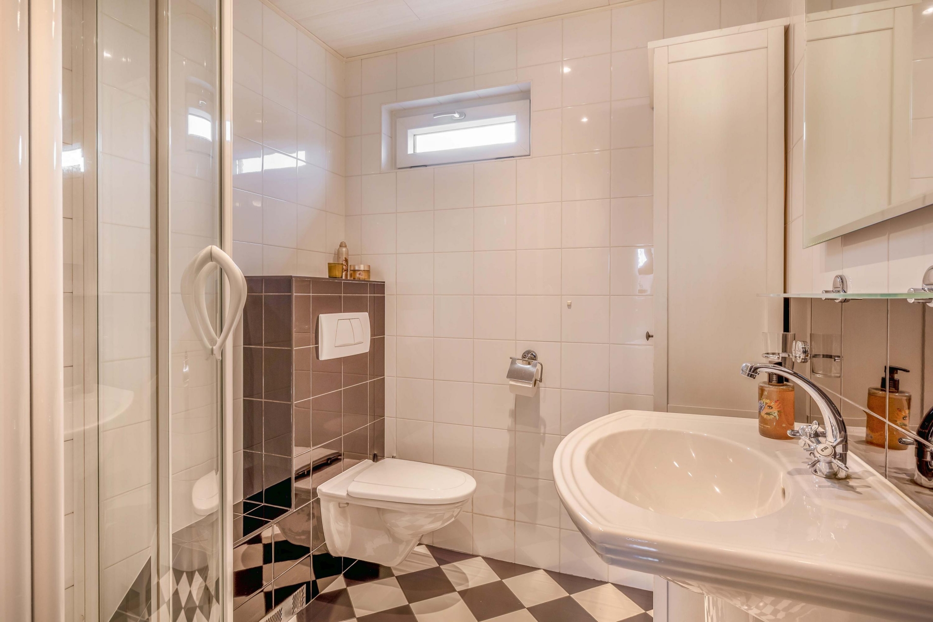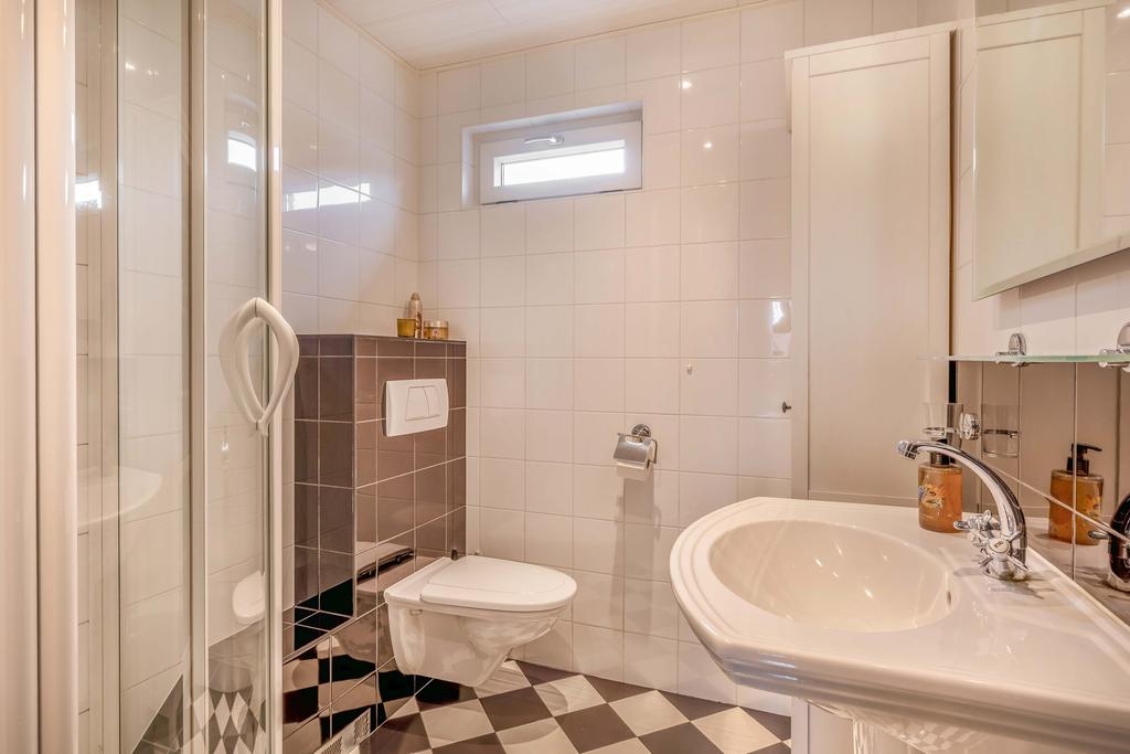 De badkamer is compact maar compleet, met een douchecabine, toilet en wastafelmeubel. Alles is keurig betegeld in een lichte kleurstelling en goed onderhouden.