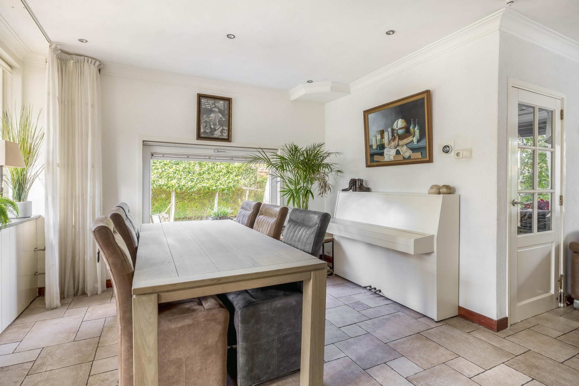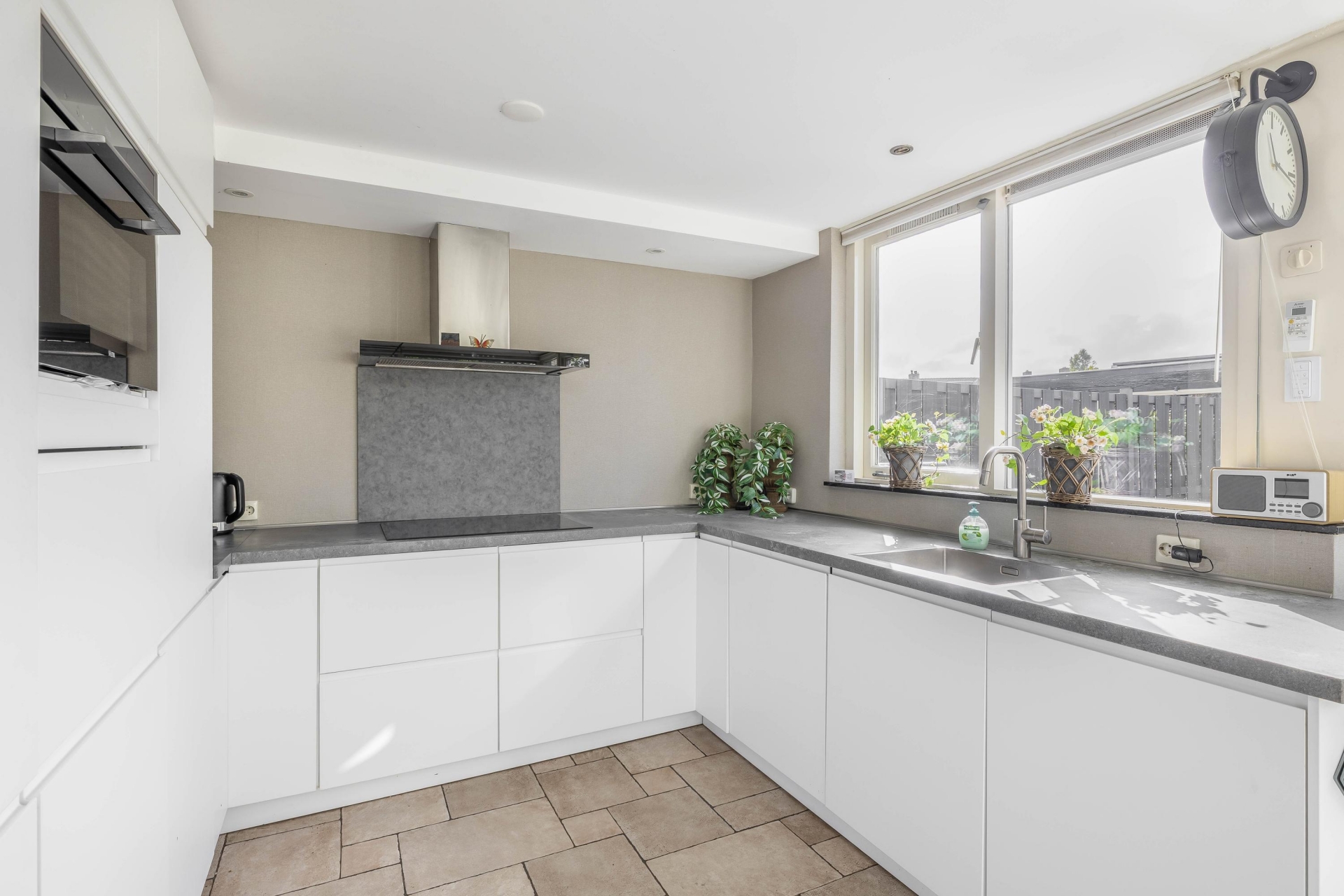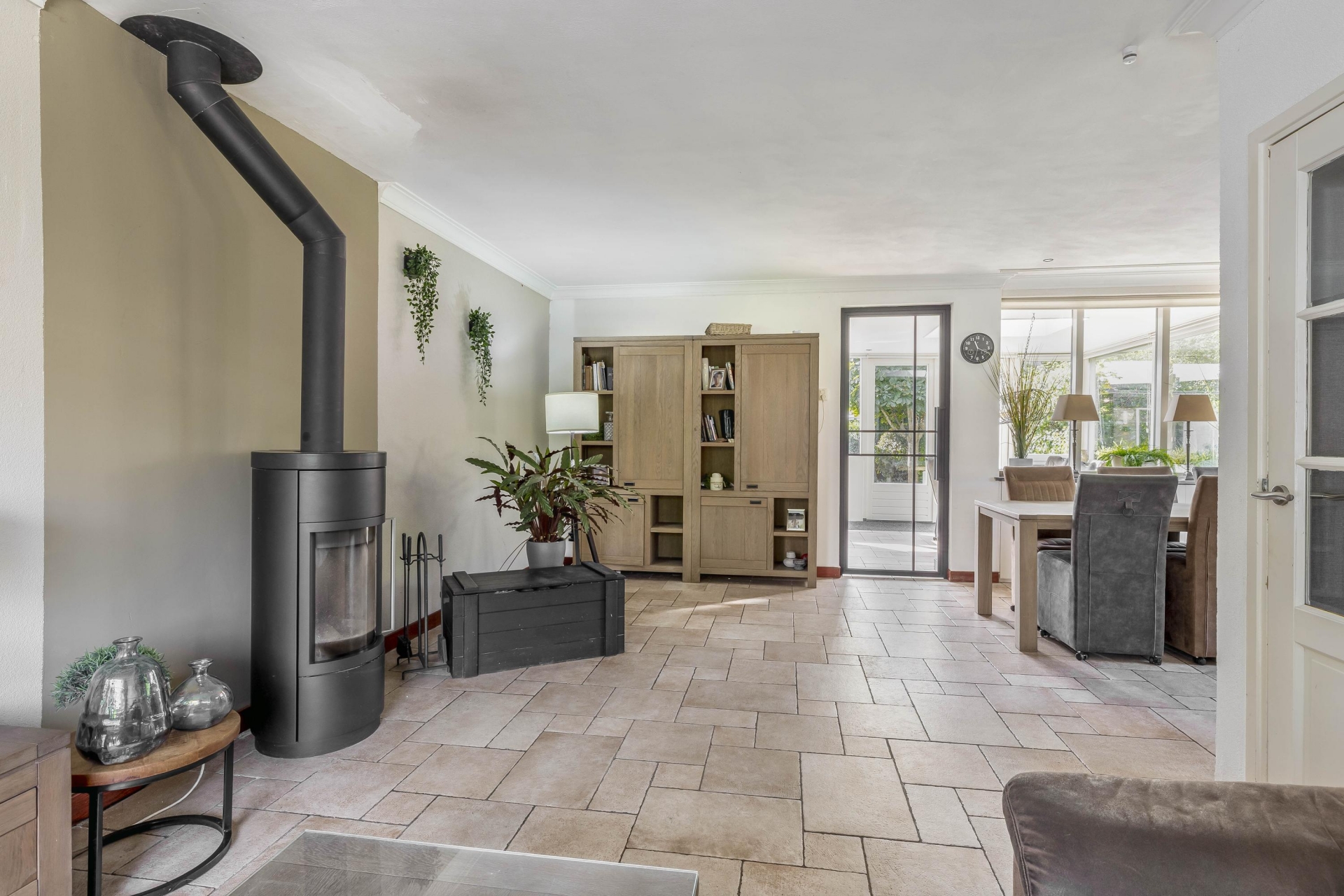 Zodra je de woonkamer binnenkomt, valt meteen het fijne licht op dat via de grote ramen naar binnen stroomt. De sfeervolle zithoek bij het raam kijkt uit op het groen voor de deur en is de ideale plek om te ontspannen. De open keuken in de uitbouw is strak afgewerkt en biedt volop ruimte om te koken én samen te eten. De combinatie van het landelijke houten eetgedeelte, de moderne witte keukenopstelling, veel werkruimte én lichtinval via het plafondraam maakt dit echt een plek waar je graag samenkomt. Vanuit de keuken heb je direct zicht op en toegang tot de tuin – perfect voor zomerse etentjes of een koffiemomentje in de zon.
