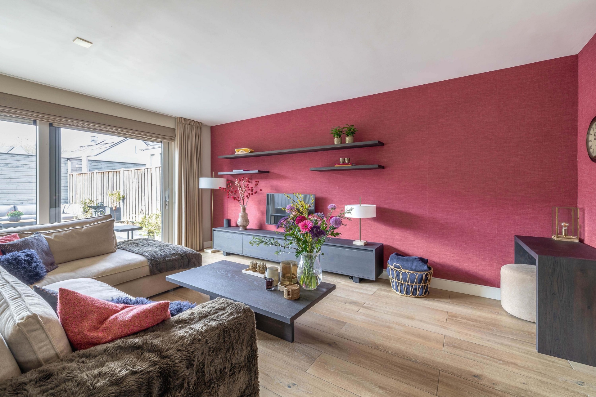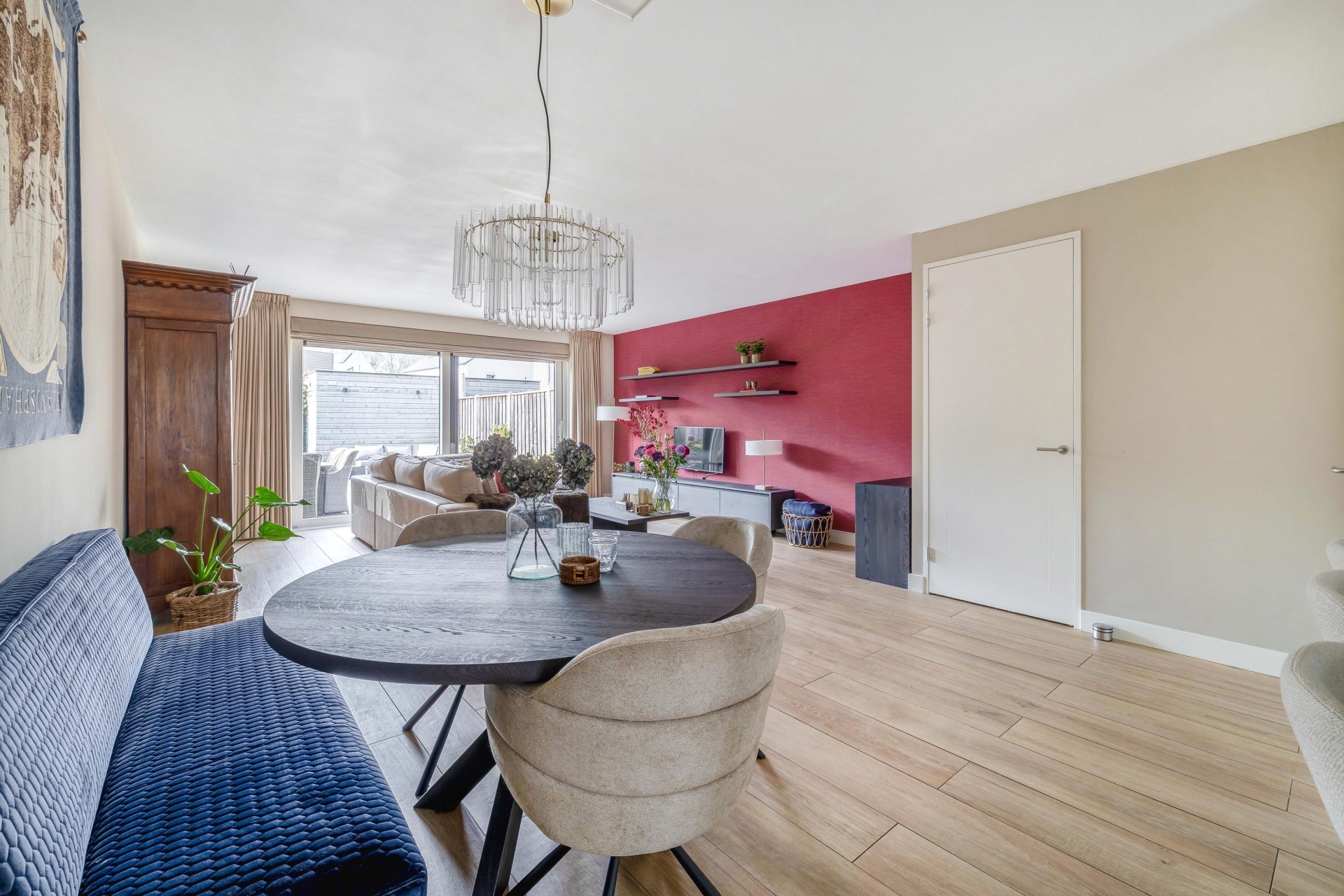 Via de ruime hal met meterkast en modern toilet betreed je de woonkamer. De uitgebouwde living biedt volop leefruimte en is afgewerkt met een fraaie plavuizenvloer voorzien van vloerverwarming. Dankzij de grote schuifpui geniet je hier van veel lichtinval en sta je in directe verbinding met de achtertuin.