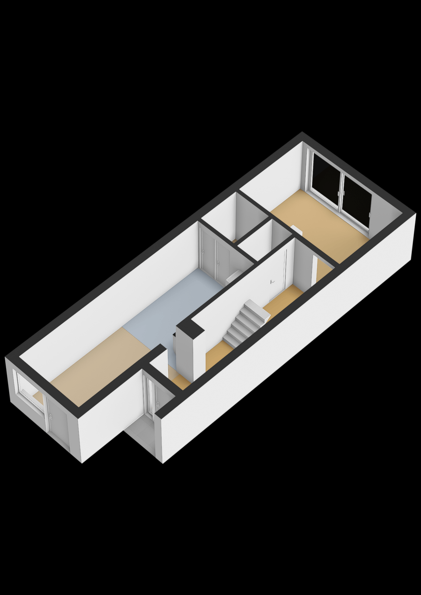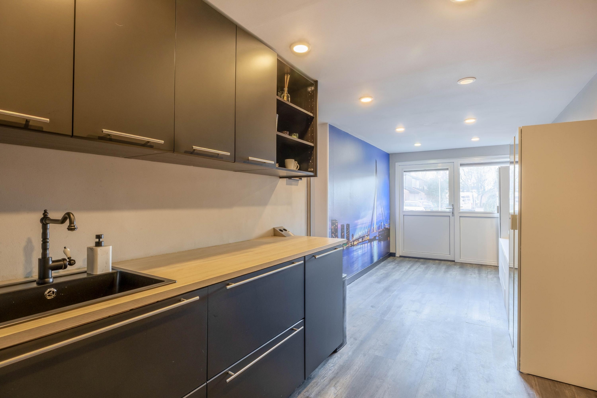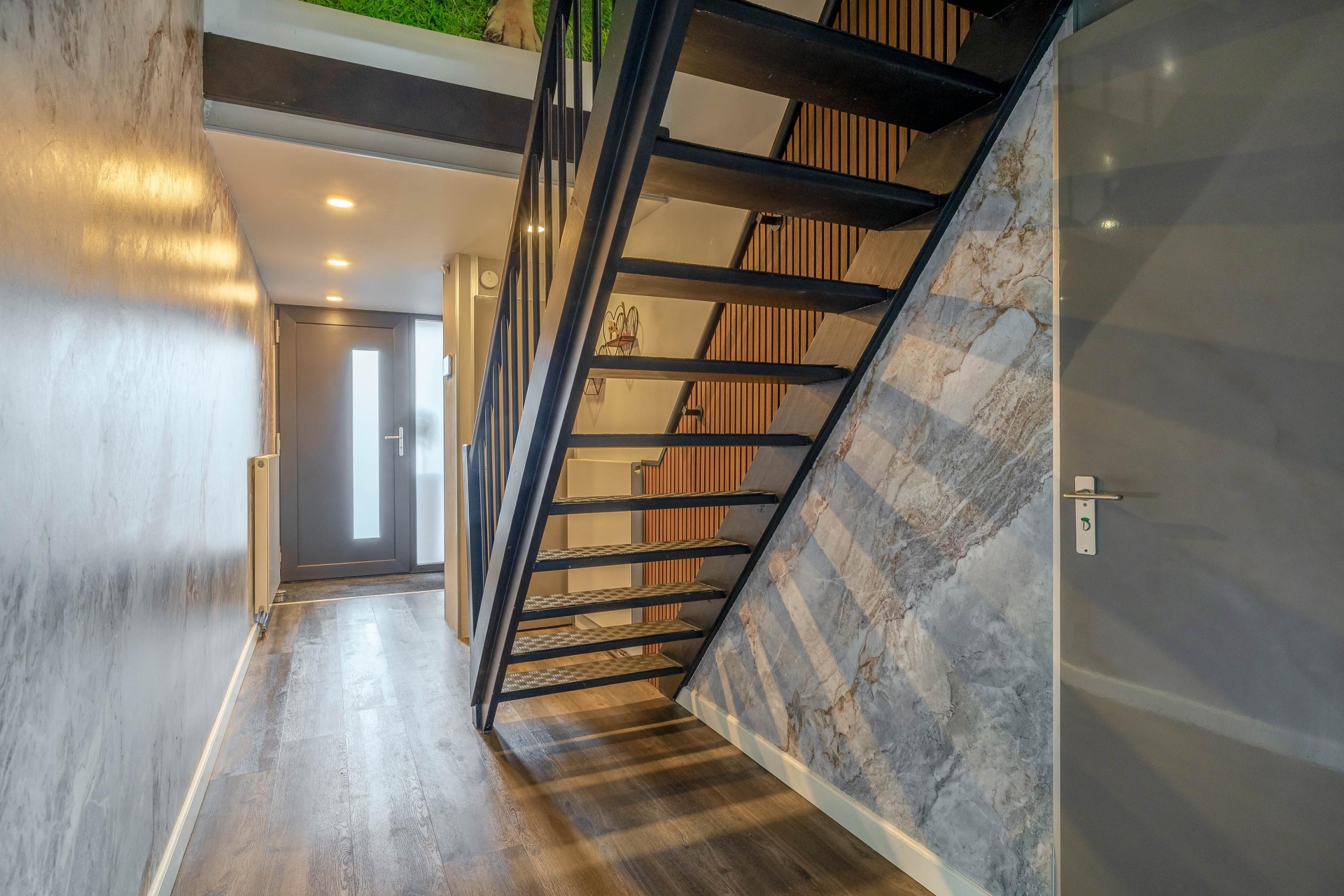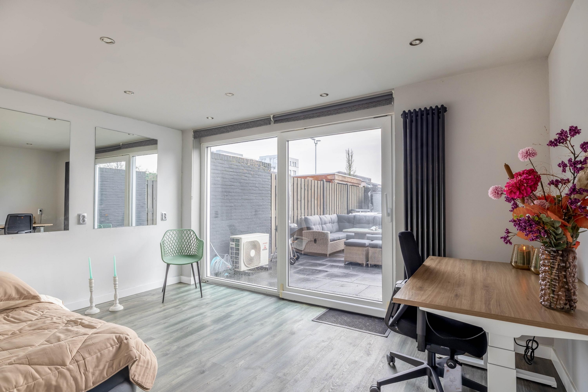 Dit huis is oorspronkelijk gebouwd als drive-in woning en dat merk je aan de praktische en veelzijdige indeling. Op de begane grond kom je binnen in een ruime hal met modern toilet. Aan de voorzijde bevindt zich een grote kamer met een eigen entree. Deze ruimte is voorzien van een praktisch keukenblok en leent zich perfect als thuiskantoor, praktijkruimte of salon aan huis, maar kan net zo goed worden gebruikt als woon- of slaapkamer. Aan de achterzijde ligt de tuinkamer met een brede schuifpui naar de achtertuin. Dankzij de strakke wandafwerking, inbouwverlichting en pvc vloer voelt deze verdieping direct verzorgd aan.