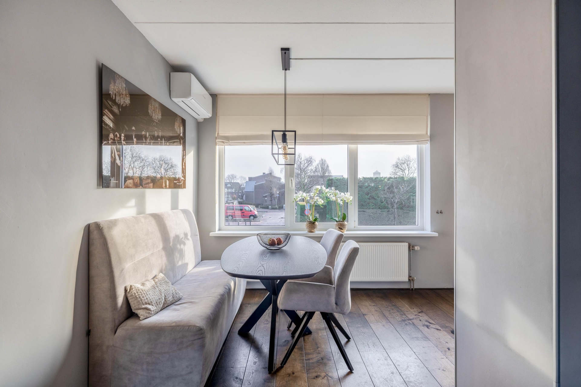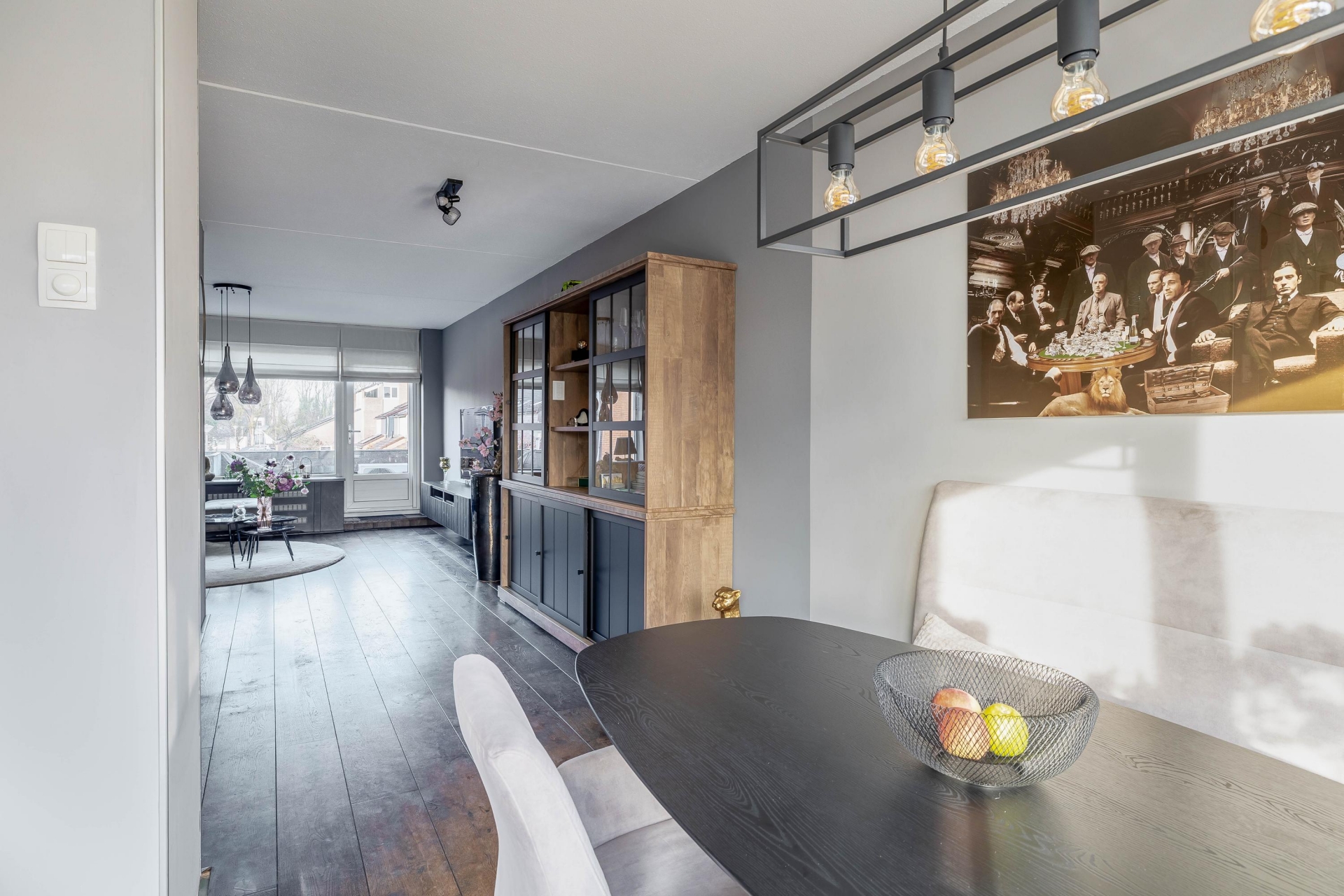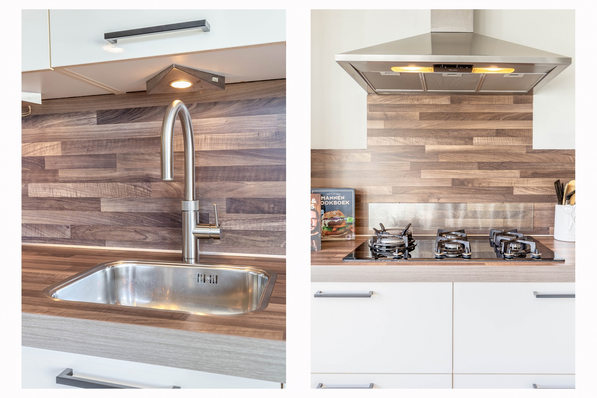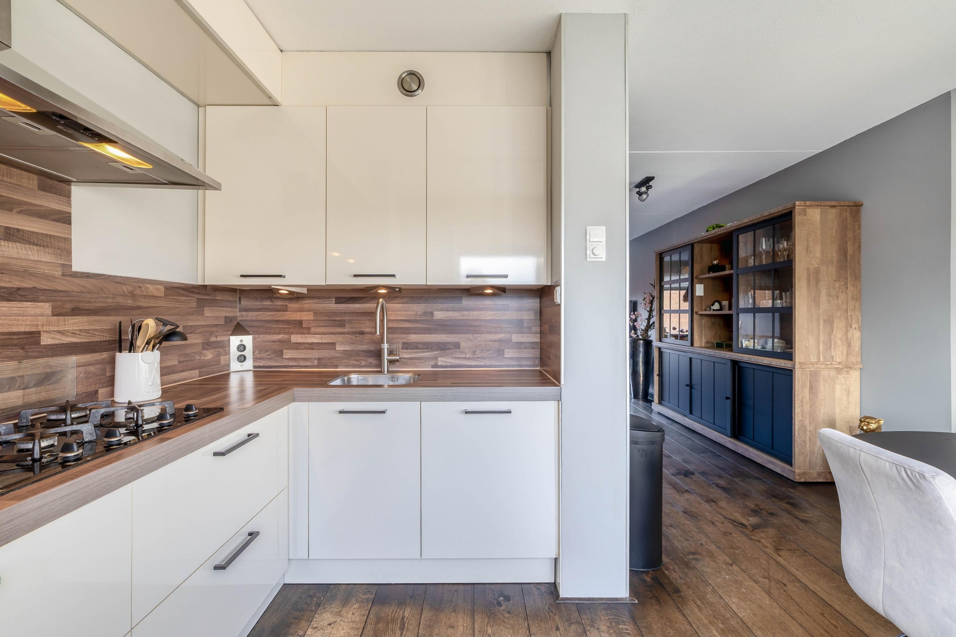 De eerste verdieping is de echte leefverdieping. Hier vind je een diepe woonkamer met een warme houten vloer en veel lichtinval. Doordat je op hoogte woont, heb je een vrijer uitzicht en stap je vanuit de woonkamer zo het balkon aan de voorzijde op, gelegen op het westen. Een heerlijke plek om na het werk nog even van de zon te genieten. Aan de achterzijde ligt de open keuken in hoekopstelling. Deze is voorzien van onder andere een 5-pits gasfornuis met wokbrander, oven, koelkast, vaatwasser en een Quooker. Een fijne, centrale plek waar koken en samenzijn samenkomen.