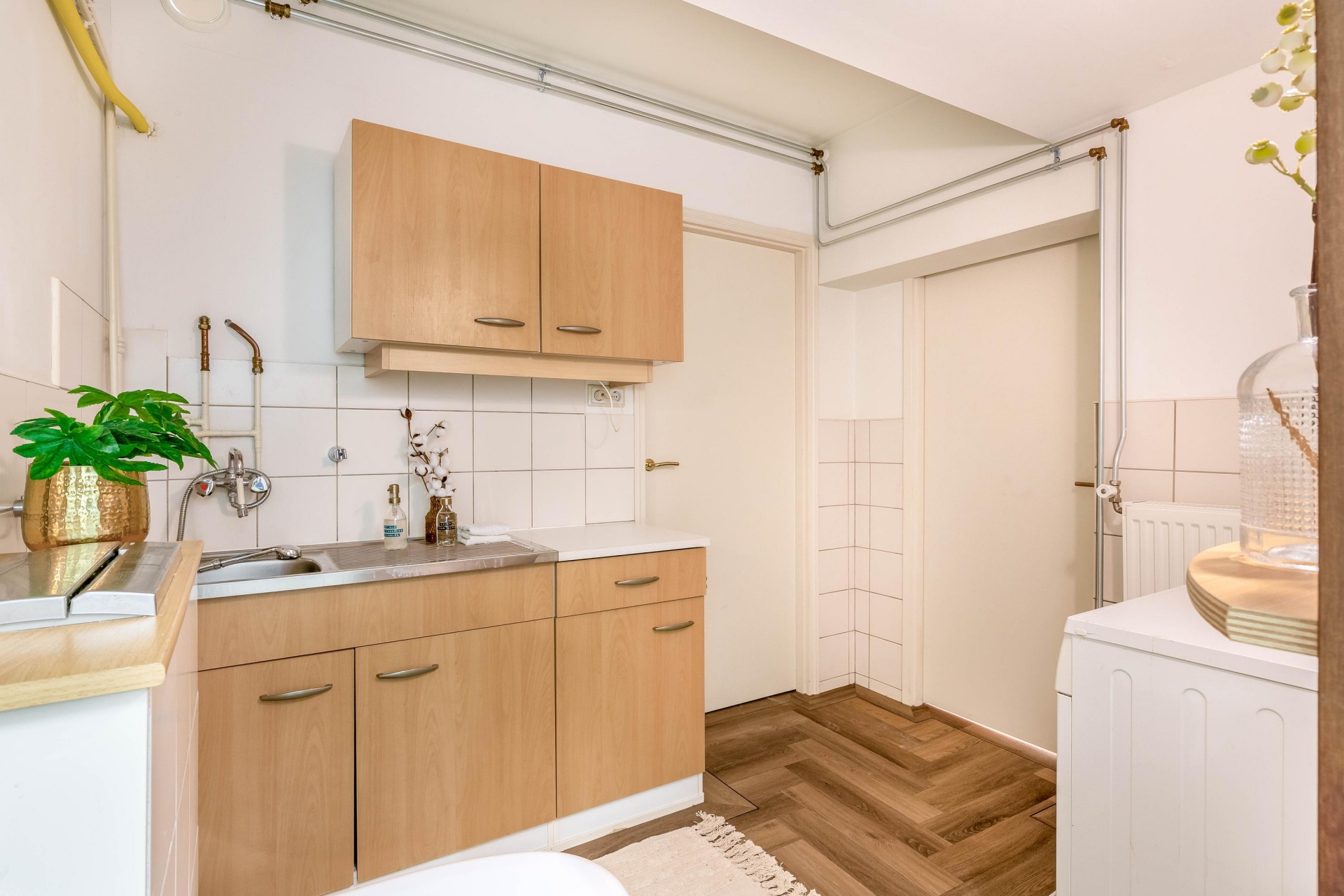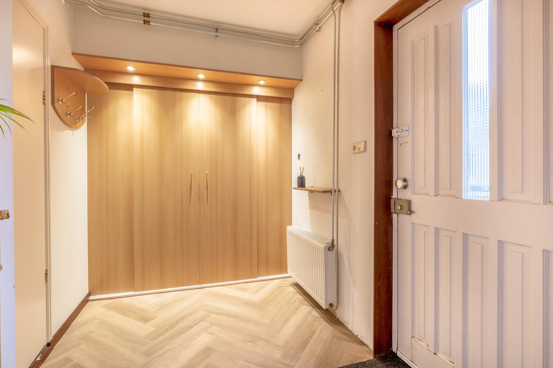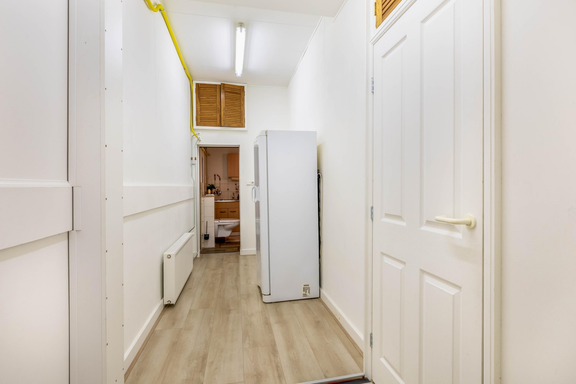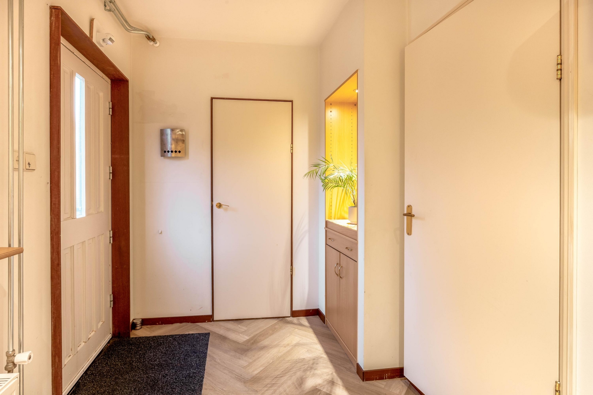 Je komt binnen op de begane grond. In de hal vind je aan de rechterzijde een praktische inbouwkast met een nette PVC-visgraatvloer. Aan de linkerkant ligt een tussenkamer, ideaal als werkplek, speelruimte of extra berging. Ook bevind de trap naar boven hier zich. Vanuit de tussenkamer loop je door naar de woonkamer aan de achterzijde. Ook beschikt de begane grond een tweede hal met inbouwkast, een berging én toegang tot de bijkeuken. Hier vind je ook het toilet, praktische wasmachineaansluiting en extra berging.