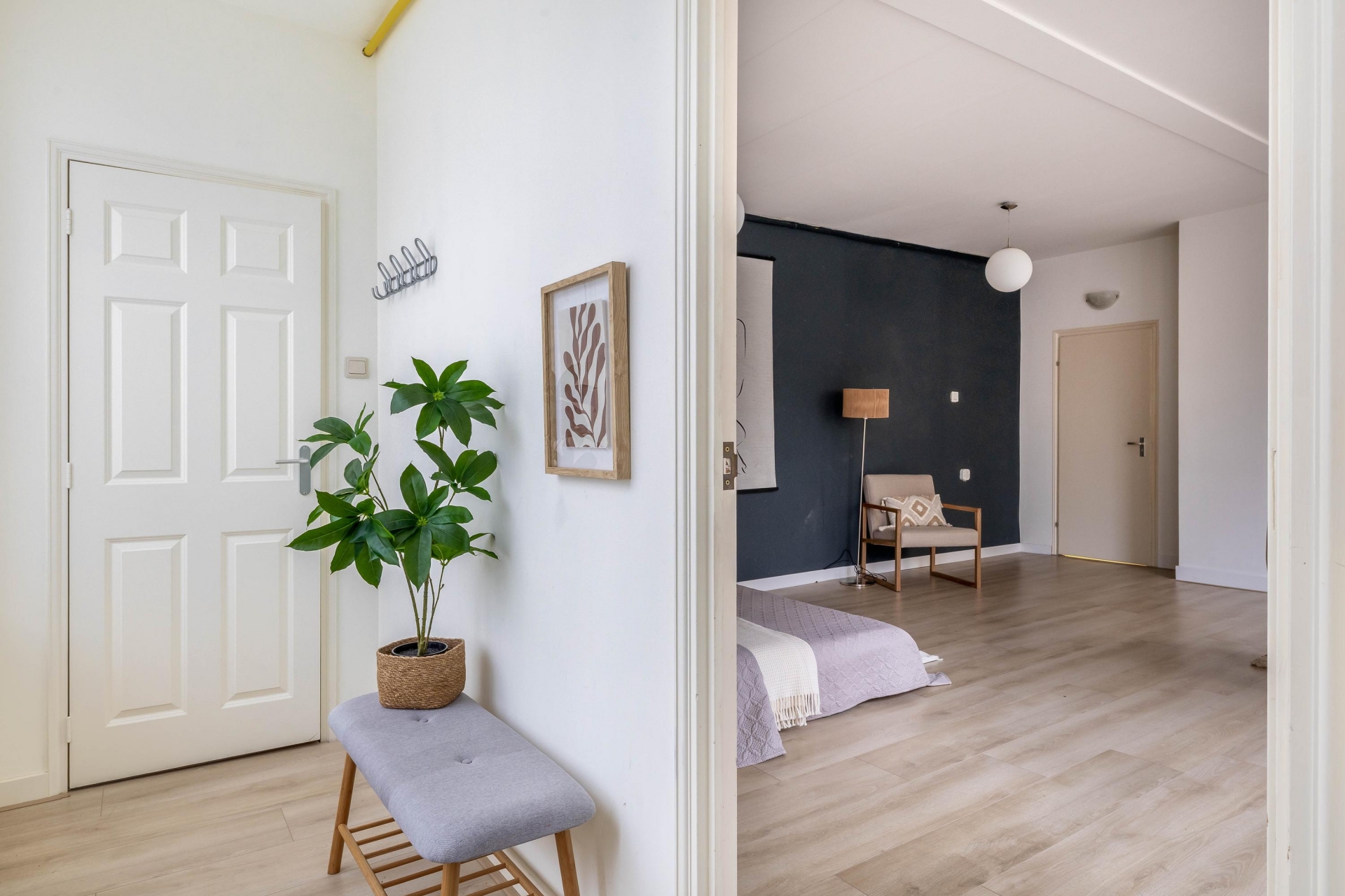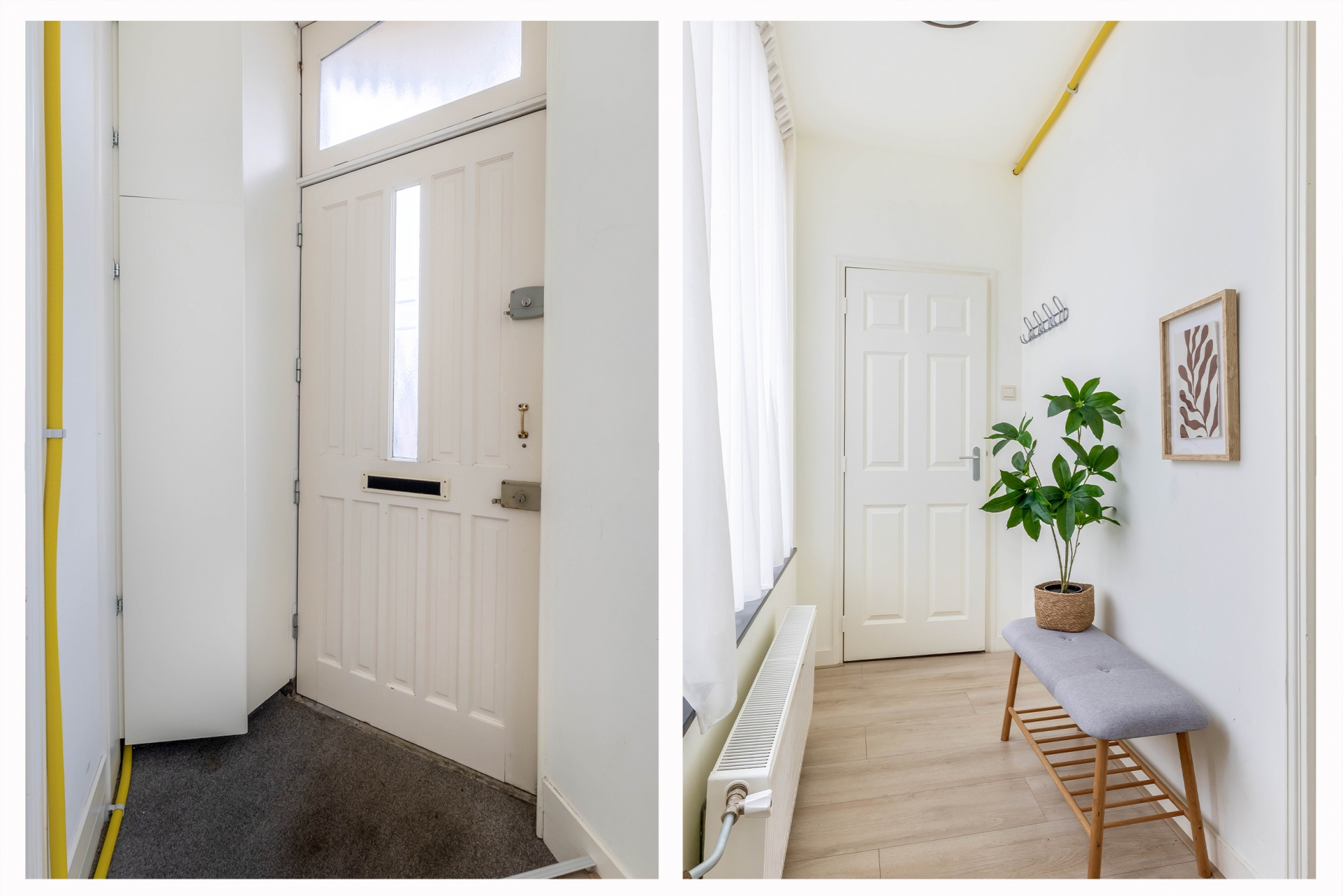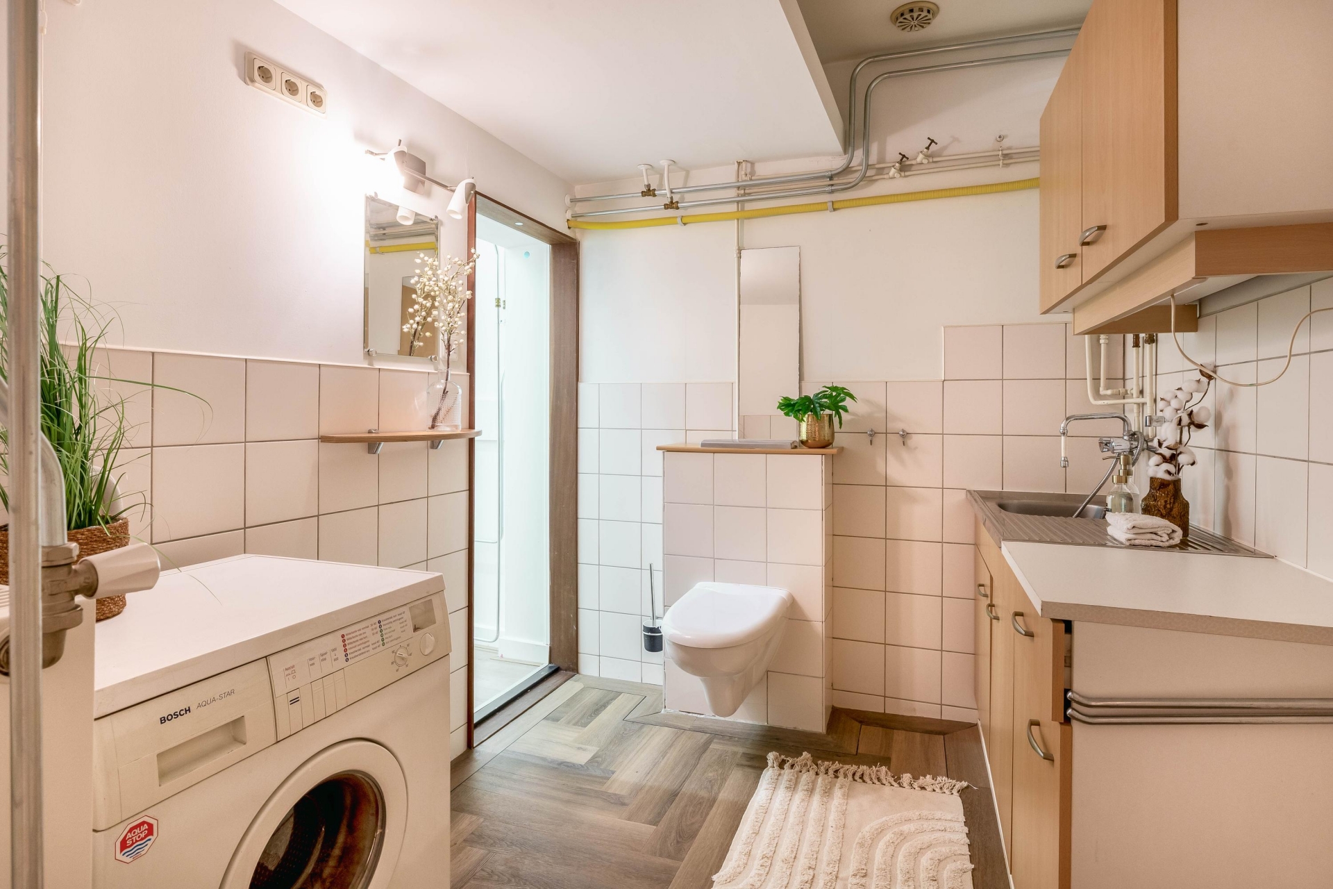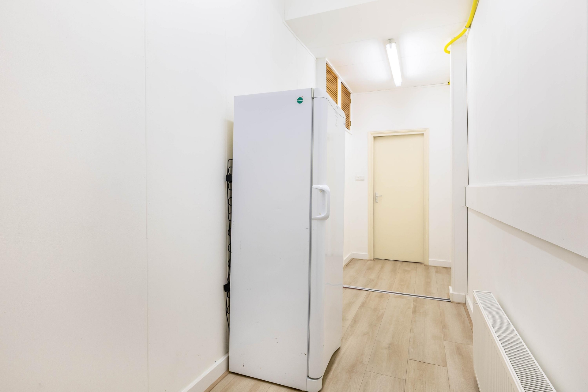 Je komt binnen op de begane grond. In de hal vind je aan de rechterzijde een praktische inbouwkast met een nette PVC-visgraatvloer. Aan de linkerkant ligt een tussenkamer, ideaal als werkplek, speelruimte of extra berging. Ook bevind de trap naar boven hier zich. Vanuit de tussenkamer loop je door naar de woonkamer aan de achterzijde. Ook beschikt de begane grond een tweede hal met inbouwkast, een berging én toegang tot de bijkeuken. Hier vind je ook het toilet, praktische wasmachineaansluiting en extra berging.