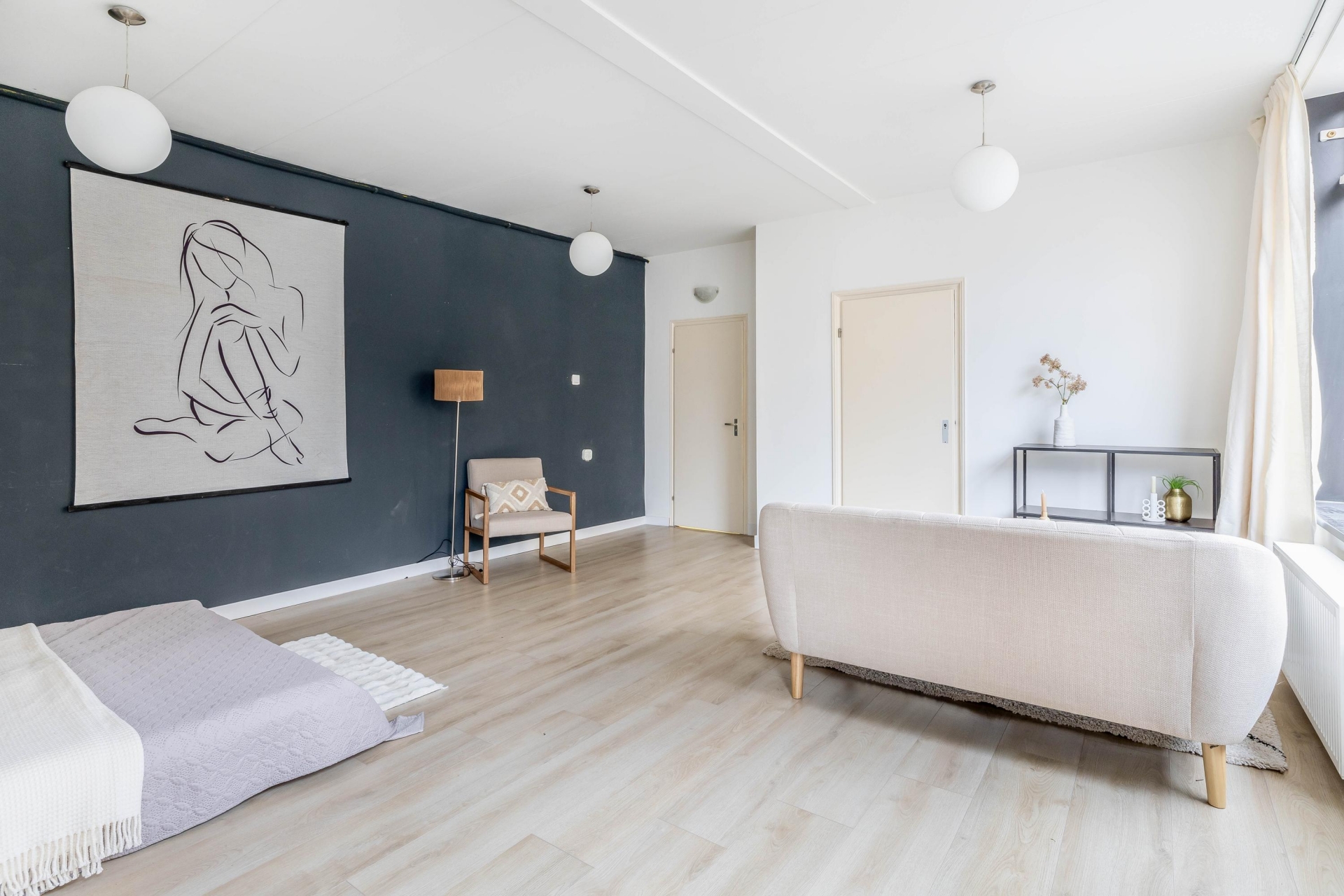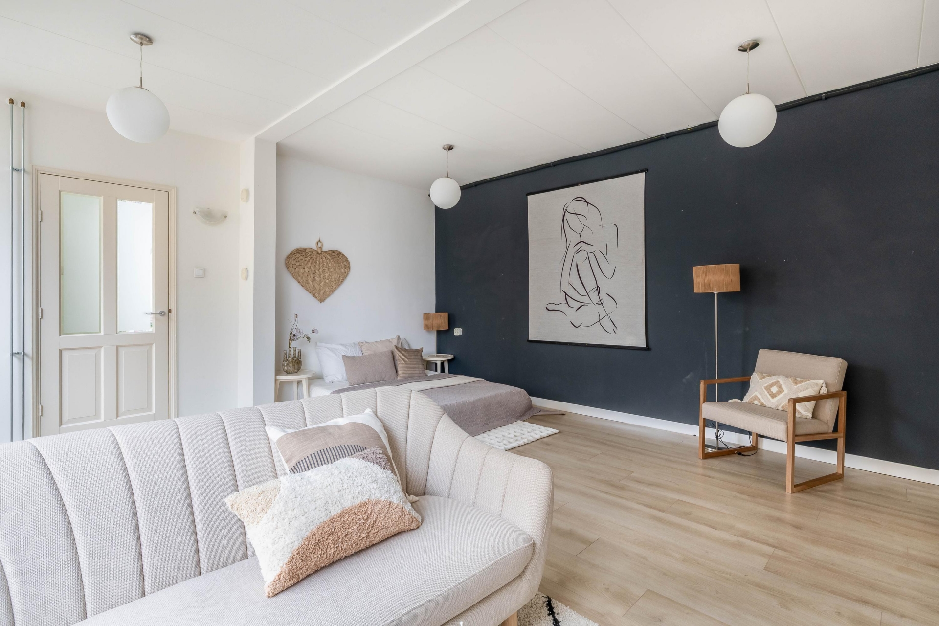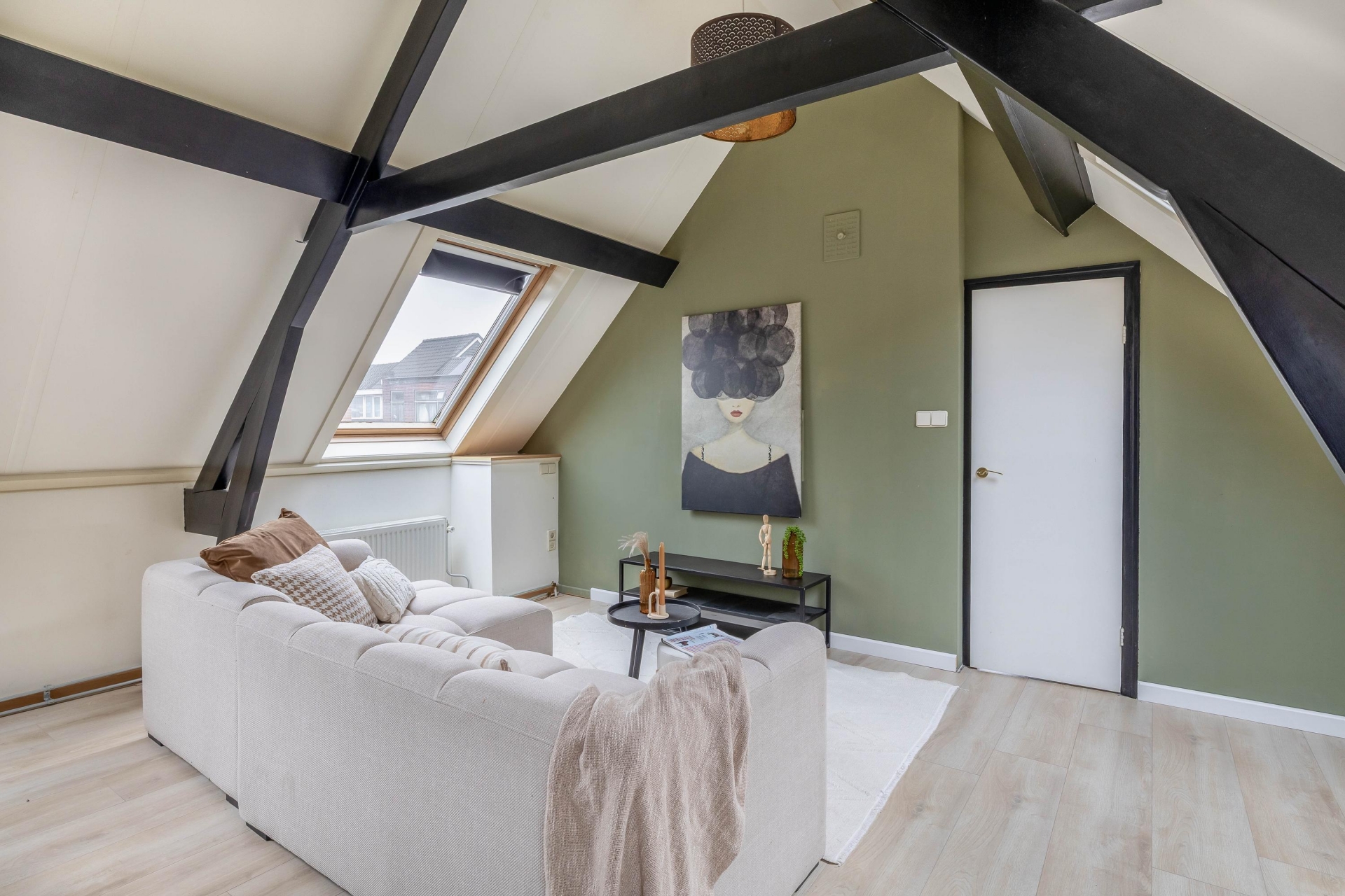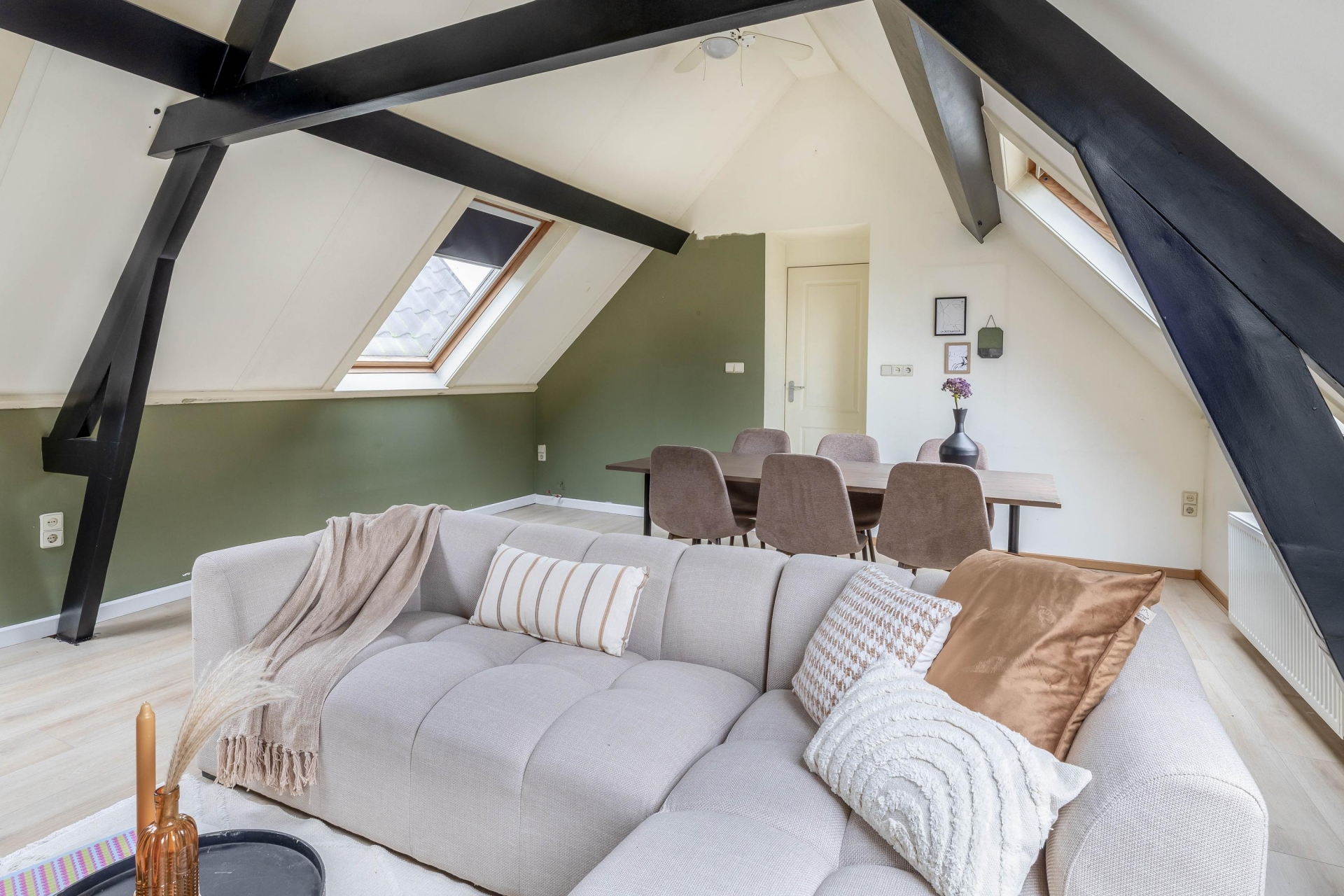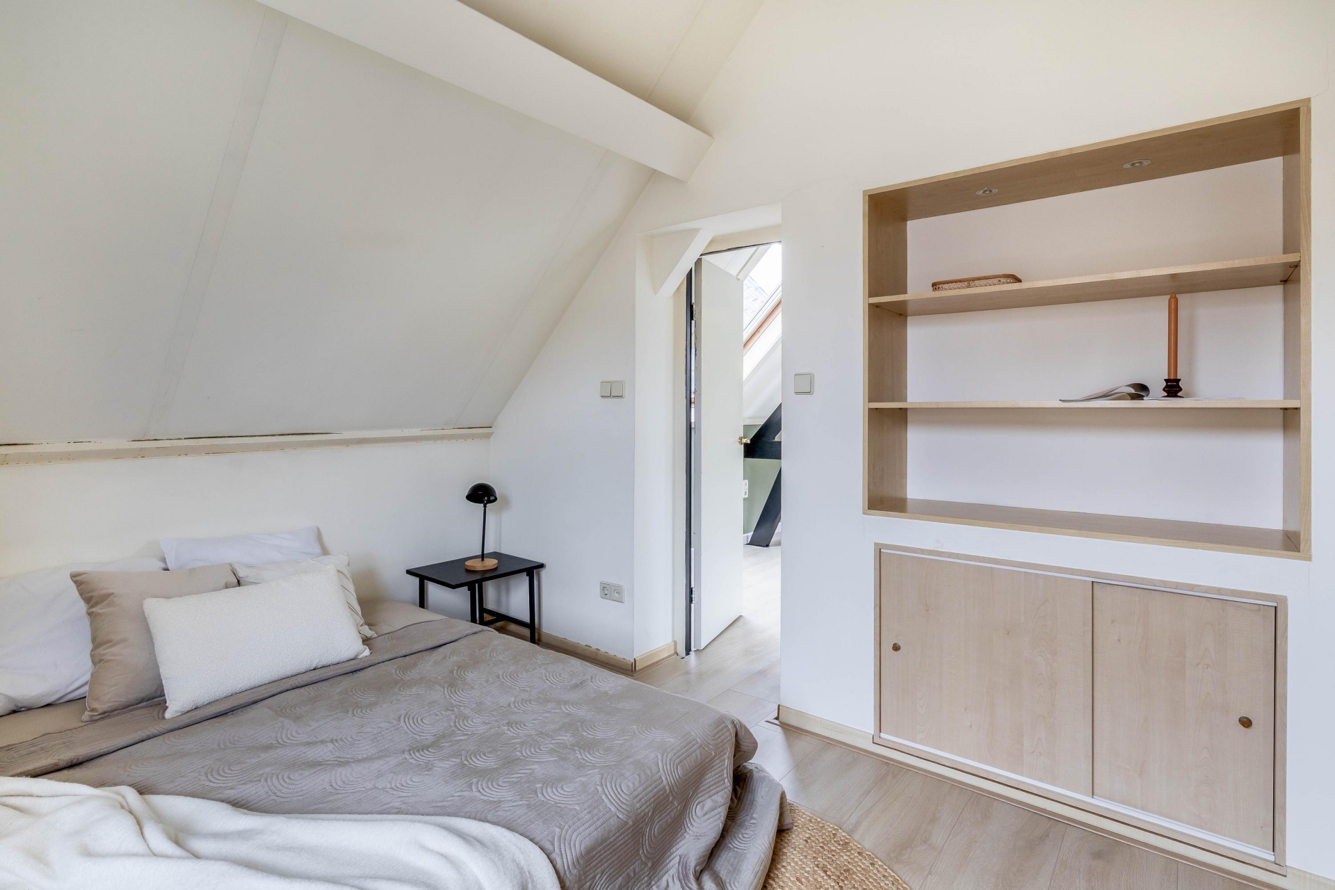 Aan deze verdieping grenst ook de badkamer, voorzien van een toilet, badkamermeubel en douchecabine. De afwerking met houten kozijnen en enkel glas geeft de ruimte een authentiek tintje. In de woonkamer op deze verdieping zorgen vier dakramen voor volop licht en sfeer. Aan de achterzijde vind je een royale slaapkamer met grote inbouwkast, ideaal als master bedroom. De gehele verdieping is afgewerkt met laminaatstroken.