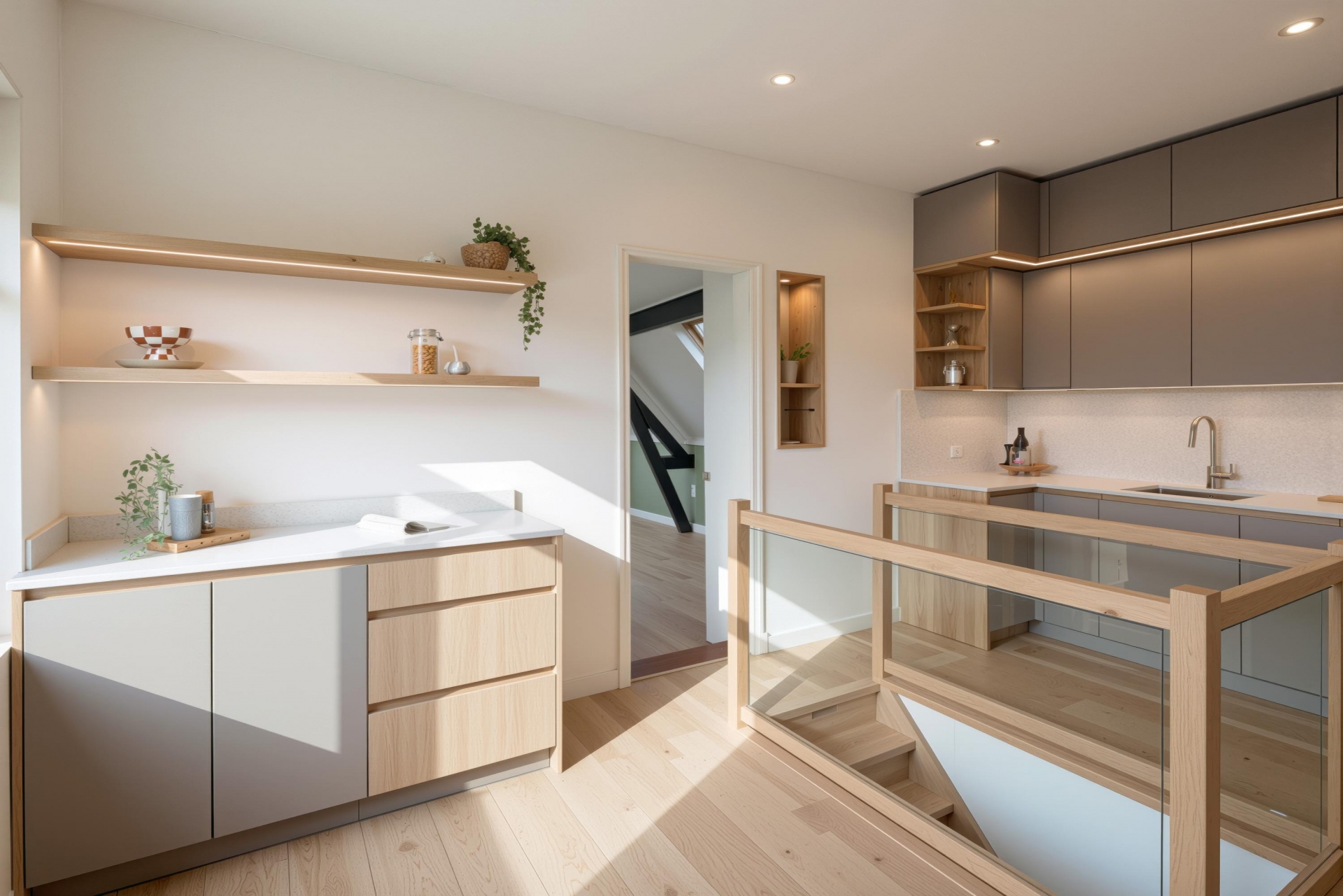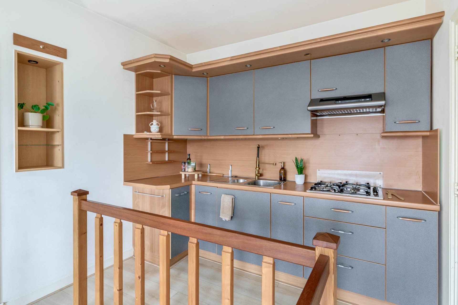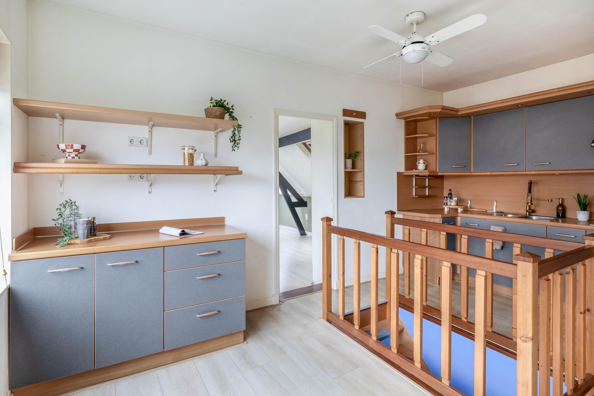 De eerste verdieping is verrassend ingedeeld en ademt sfeer. De ruime overloop biedt toegang tot een tweede keuken, voorzien van een 4-pits gaskookplaat en volop ruimte om gezellig te koken. Vanuit hier stap je zo het terras op, gelegen op het noordoosten. Perfect voor een ontbijtje in de ochtendzon of een momentje voor jezelf later op de dag.