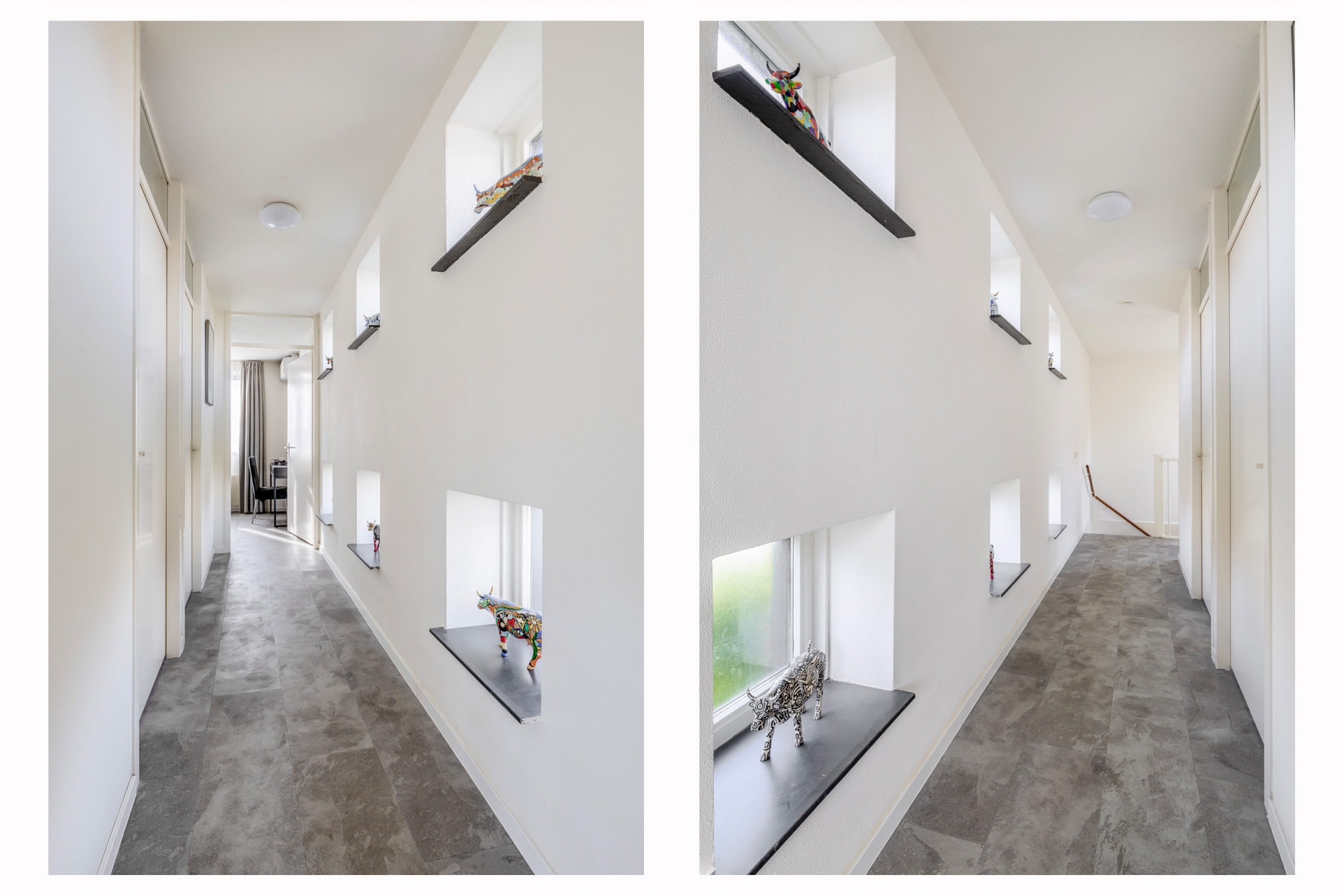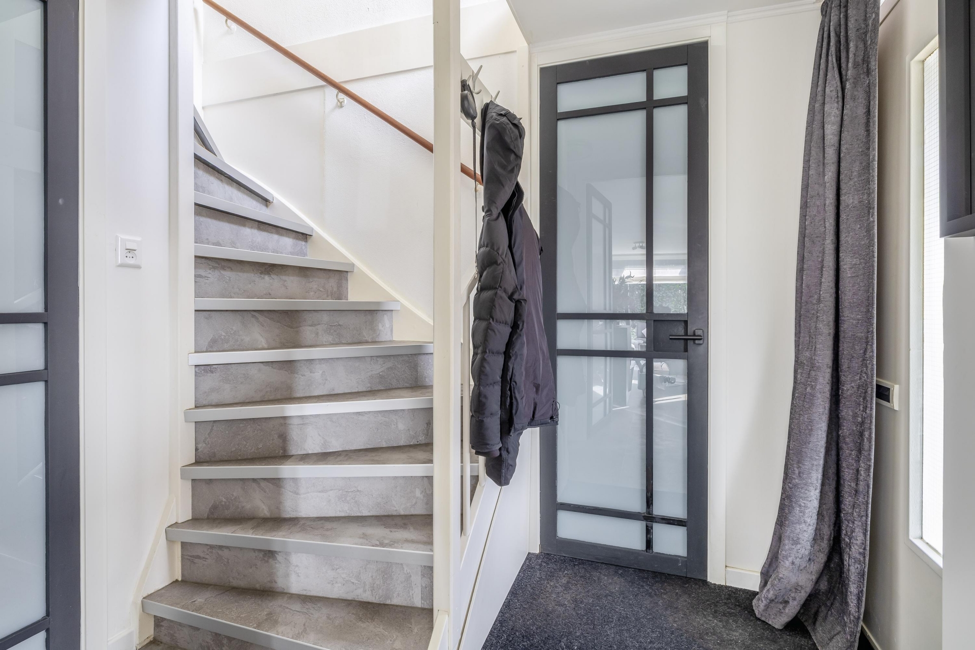 Eenmaal binnen komen we in de hal waar vandaan toegang tot toilet, living en trapopgang.