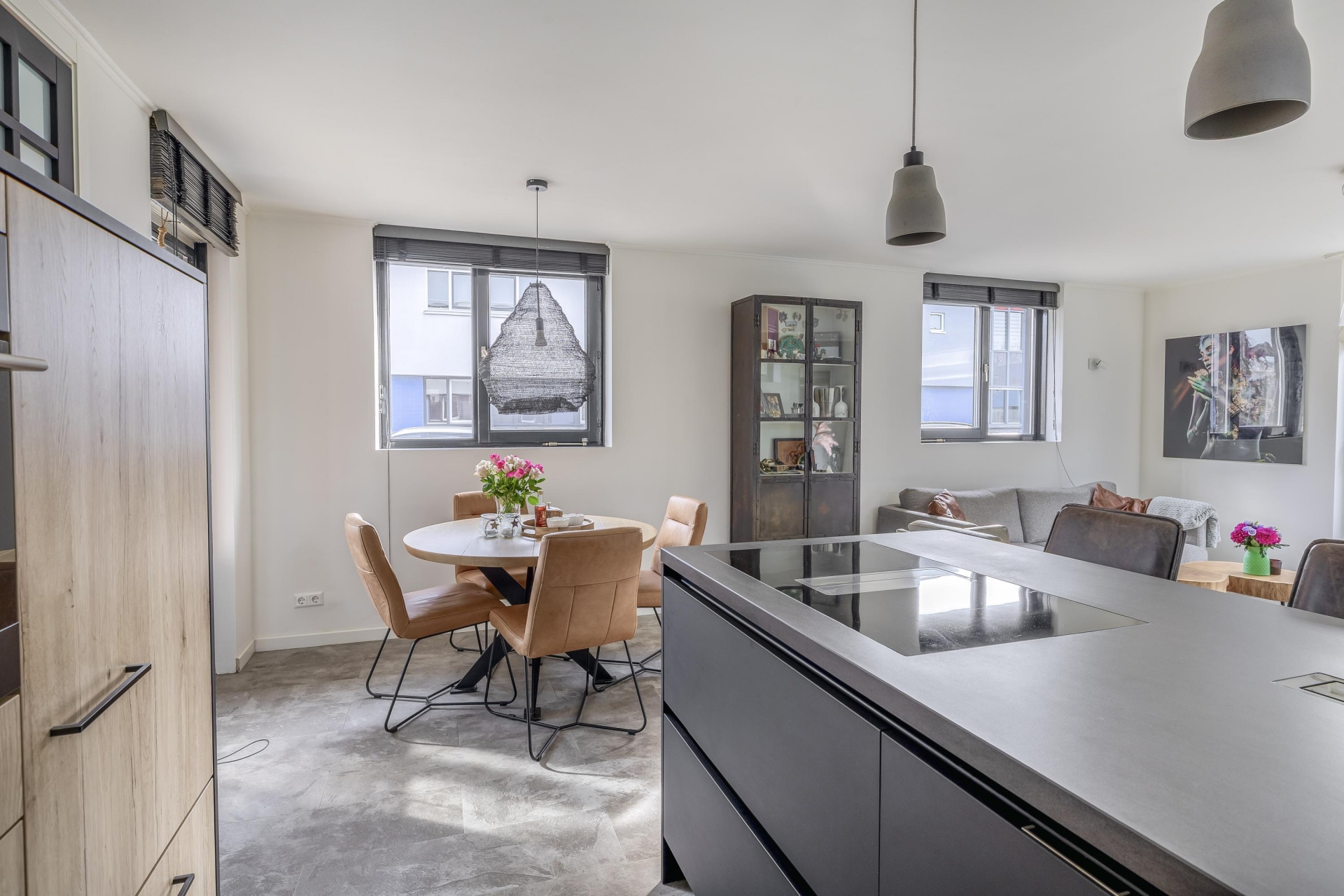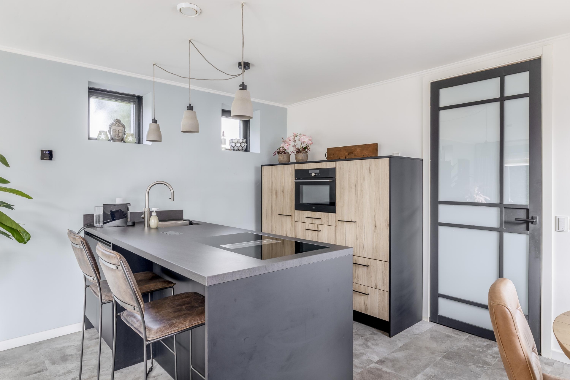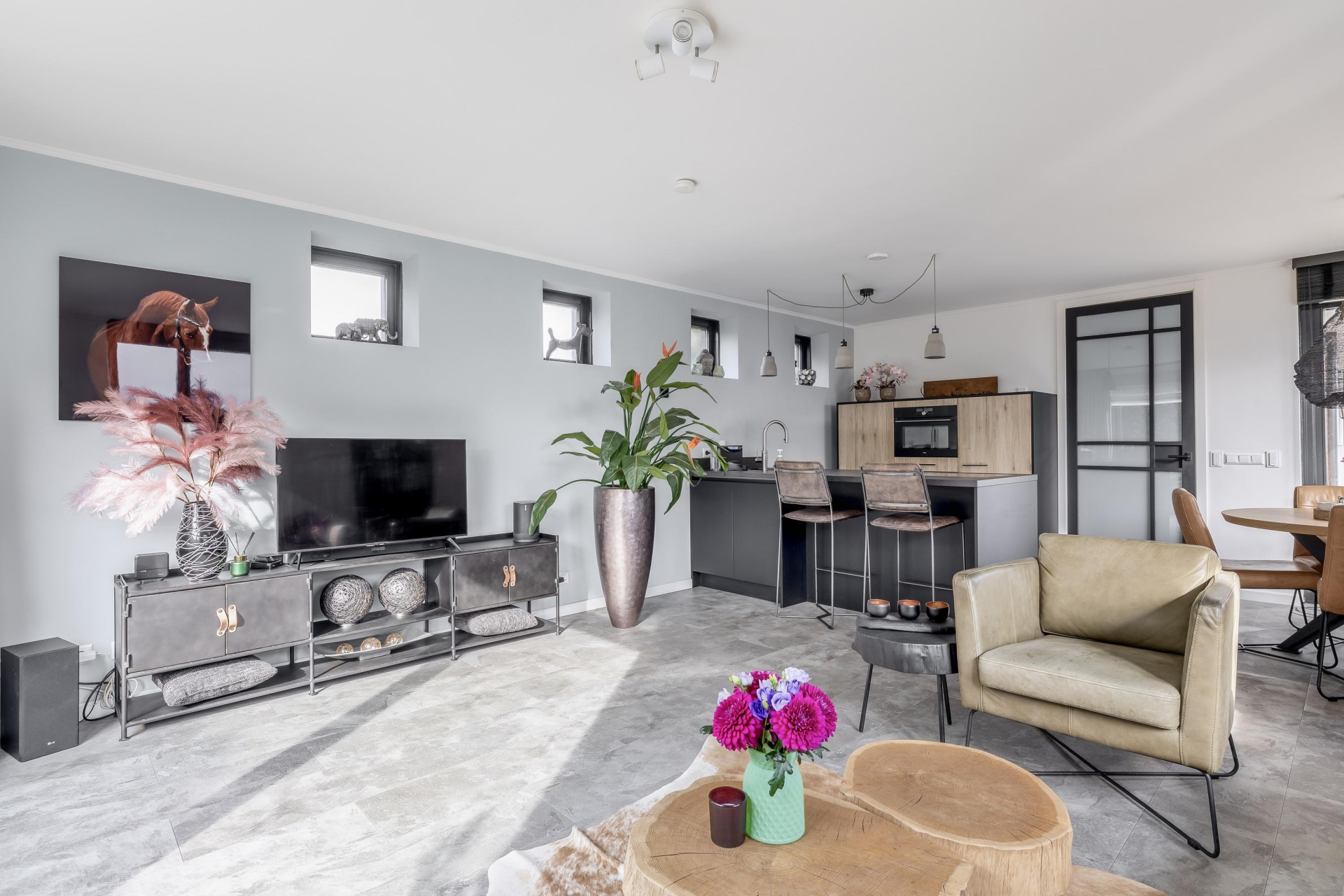 De sfeervolle living (33m²) is opgedeeld in een open keuken, eethoek en een gezellige, tuingerichte zithoek.