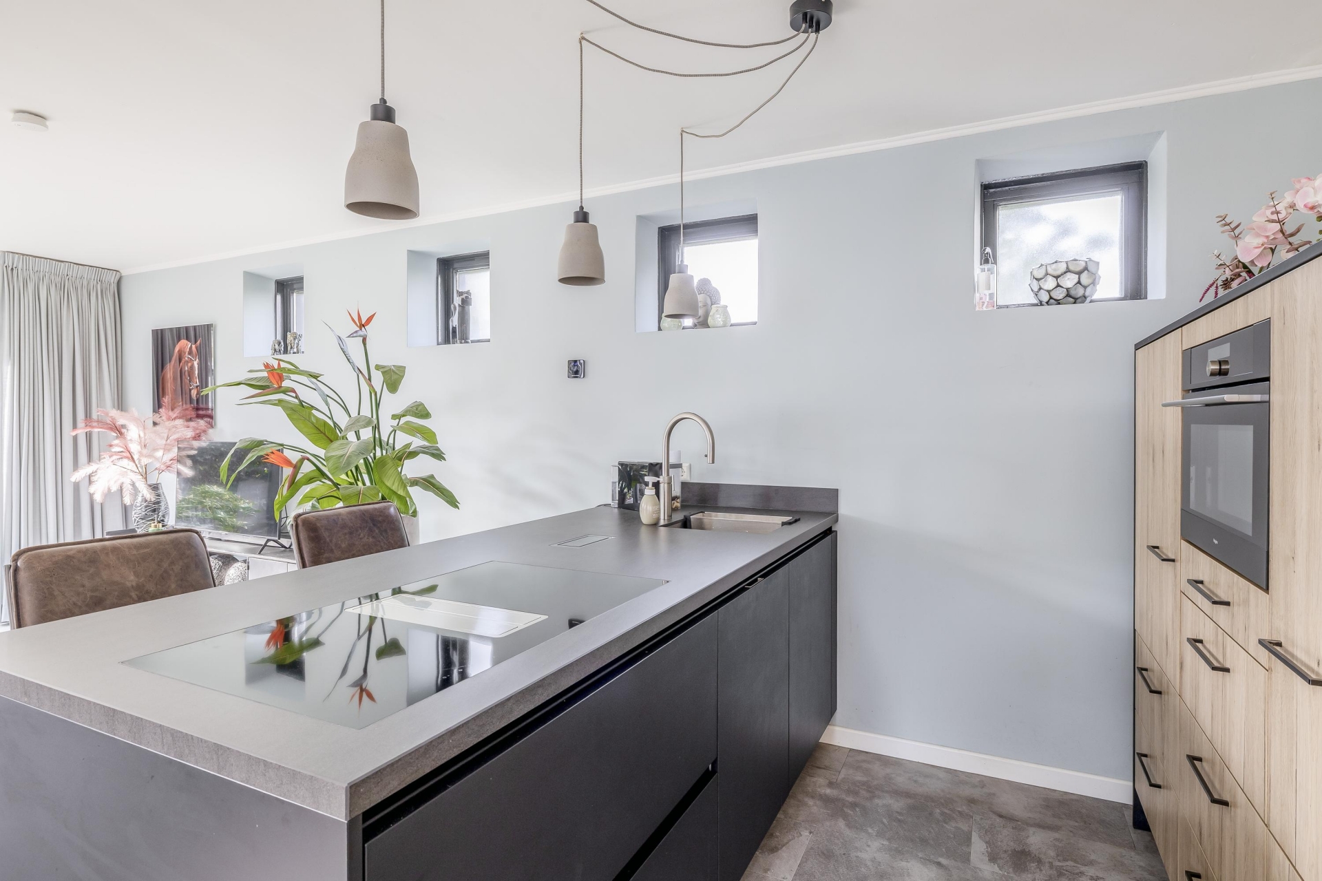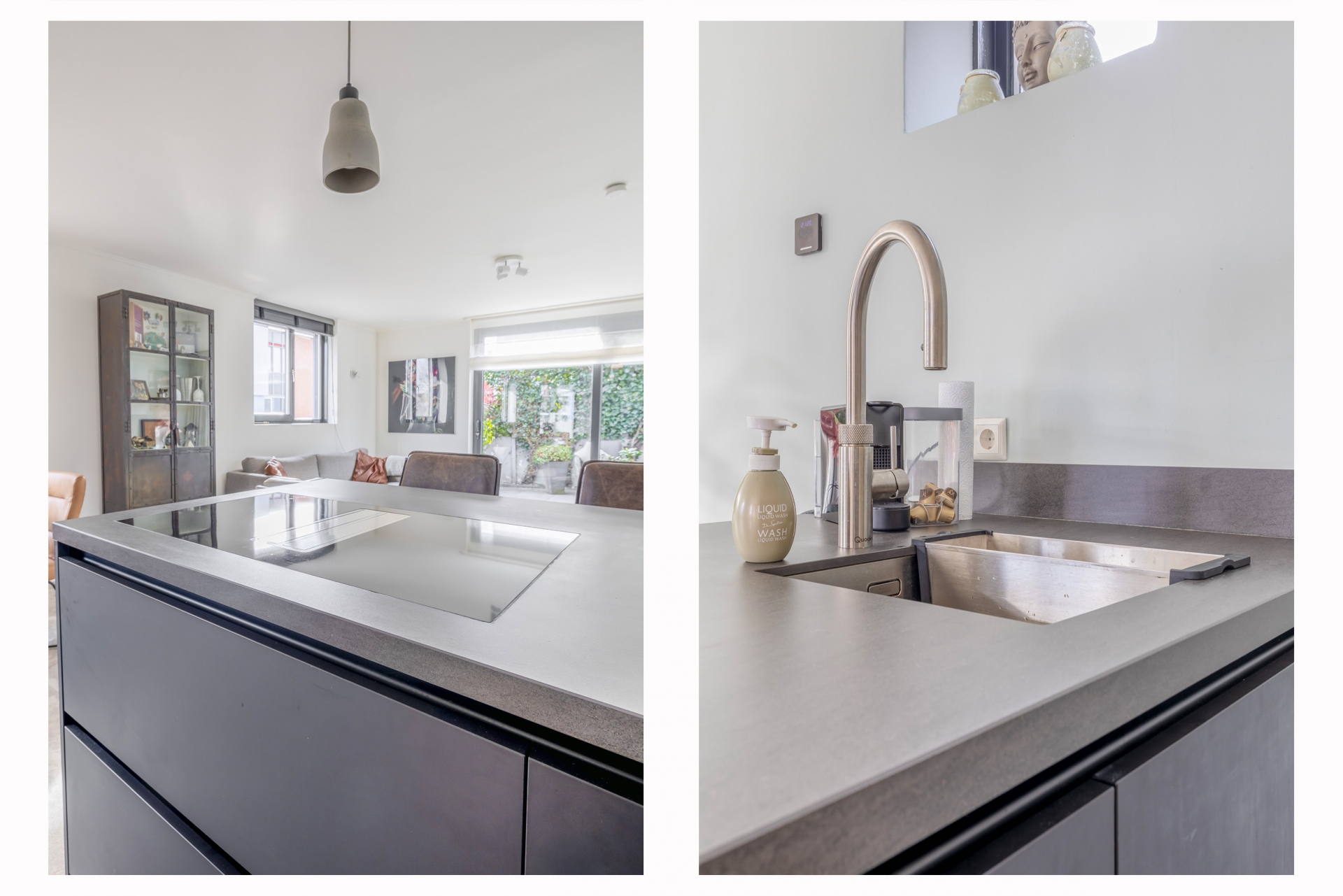 Zo beschikt u in deze keuken over een spoelbak met Quooker kraan, inductiekookplaat met geïntegreerde afzuiging, combi oven, vaatwasser (2025) en koelkast.