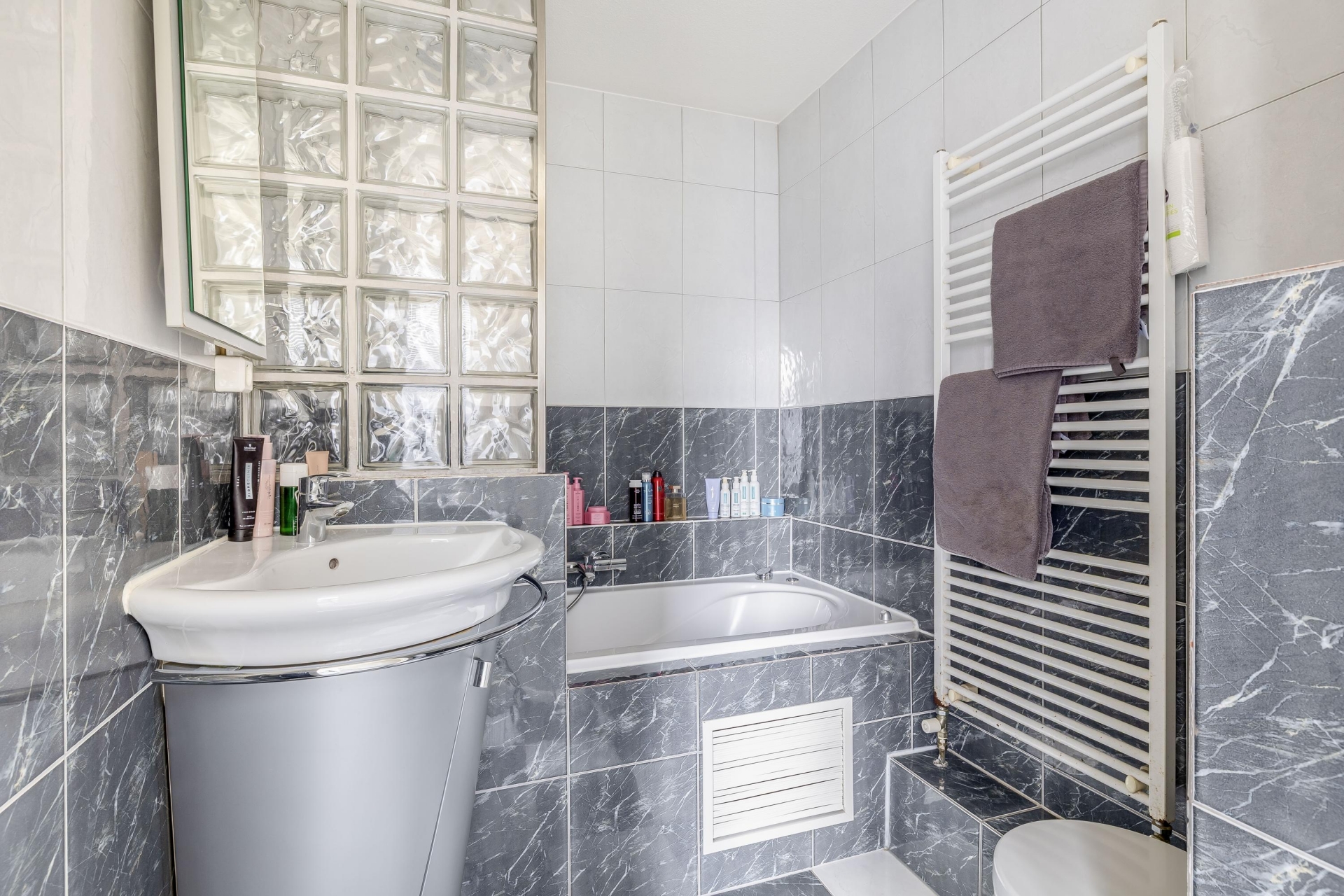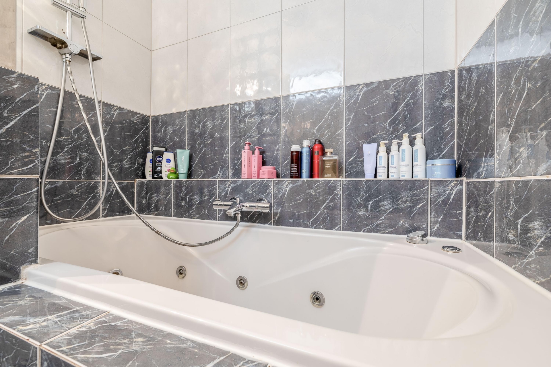 De badkamer (3.8m²) is rondom geheel betegeld en voorzien van ligbad met whirlpool en regendouche, wastafel, toilet en design radiator.