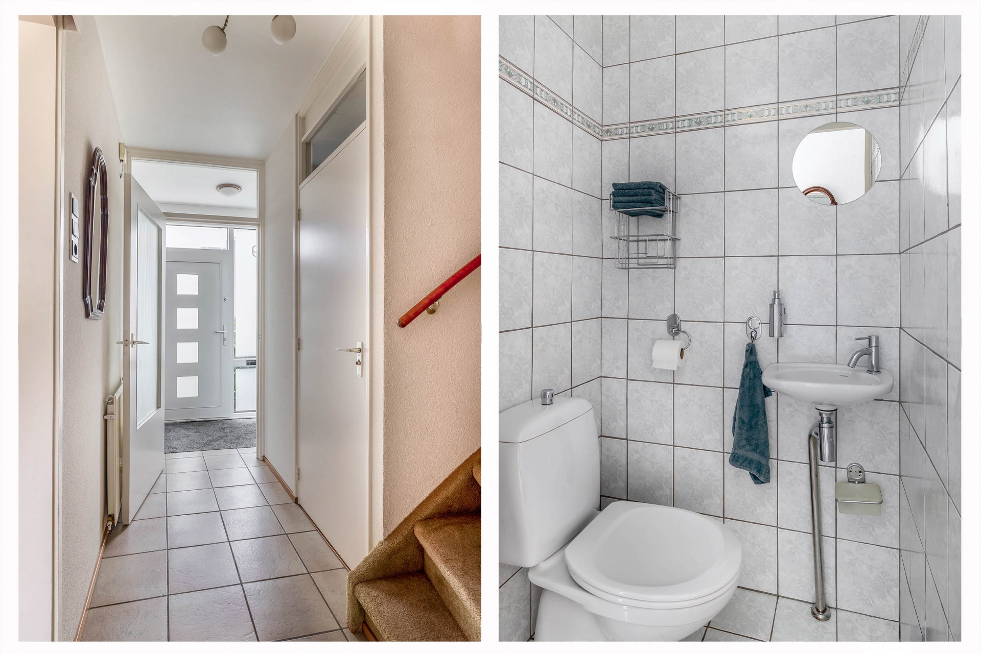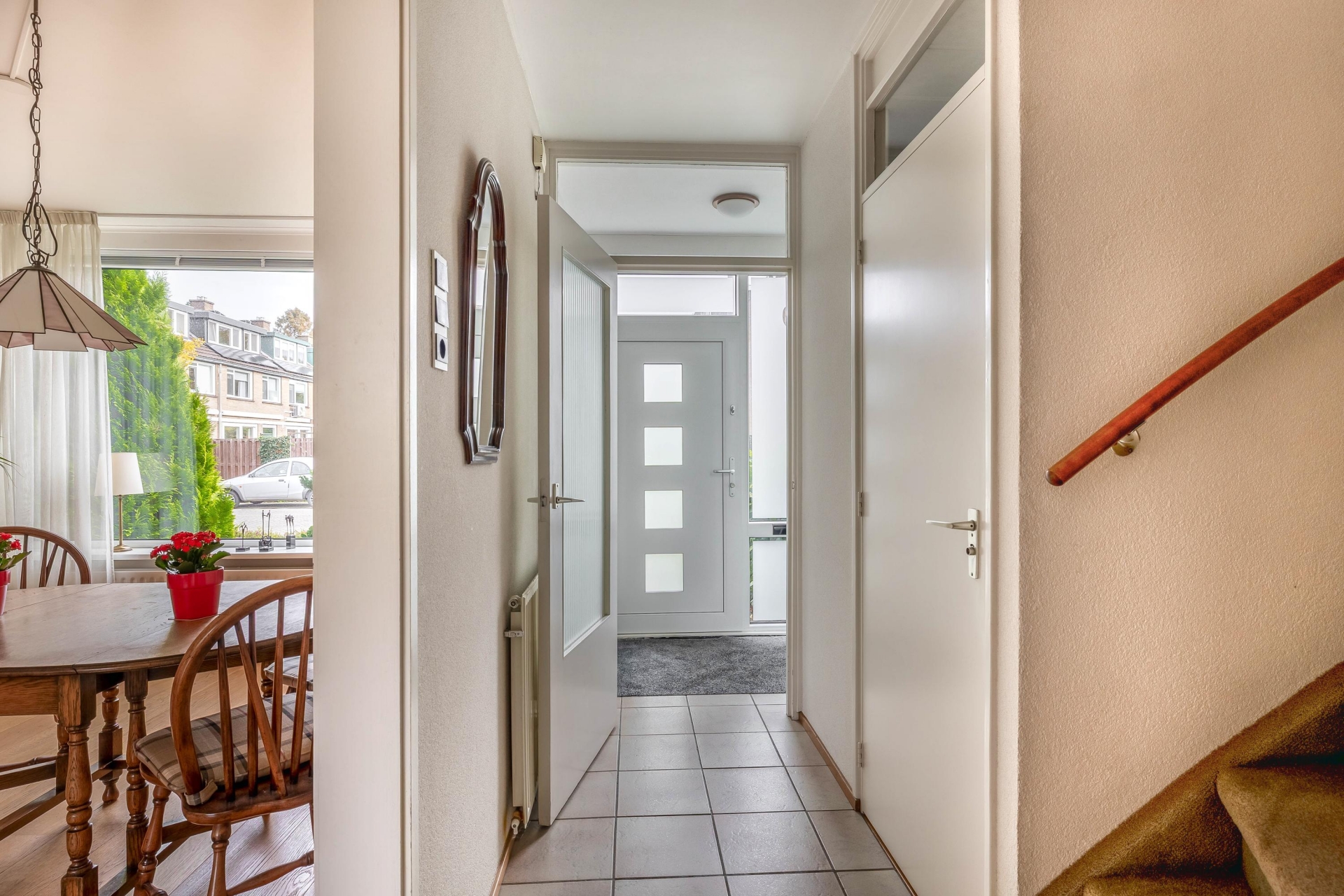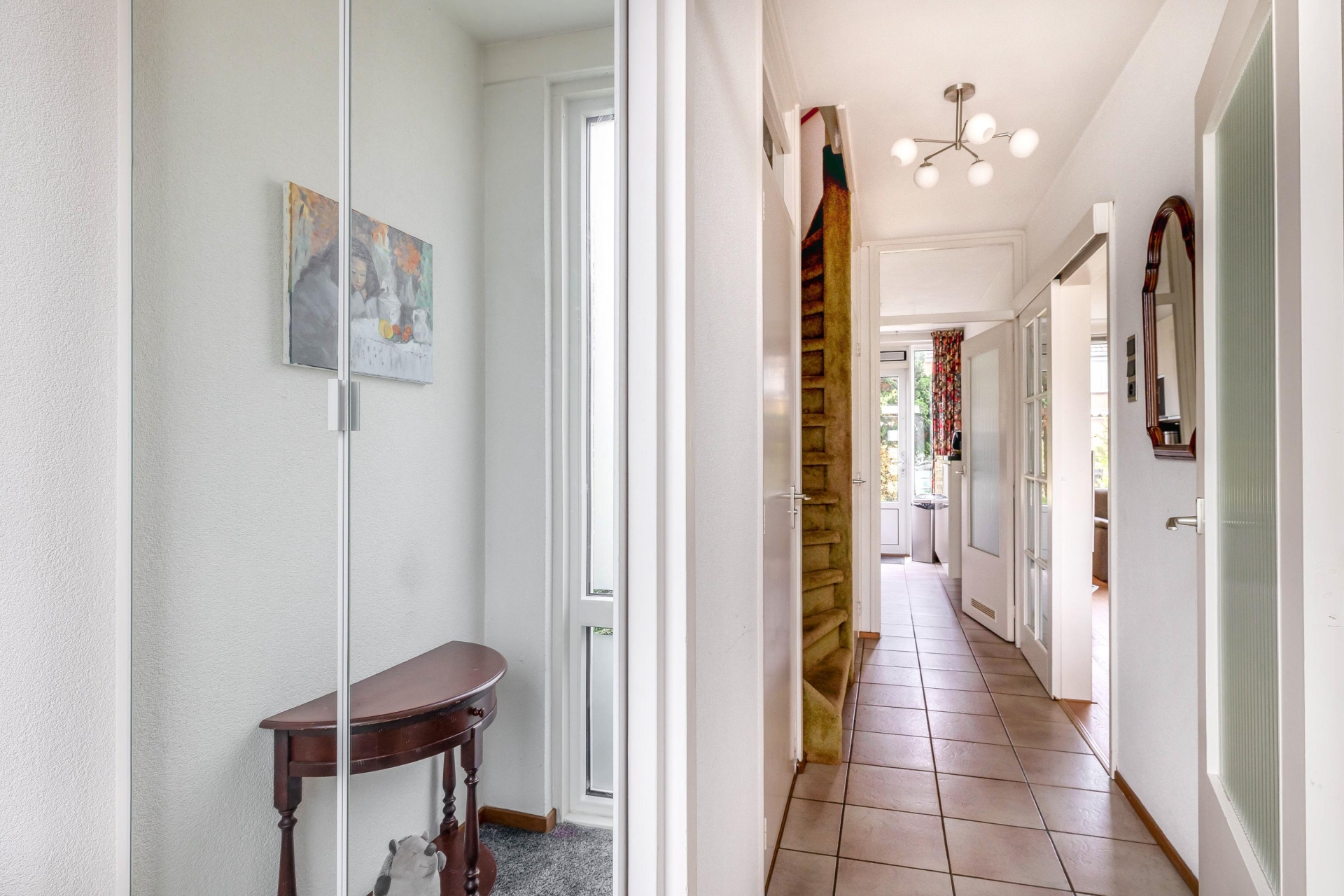 Bij binnenkomst treft u een ruime entree met toegang tot de gang die aansluit op alle vertrekken. Het toilet met fonteintje is fraai ingericht. Onder de trap bevindt zich een bergkast. Vanuit de hal bereikt u de royale woonkamer. Dankzij de grote raampartijen geniet deze ruimte van veel natuurlijk licht en een zonnige uitstraling.