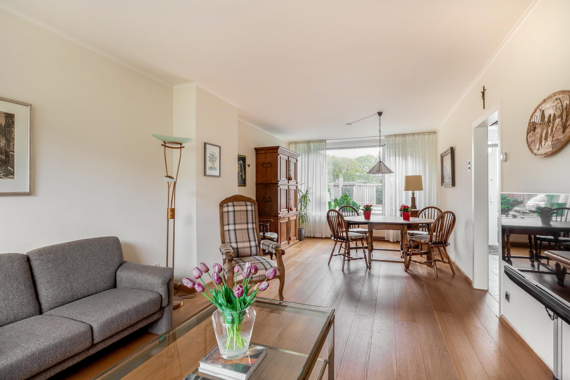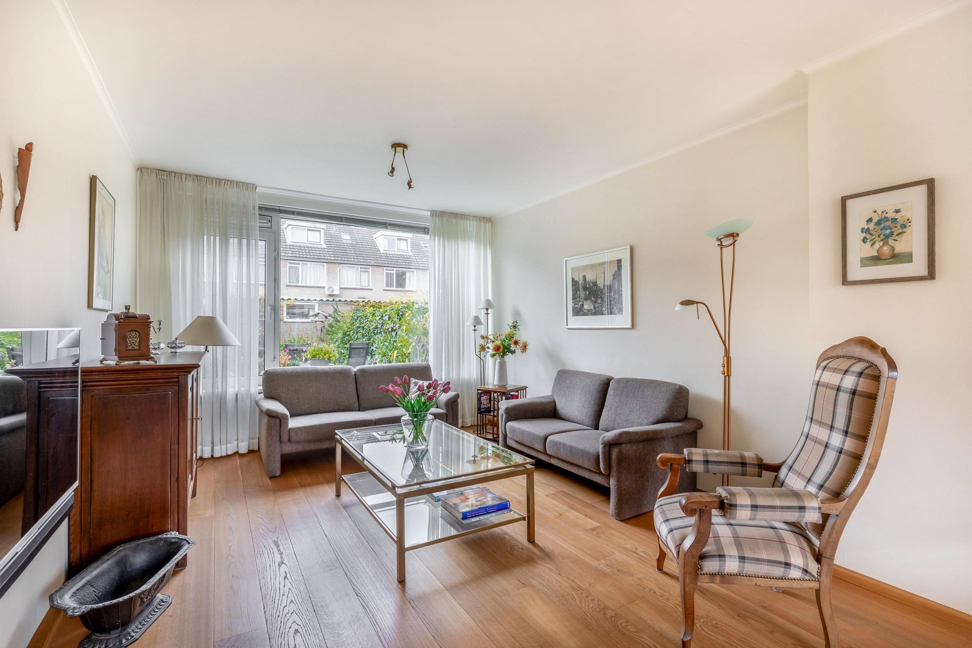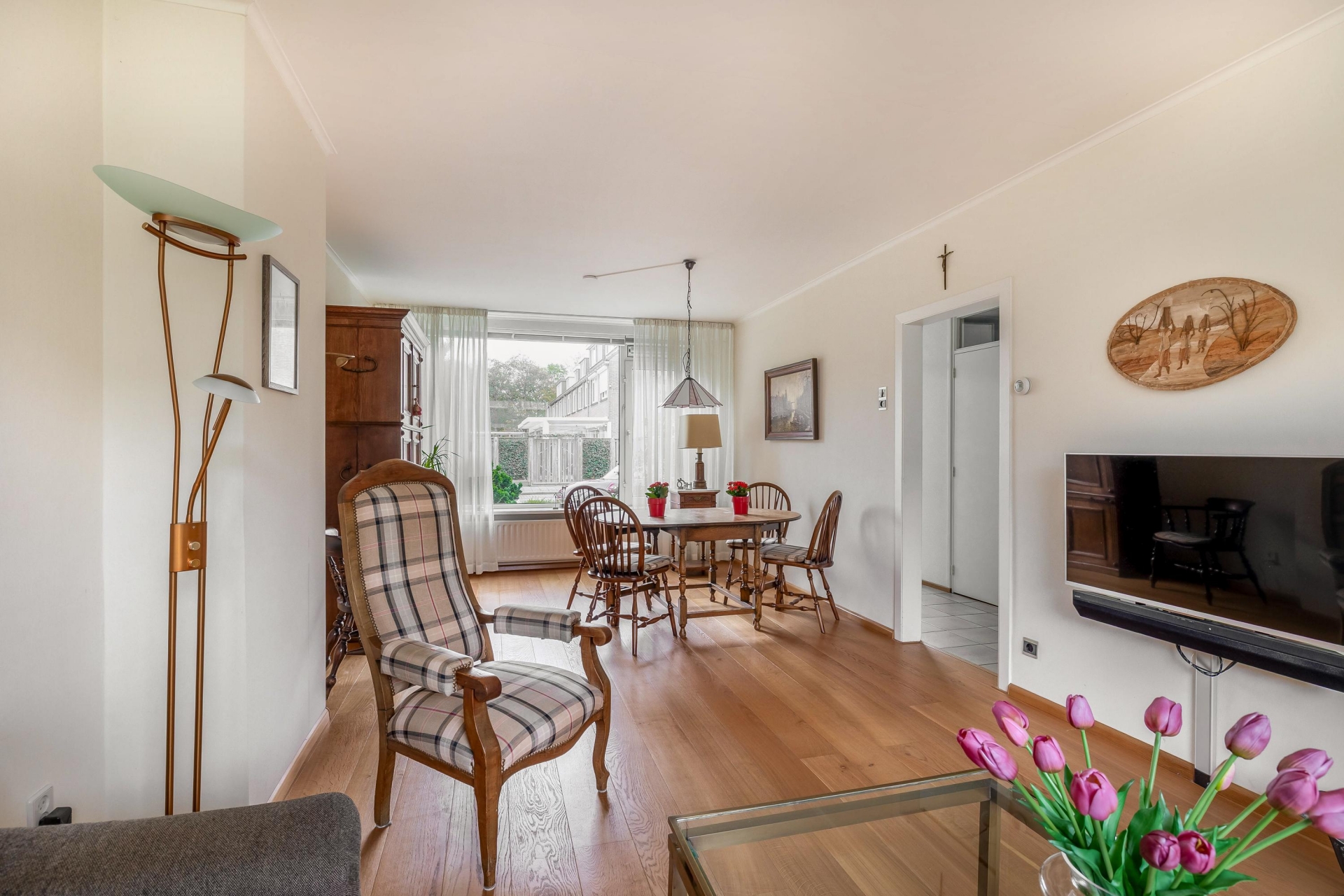 Bij binnenkomst treft u een ruime entree met toegang tot de gang die aansluit op alle vertrekken. Het toilet met fonteintje is fraai ingericht. Onder de trap bevindt zich een bergkast. Vanuit de hal bereikt u de royale woonkamer. Dankzij de grote raampartijen geniet deze ruimte van veel natuurlijk licht en een zonnige uitstraling.