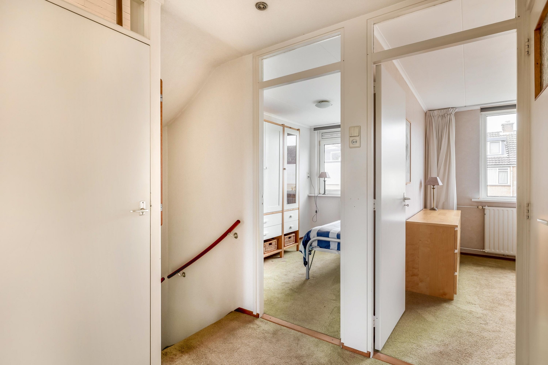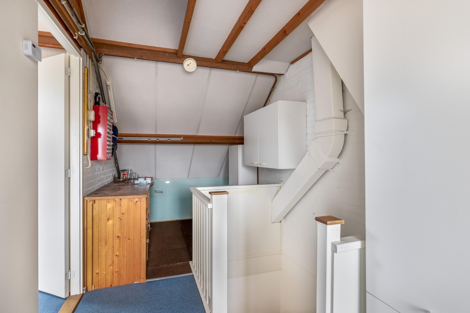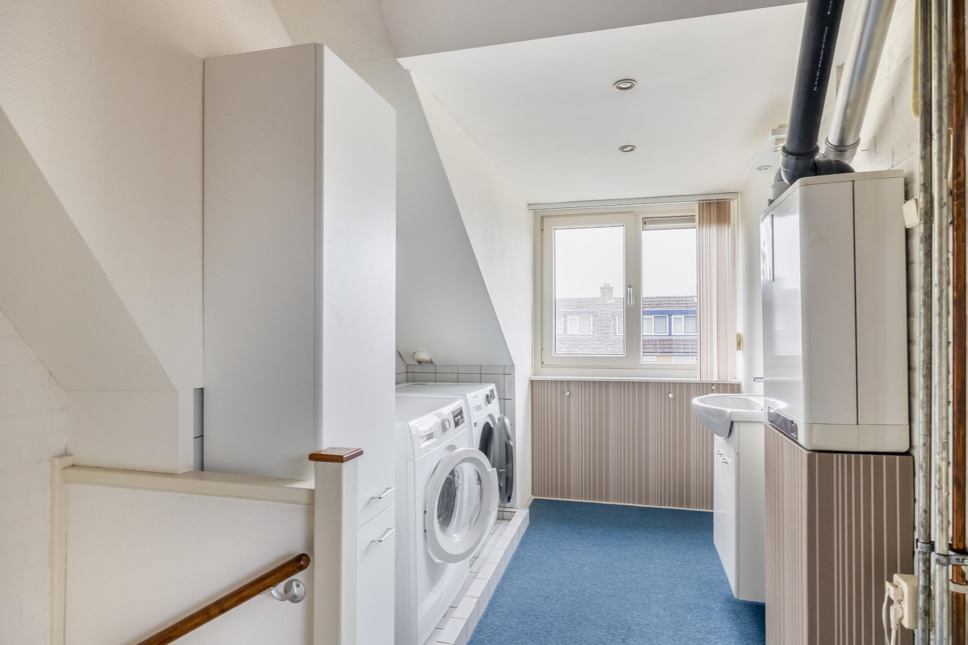 De tweede verdieping met vaste trap naar de zolder is praktisch ingericht. De overloop is ruim opgezet en hier bevinden zich de cv-ketel (2008), een volledig betegelde lekbak voor wasmachine en droger, badkamermeubel en vliering voor extra bergruimte.