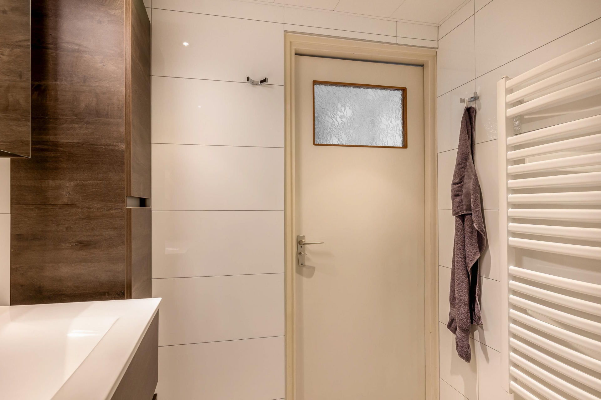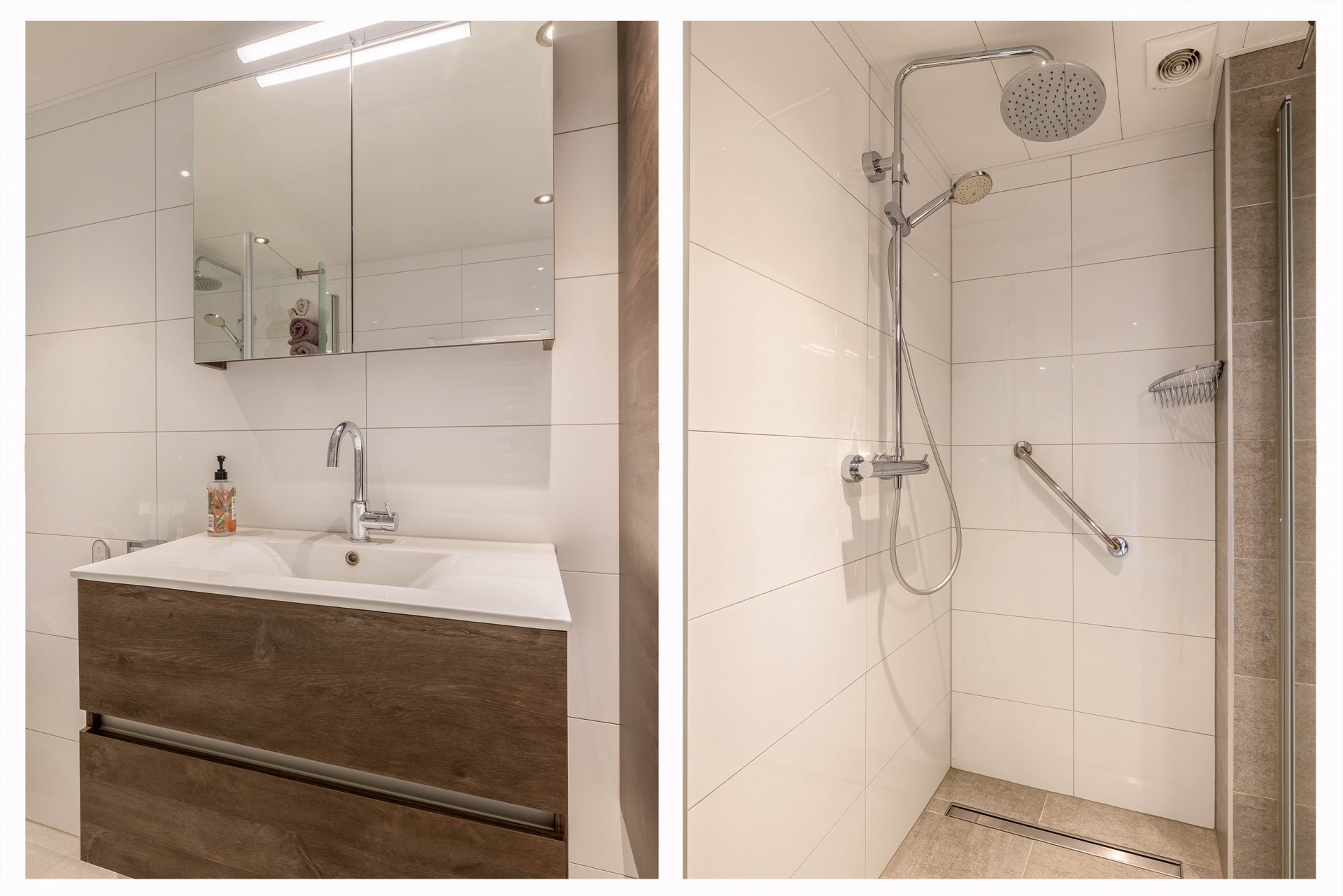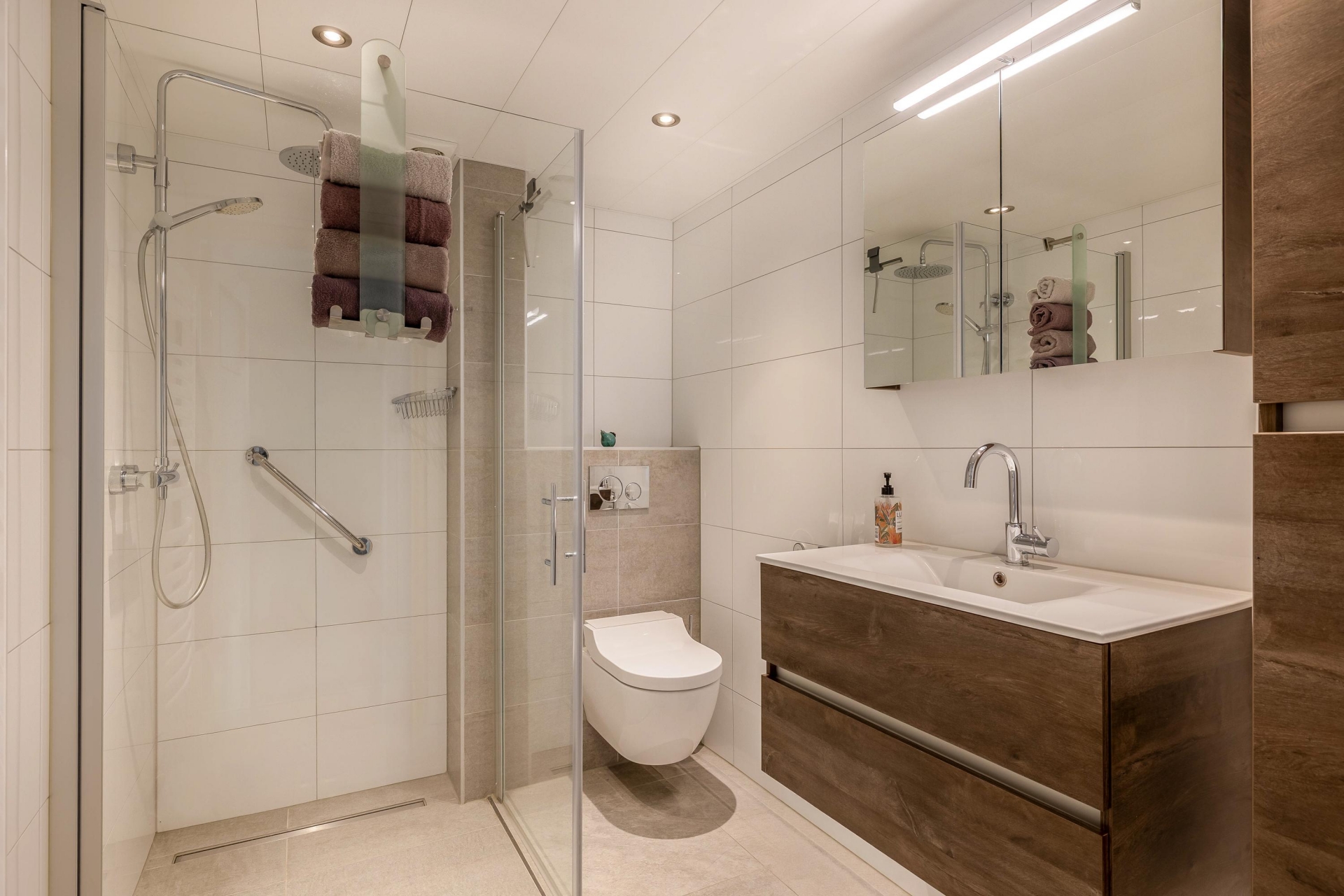 De moderne badkamer is volledig betegeld en uitgerust met een inloopdouche, toilet en badkamermeubel met wastafel.
