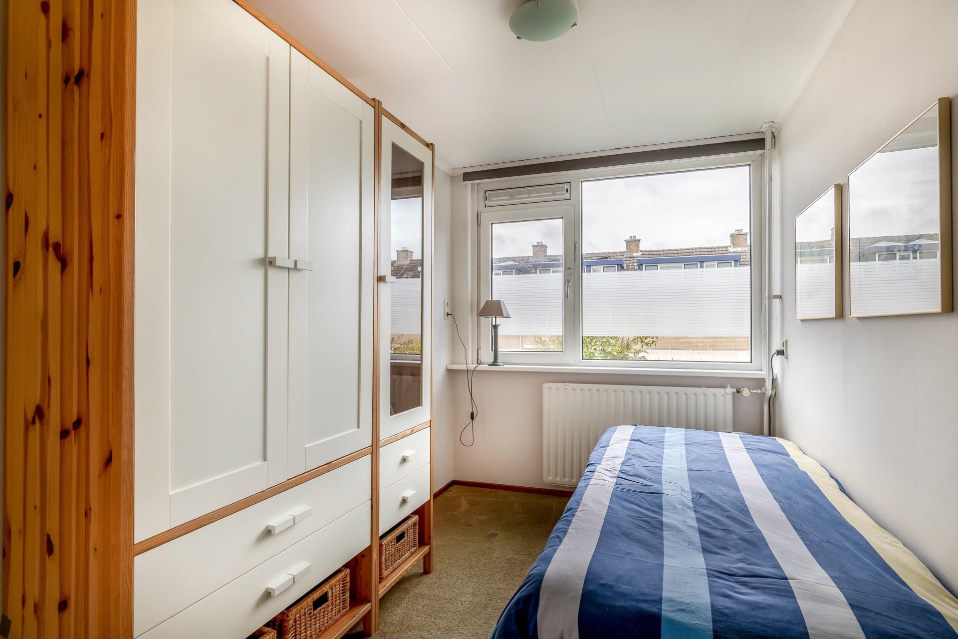 Op de eerste verdieping bevinden zich vier slaapkamers en een badkamer. De slaapkamers aan de achterzijde hebben een oppervlakte van circa 11 en 7 m². Aan de voorzijde bevinden zich twee vergelijkbare kamers van circa 10 en 6 m², waarvan de kleinste in gebruik is als kastenkamer.