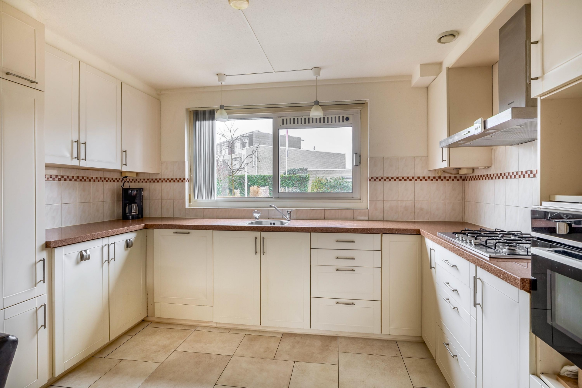 Entree van de woning met ruime hal, meterkast en toilet met fonteintje. De lichte woonkamer is voorzien van een open keuken aan de voorzijde, uitgerust met diverse inbouwapparatuur, waaronder een koelkast, vriezer, Combi-magnetron, vaatwasser en 5-pits kookplaat.