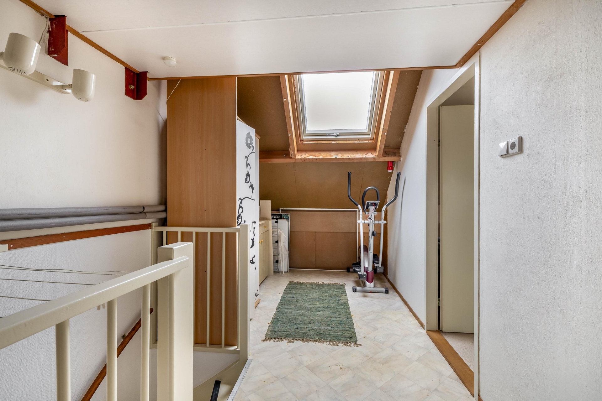 Overloop met opstelplaats voor wasmachine en droger, mechanische ventilatie en de cv-combiketel. Grote vierde slaapkamer voorzien van een dakraam en extra bergruimte achter de knieschotten.