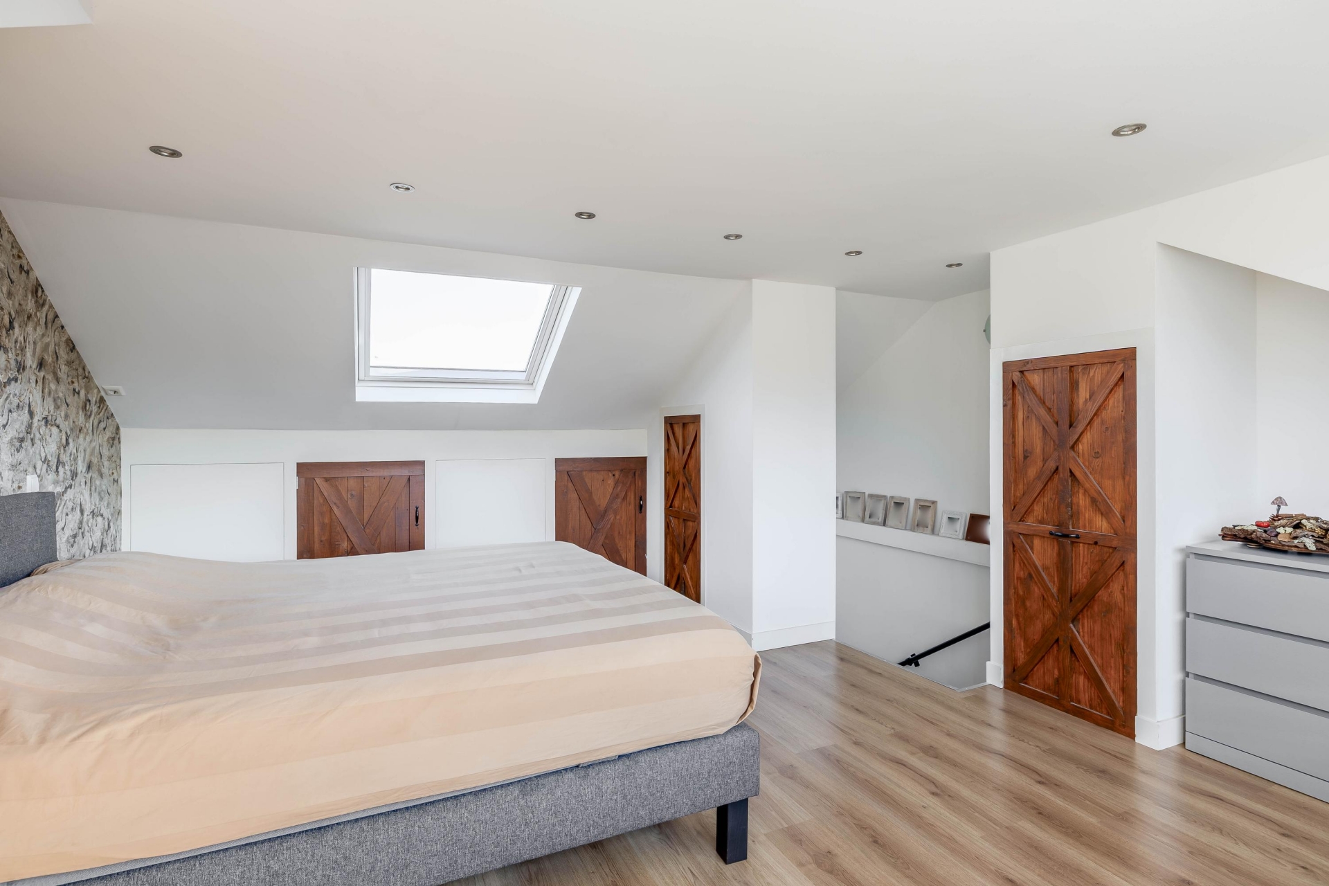De tweede verdieping, voorzien van dakkapel en de nodige opbergruimte, biedt nog een zeer ruime slaapkamer.