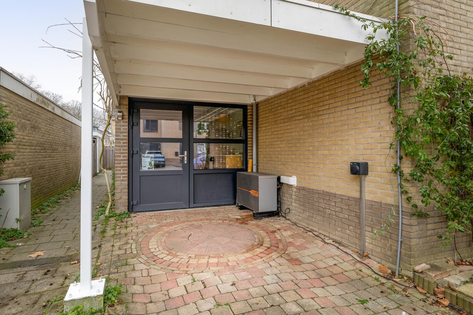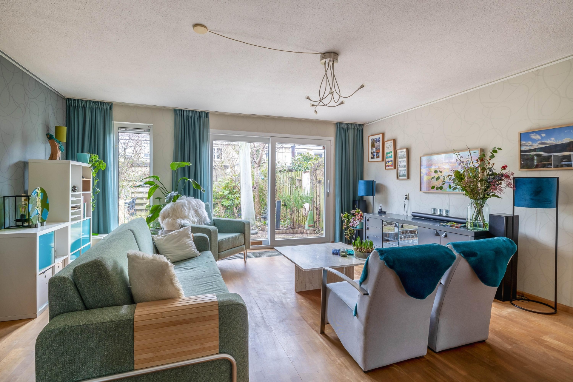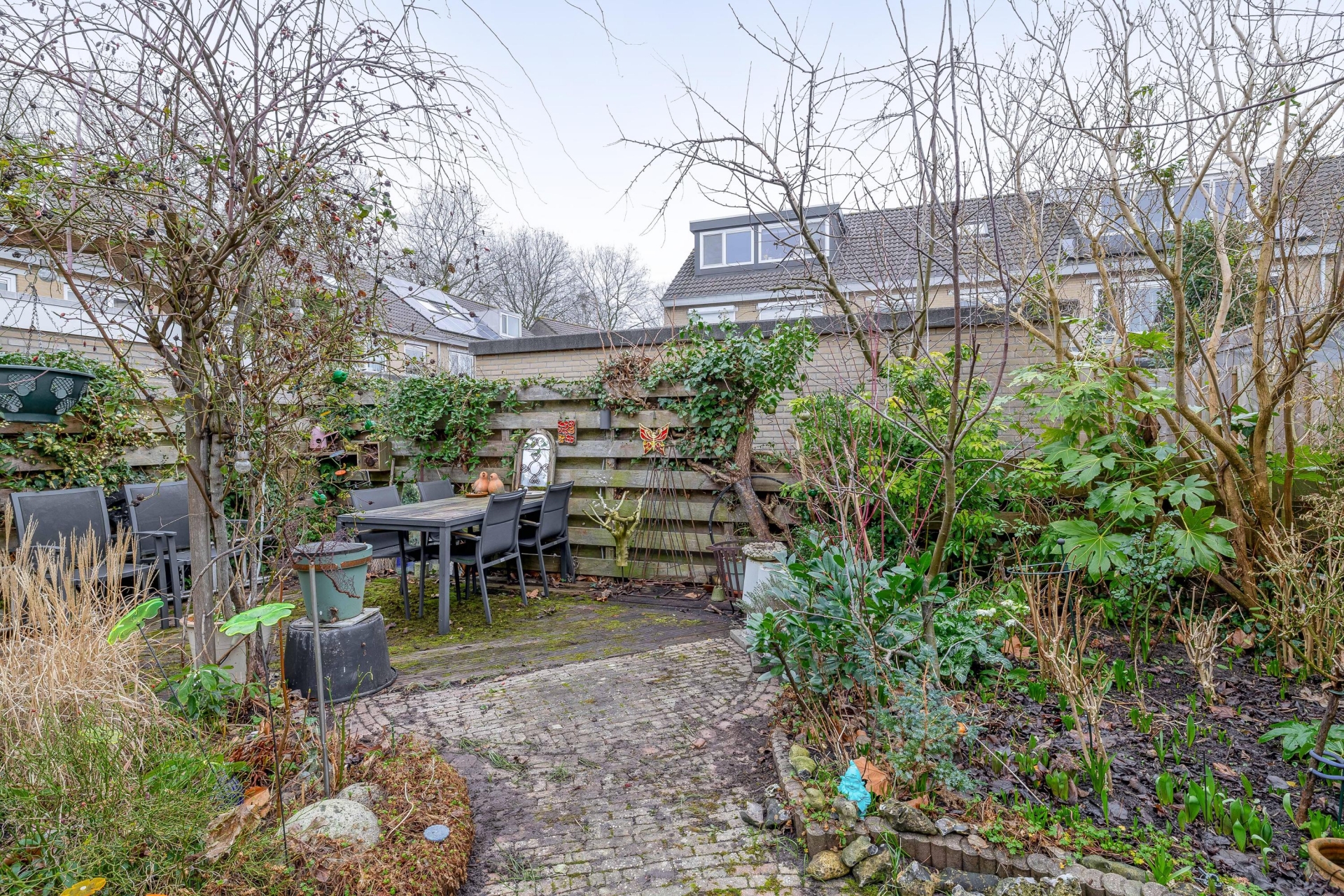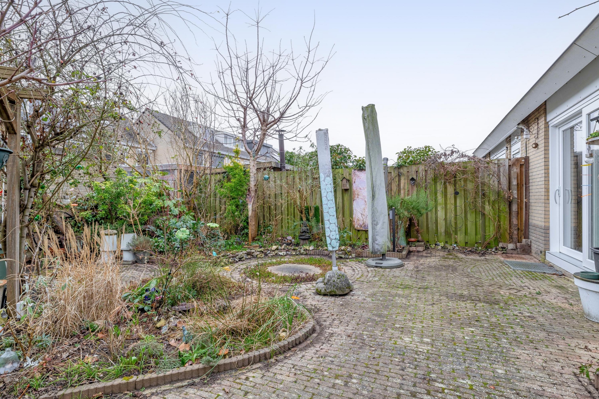 De ruime achtertuin is gunstig gelegen en biedt op ieder moment van de dag een plek in de zon of schaduw. Een heerlijke plek om te ontspannen of gezellig te tafelen. Het kunstwerk in de voortuin is ter overname