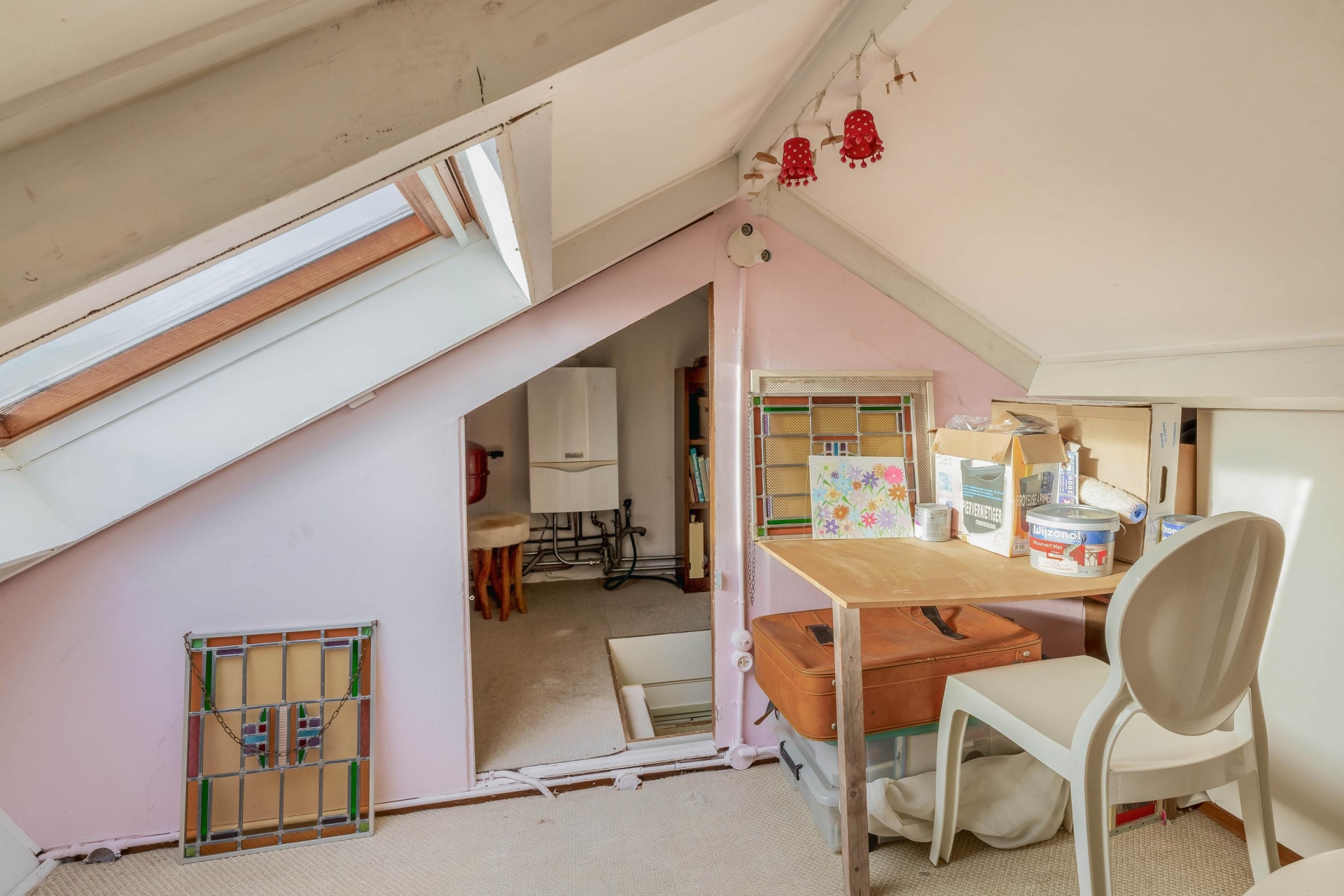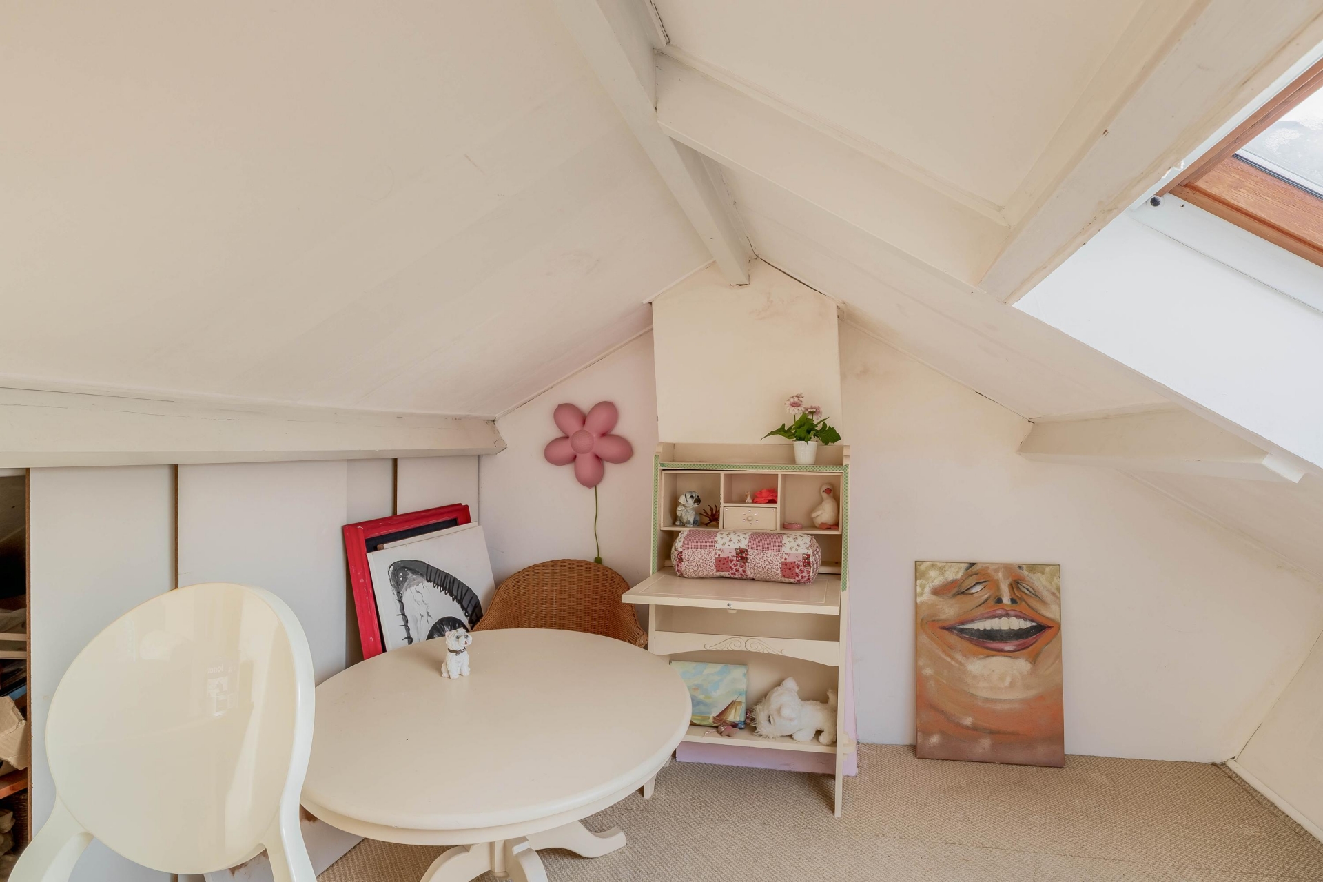 Middels de vaste trap vanuit de woonkamer is de eerste verdieping toegankelijk. Hier zijn de twee slaapkamer te vinden De slaapkamers hebben een oppervlakte van circa 10 en 14 M². Vanaf de overloop is er middels een vlizotrap de vliering te bereiken. Hier is de cv-ketel (2004) te vinden. Tevens is er ook ruimte gecreëerd voor nog een extra slaapkamer met dakraam.