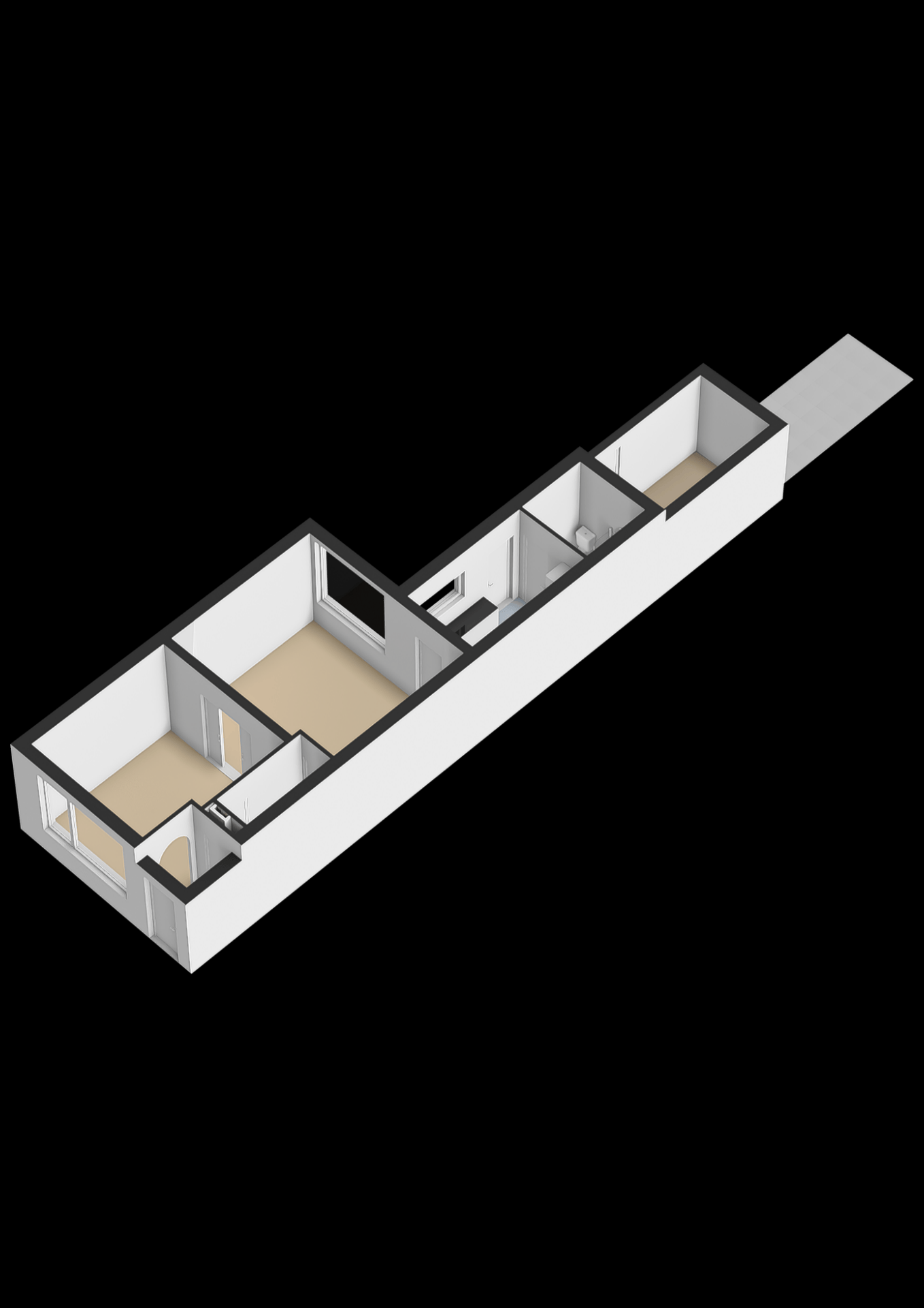 Entree, hal met toegang tot de meterkast en de woonkamer. De woonkamer en suite is opgesplitst door middel van een glas-in-lood schuifdeur. Deze splitsing zorgt ervoor dat de woonkamer en eetkamer apart is, maar makkelijk bij elkaar gevoegd kan worden door de schuifdeuren open te laten. Vanuit de woonkamer is de keuken toegankelijk. De dichte keuken is voorzien van diverse inbouwapparatuur zoals 4-pitsgas toestel, oven en koel-vriescombinatie. Vanuit de keuken is de badkamer toegankelijk. De badkamer is voorzien van douche, toilet en wastafelmeubel.