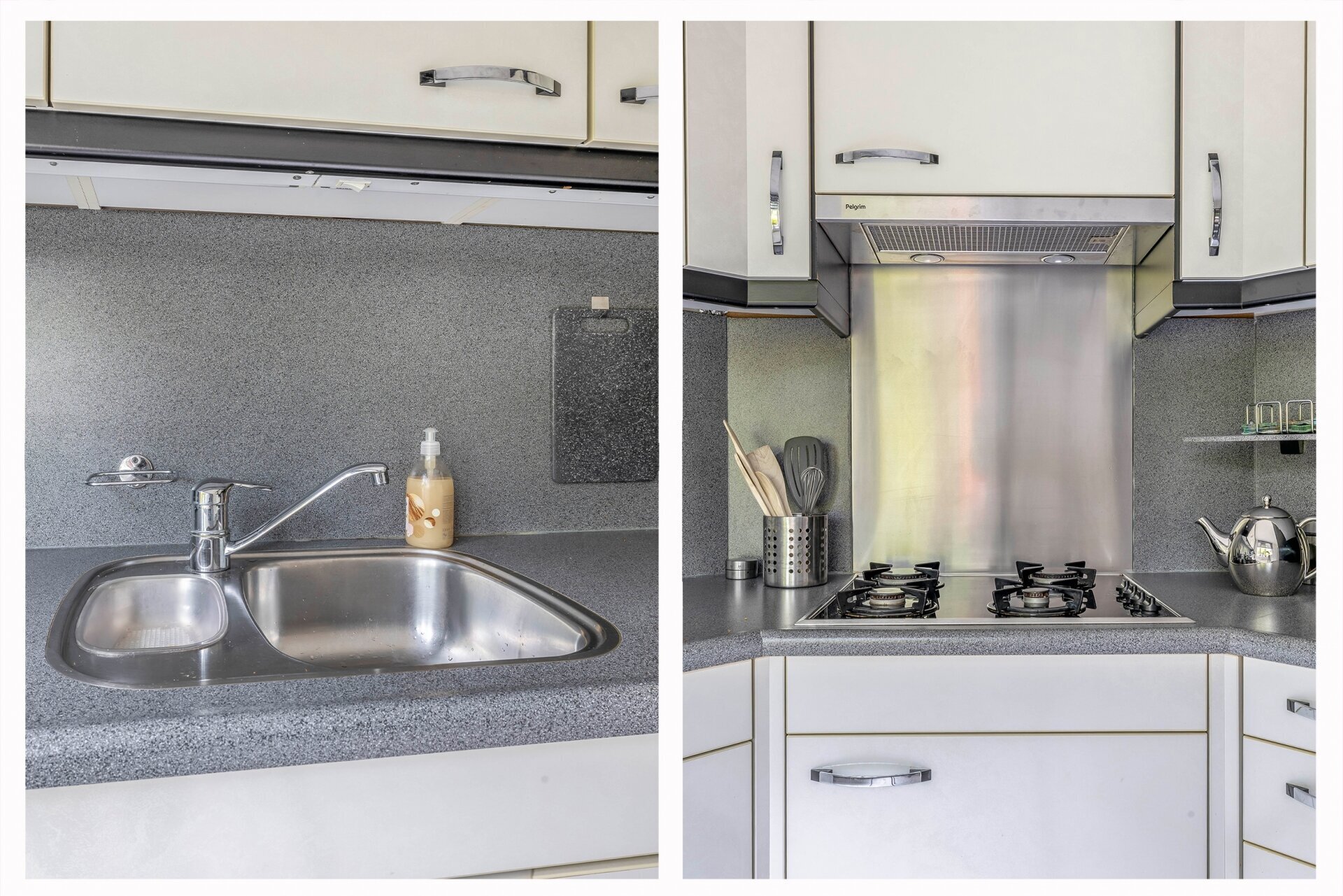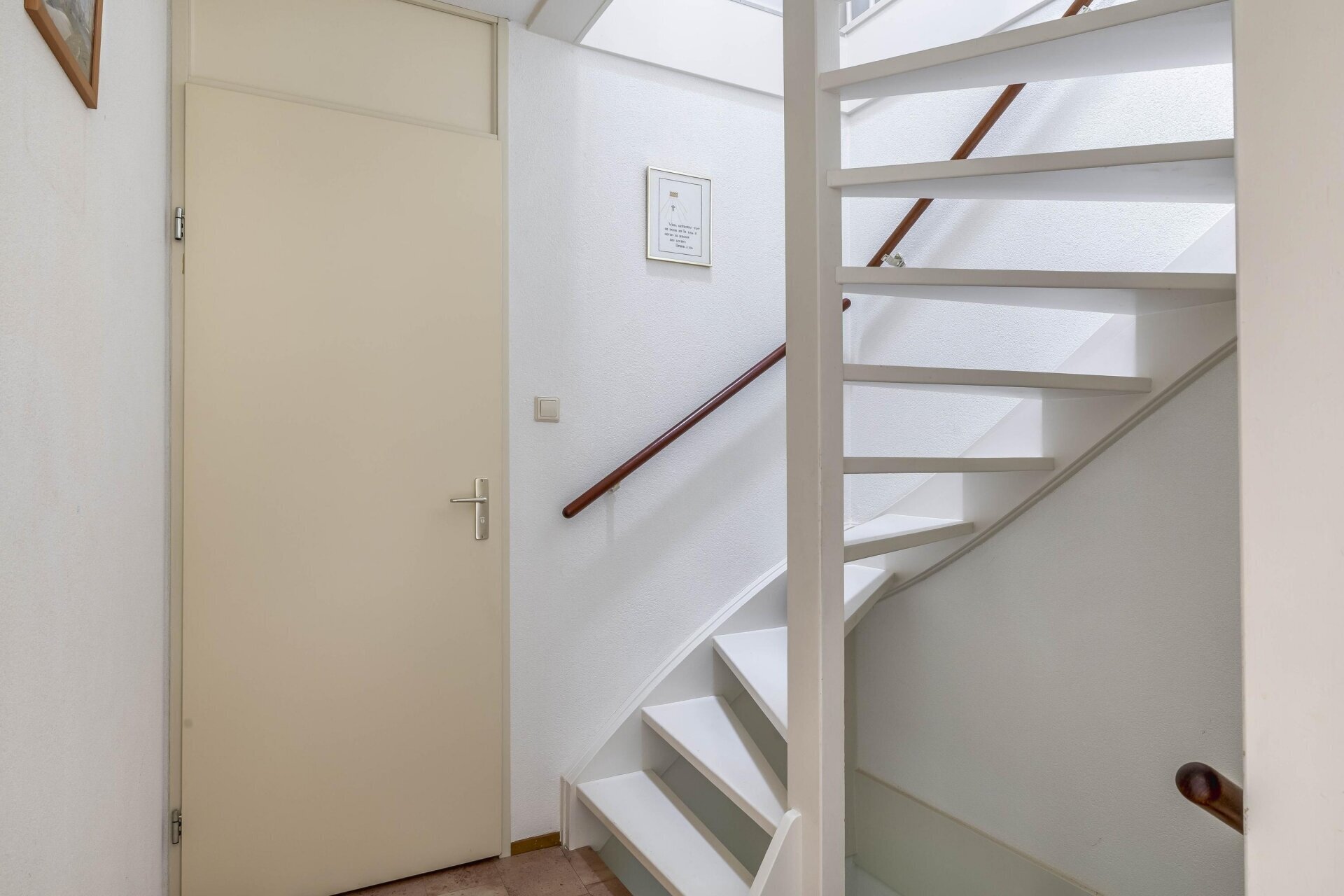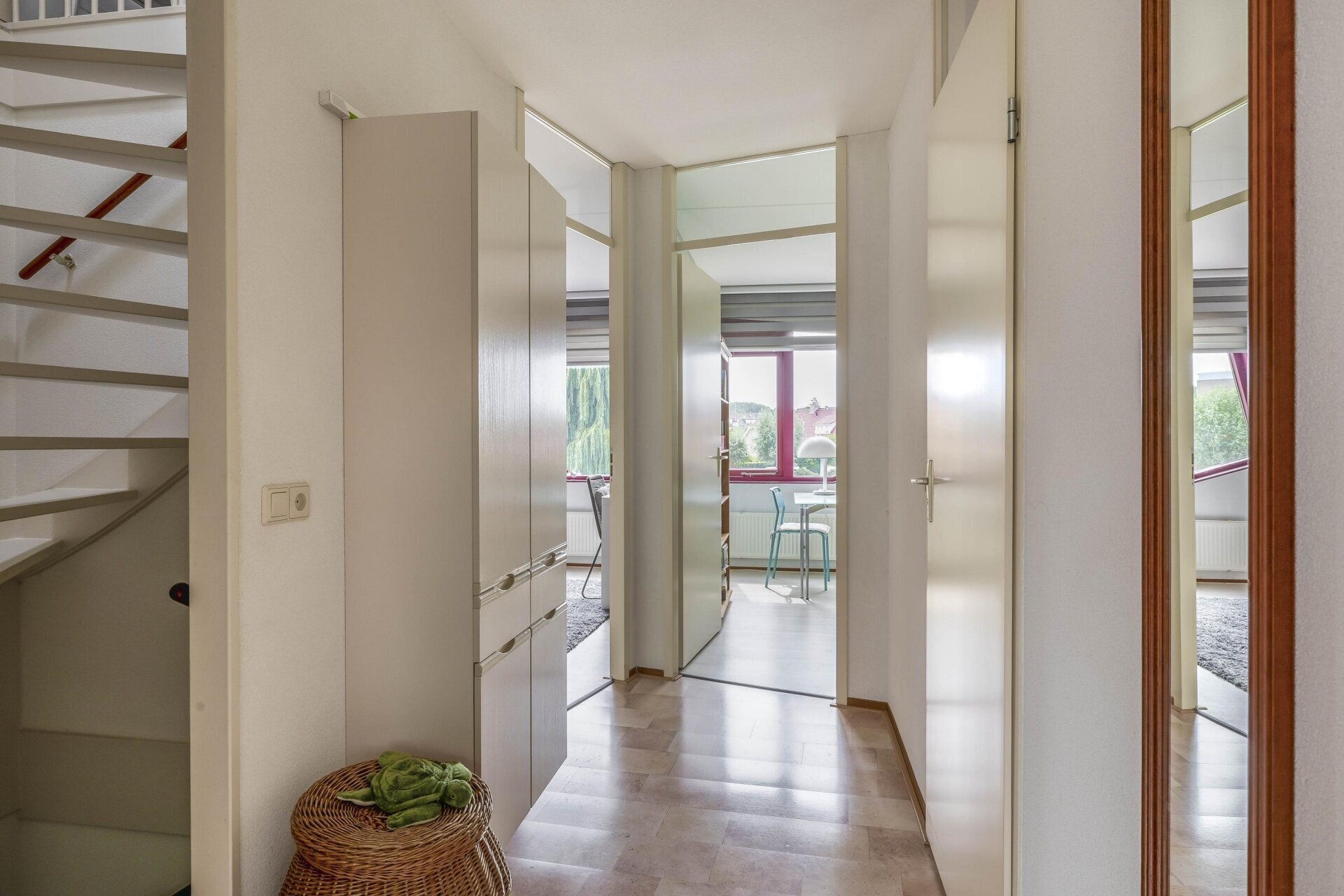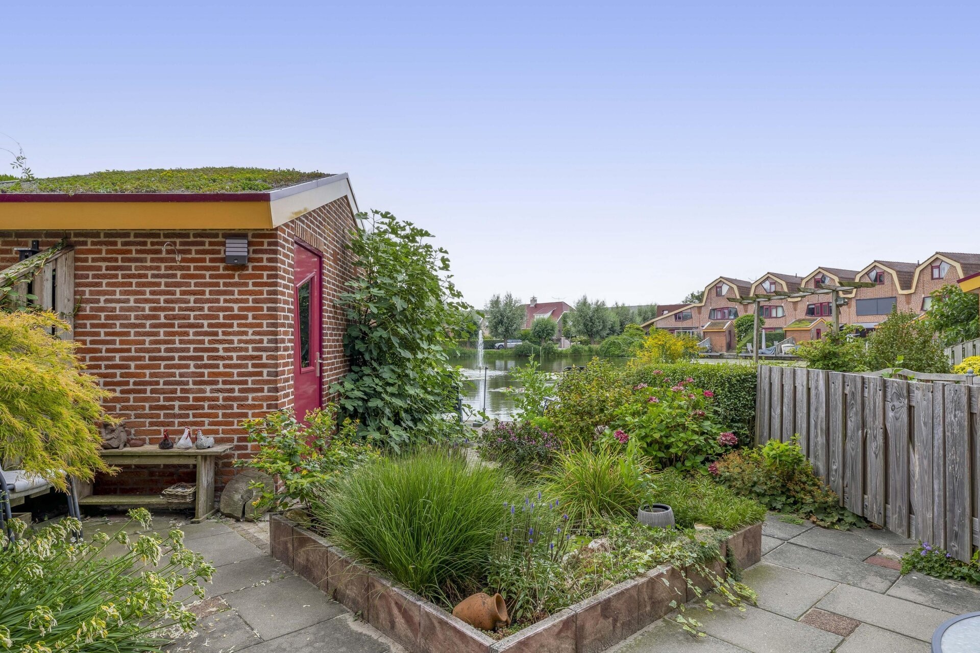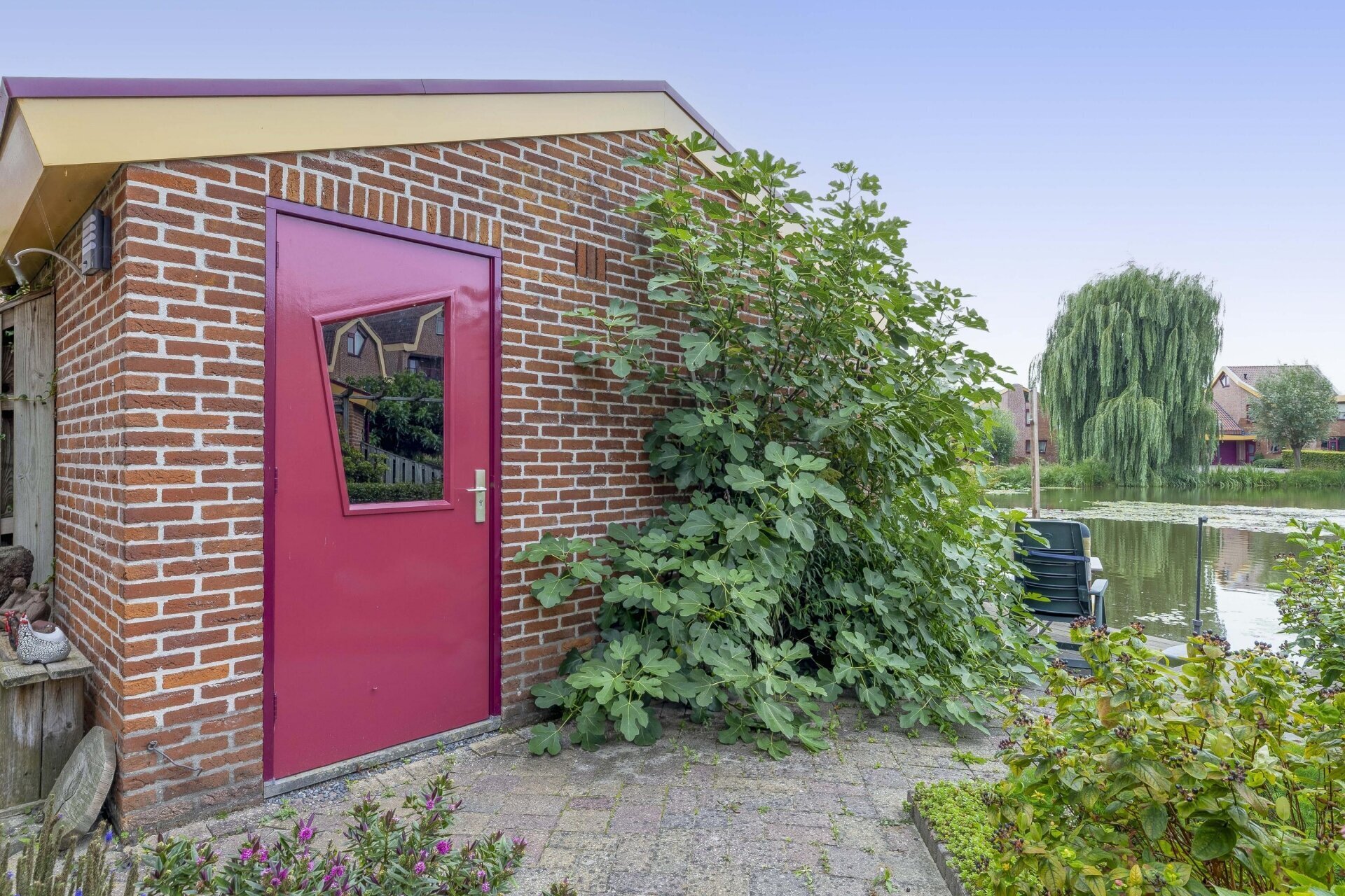 Via de ruime hal met modern toilet en trapopgang bereik je zowel de inpandige berging als de lichte woonkamer. Aan de voorzijde bevindt zich de strakke keuken, voorzien van diverse inbouwapparatuur. De tuingerichte woonkamer beschikt over openslaande deuren naar de zonnige achtertuin, direct aan het water gelegen. Dankzij de hoekligging is er een extra zijingang aanwezig. Achterin de tuin staat een vrijstaande, stenen berging.